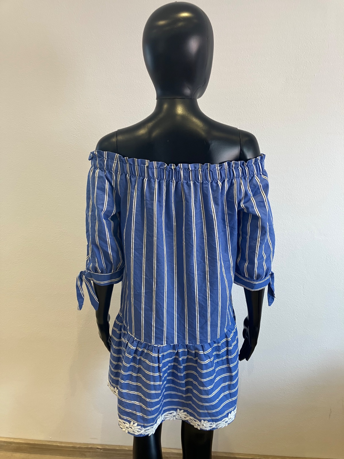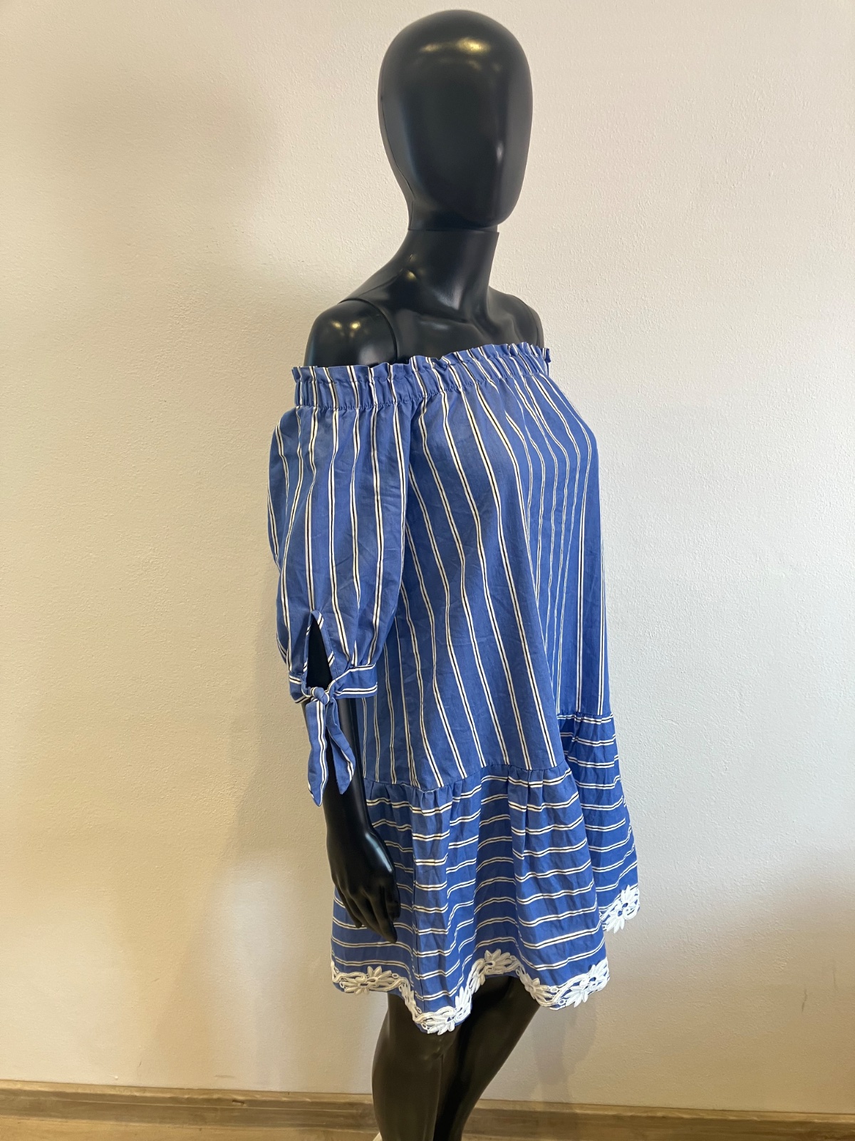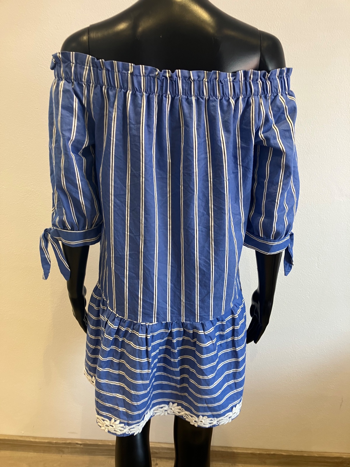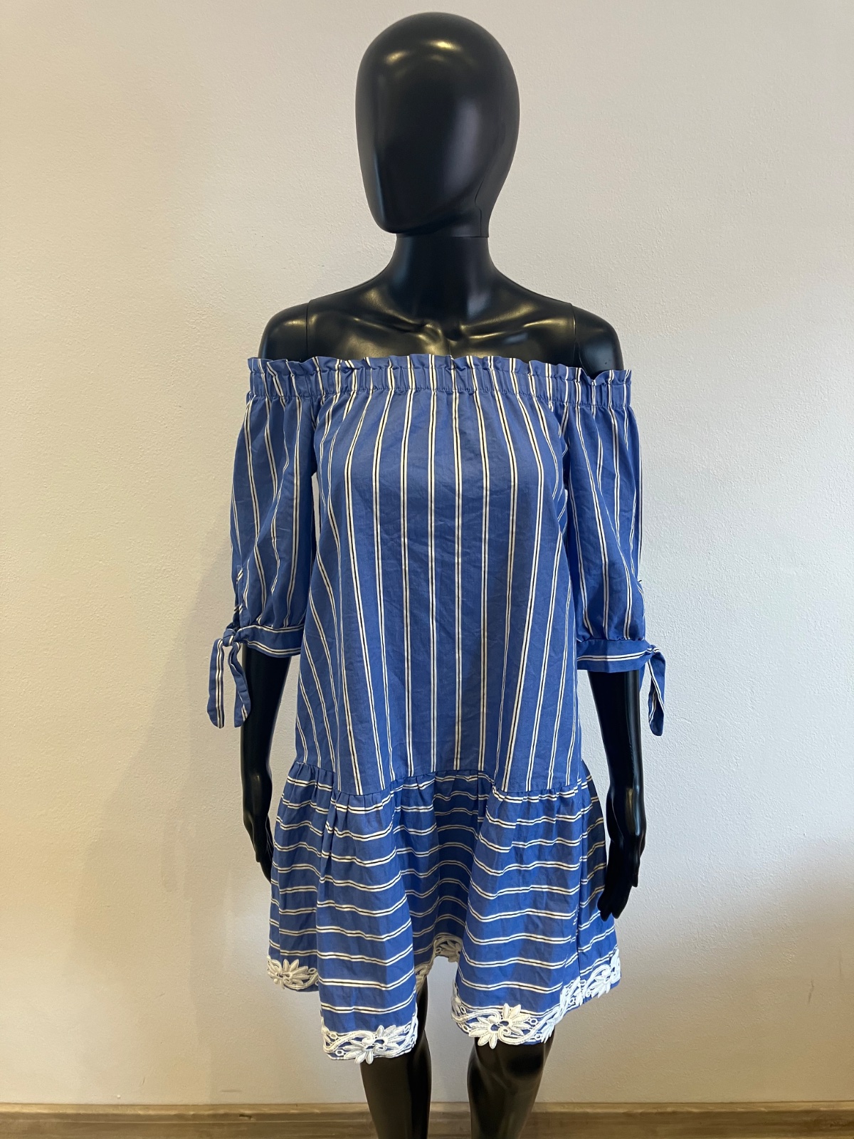 Dámske košeľové šaty s krátkym rukávom, volánom a krajkou na spodku, s odhalenými ramenami, jemne elastické, farba modro bielo čierna,