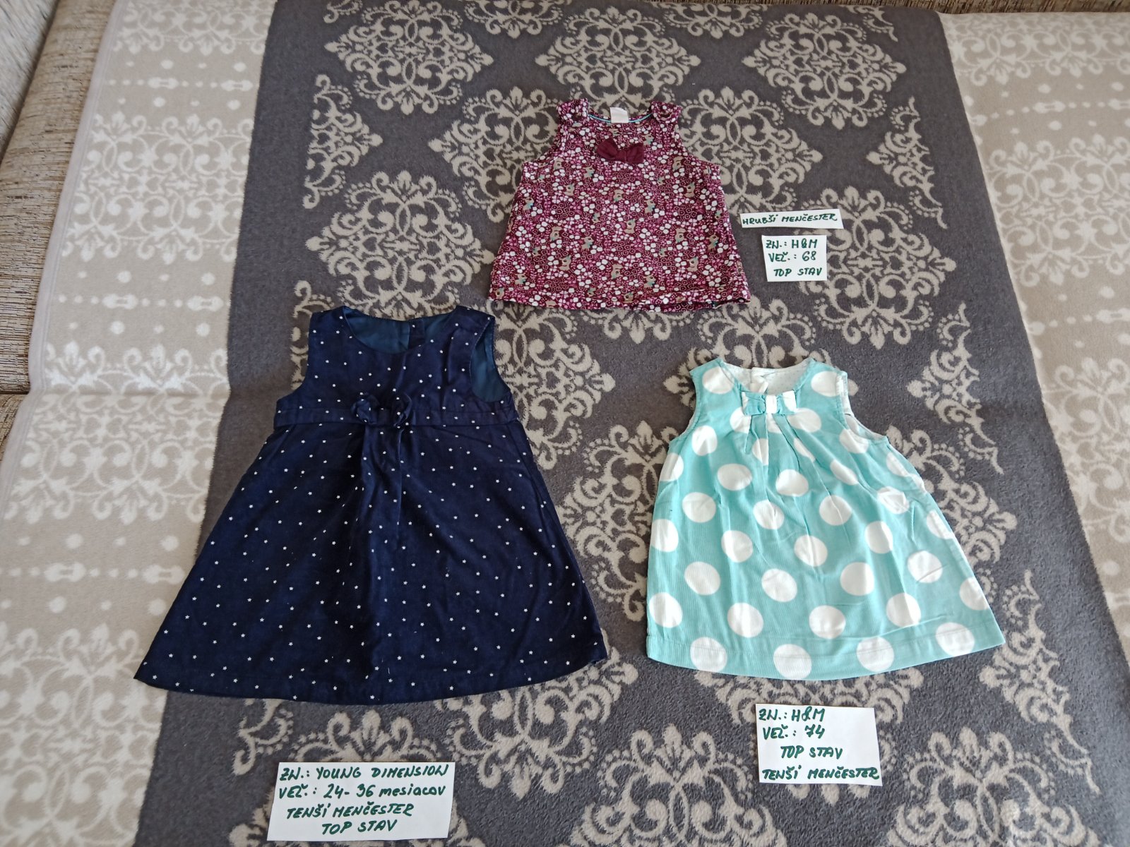 Predám mencestrove šaty pre dievčatko. Hrubsie šatky zn.H&M(vel.68),tenšie šatky zn.H&M(vel.74) a tenšie tmavomodre šaty zn.Young Dimensions(vel.24-36mes.).Cena za kus je 3eur.