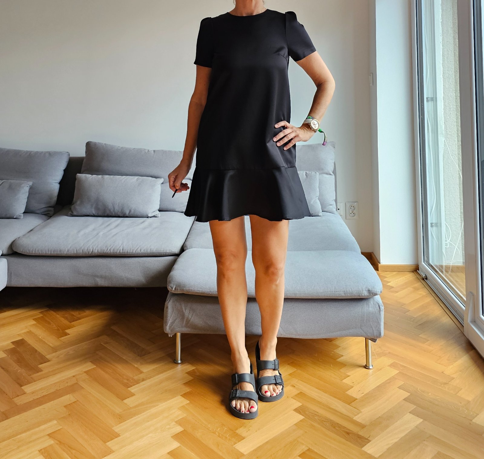 Perfektne malé čierne šaty ušité z kvalitného saténu vo vysokej gramazi. Šaty sú minimalistické, s pekným detailom volanu na spodnom leme. Pekný univerzalny kusok do prace ale aj na večer