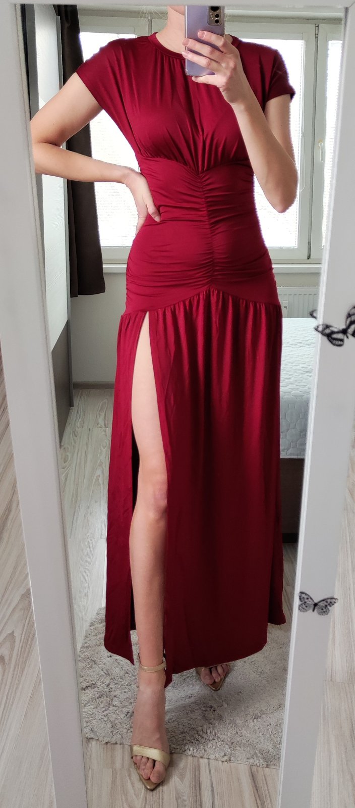 Elastické elegantné/spoločenské šaty vo veľkosti S, cena 28 eur. Farba je bordová, na fotke je farba veľmi živá.