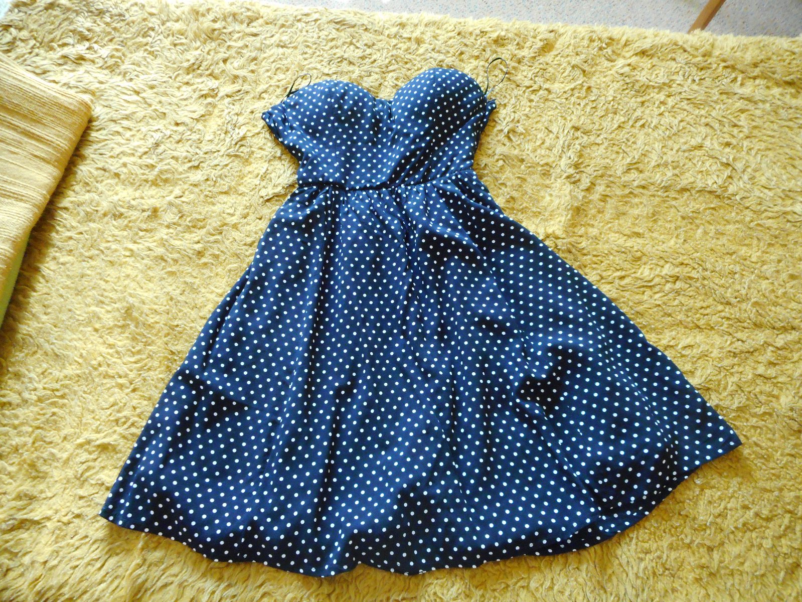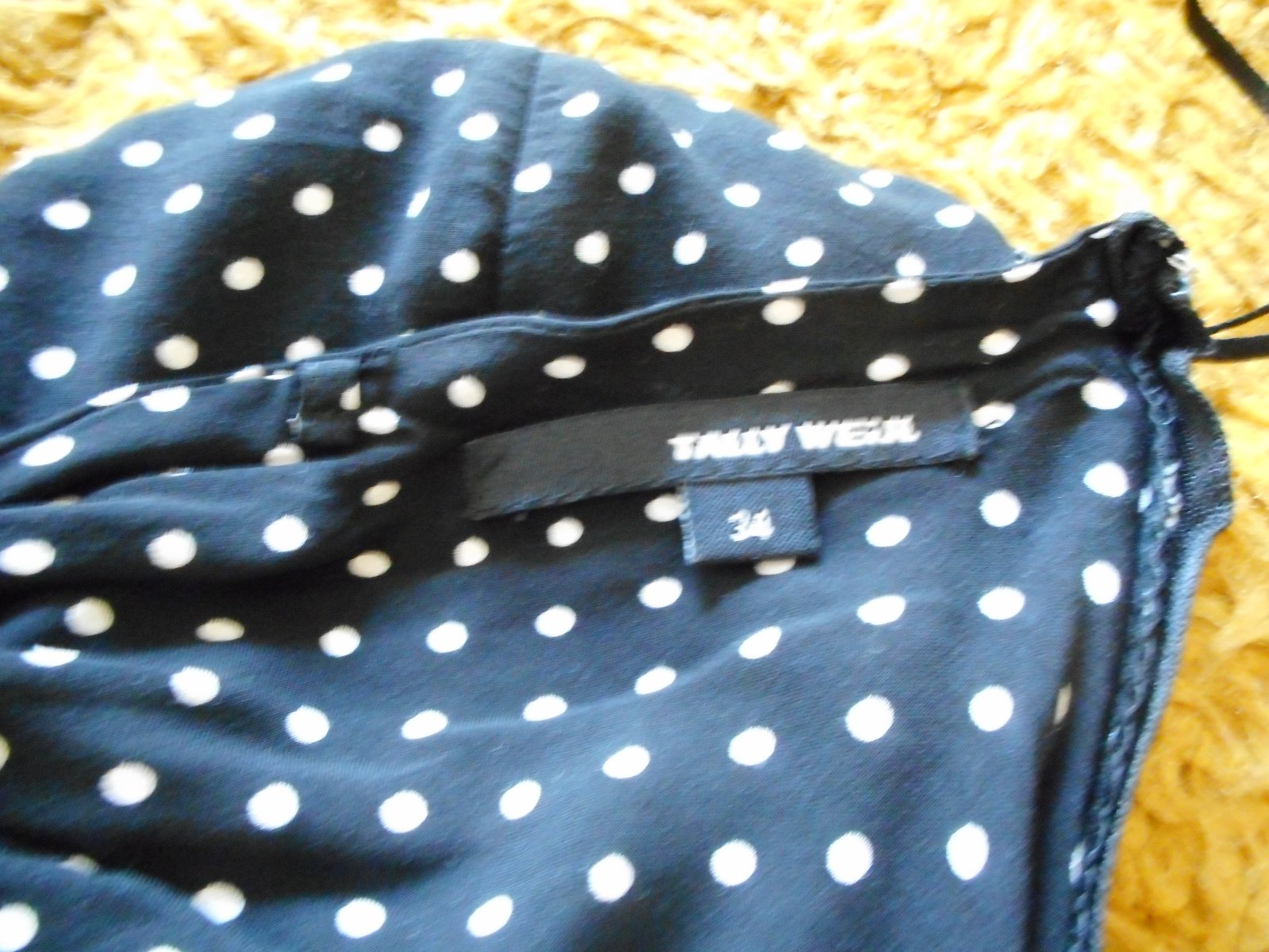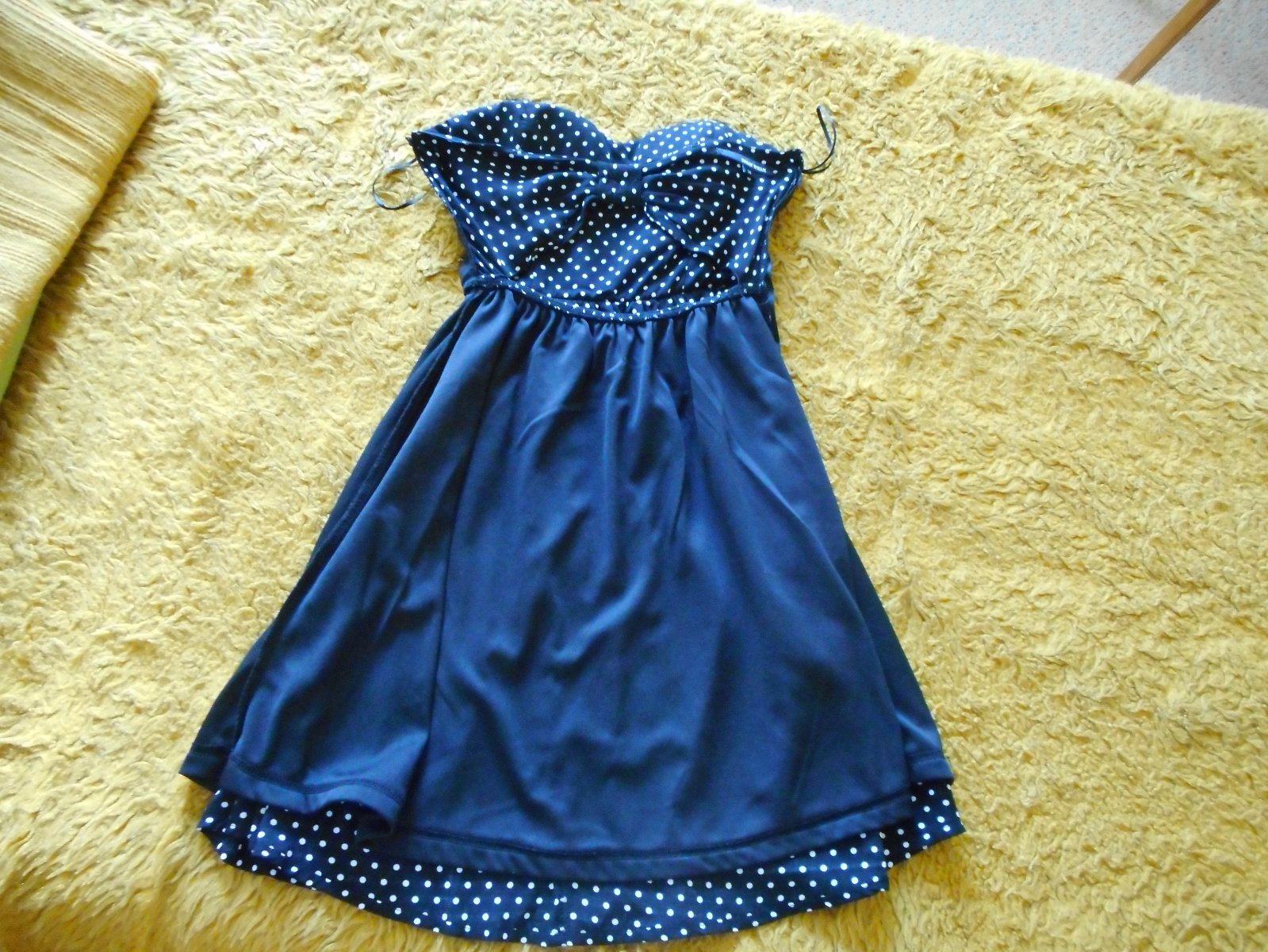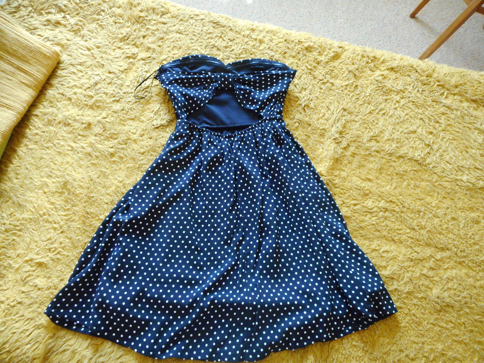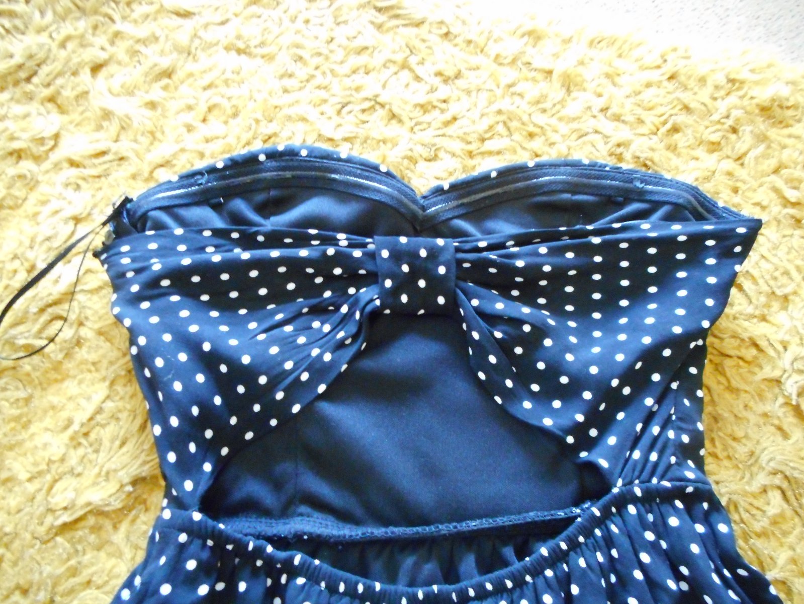 predám používané nijako nepoškodené peknučké dievčenské letné sexi šaty zn. Tally Weijl veľkosť 34 bez ramienok s všitou podprsenkou s gumičkovým pásom čiernej farby s bielymi malými bodkami, šatočky sú podšité, majú mierne rozšírenú sukničku, vzadu na chrbte je efektne robený chrbát v tvare mašle pod ktorým vidieť holý chrbát, zapínanie na boku na umelý krytý zips, celková dĺžka šiat je 66, pás 26cm