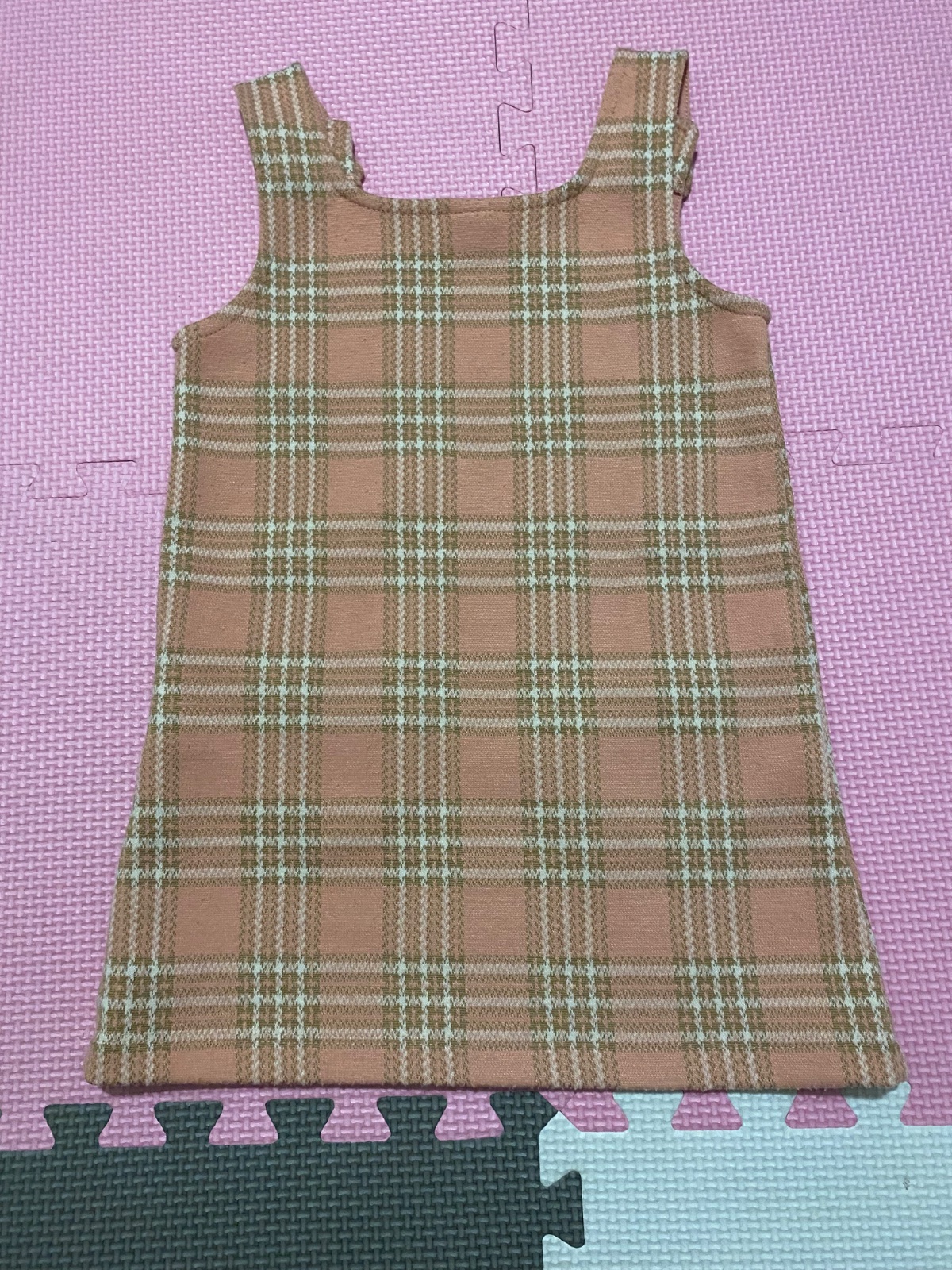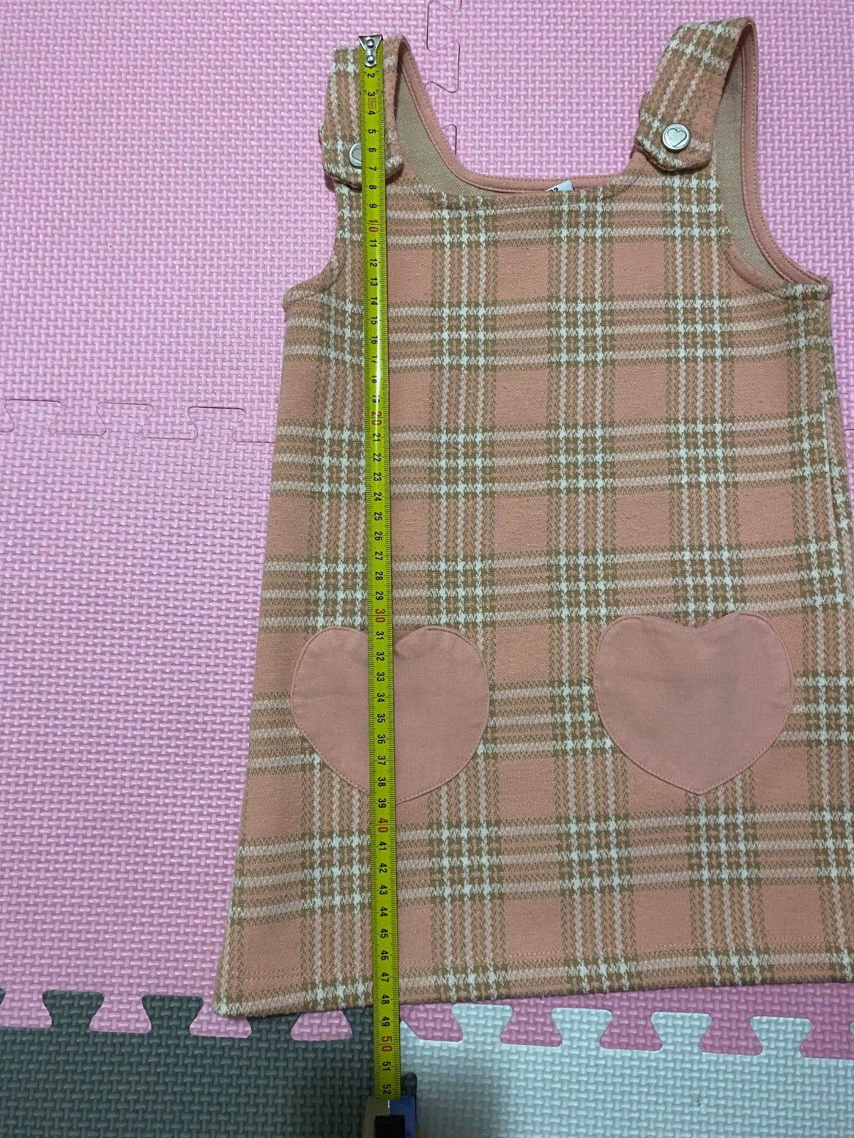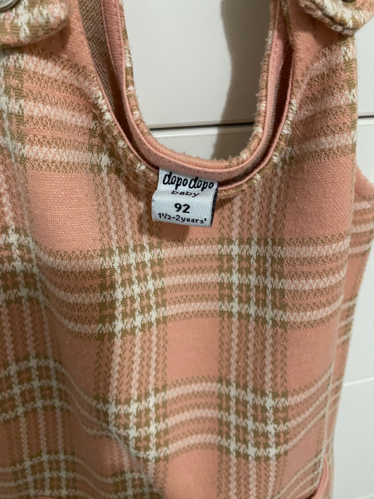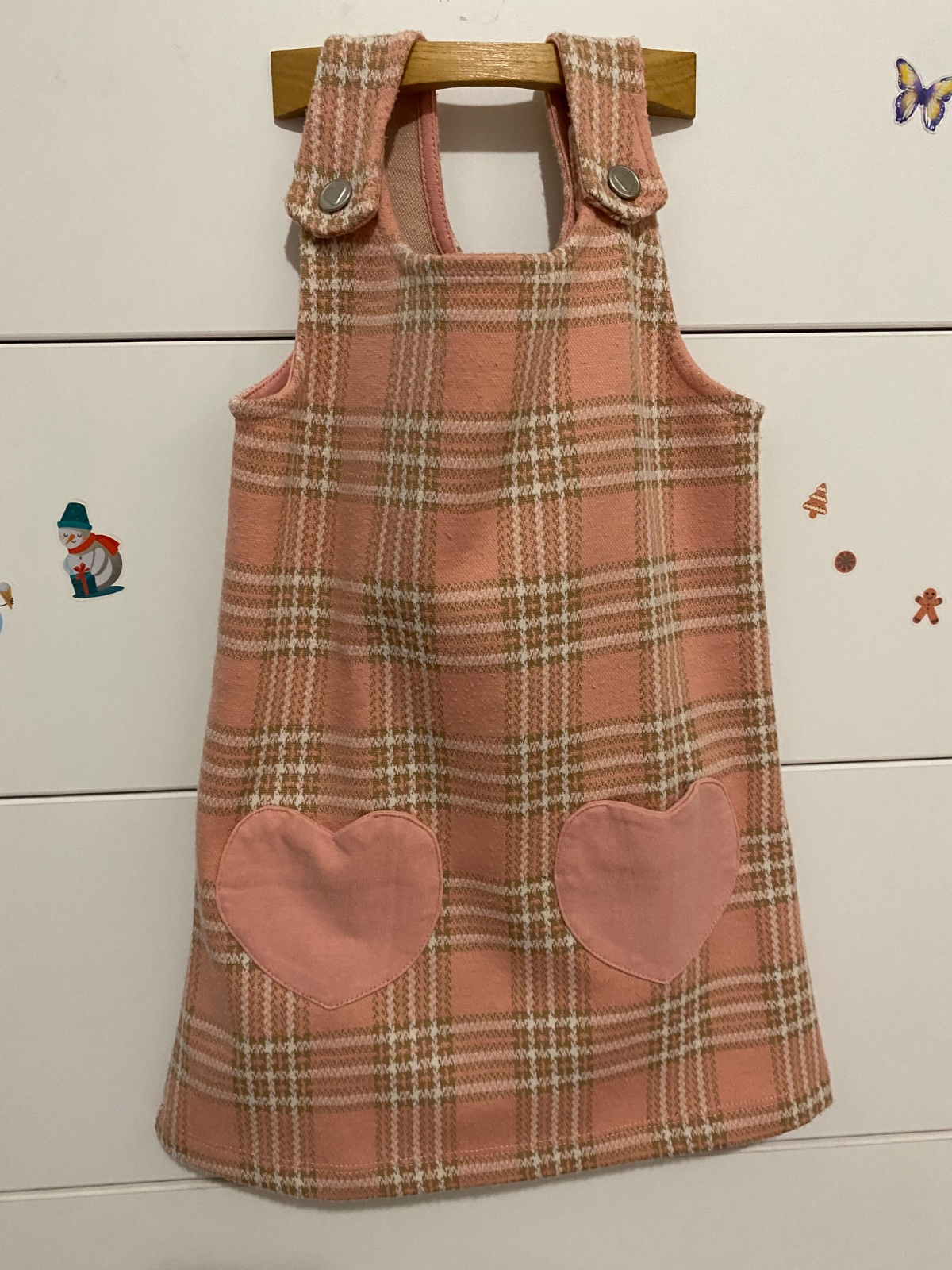 Pekný nosený stav - mini žmoľky, inak bez poškodenia. Traky sa zapínajú na cvoky. Vrecká v tavare srdiečka sú tzv. funkčné. Veľmi príjemný materiál na dotyk.