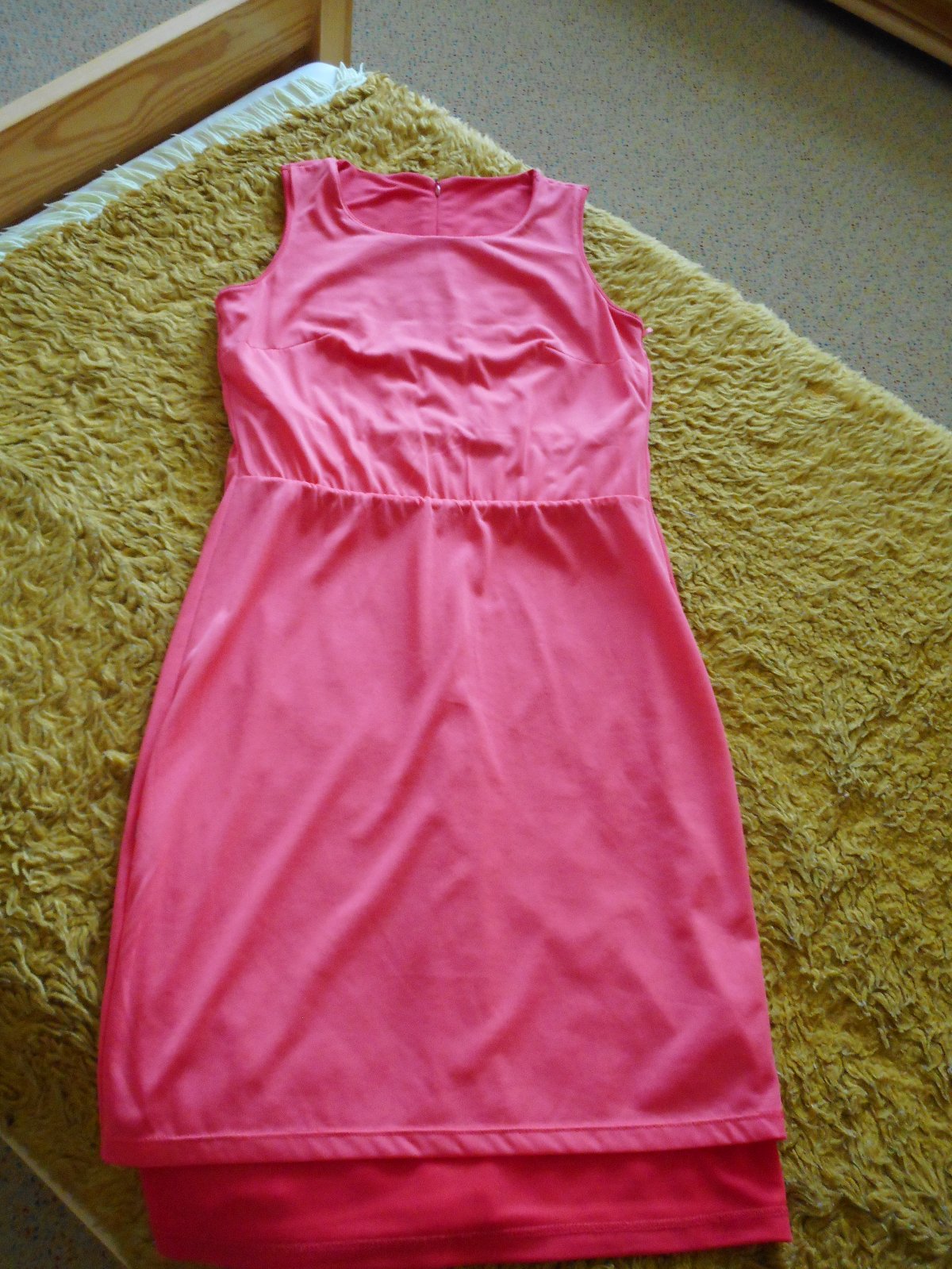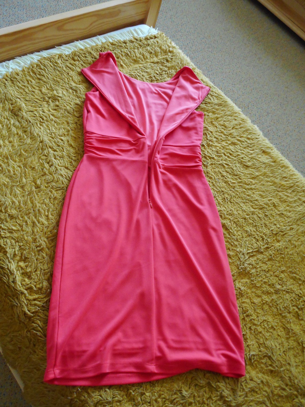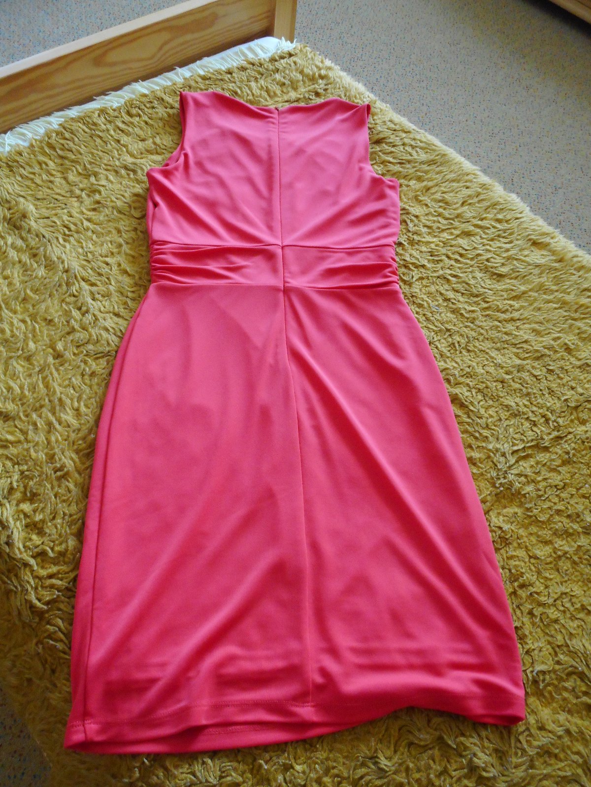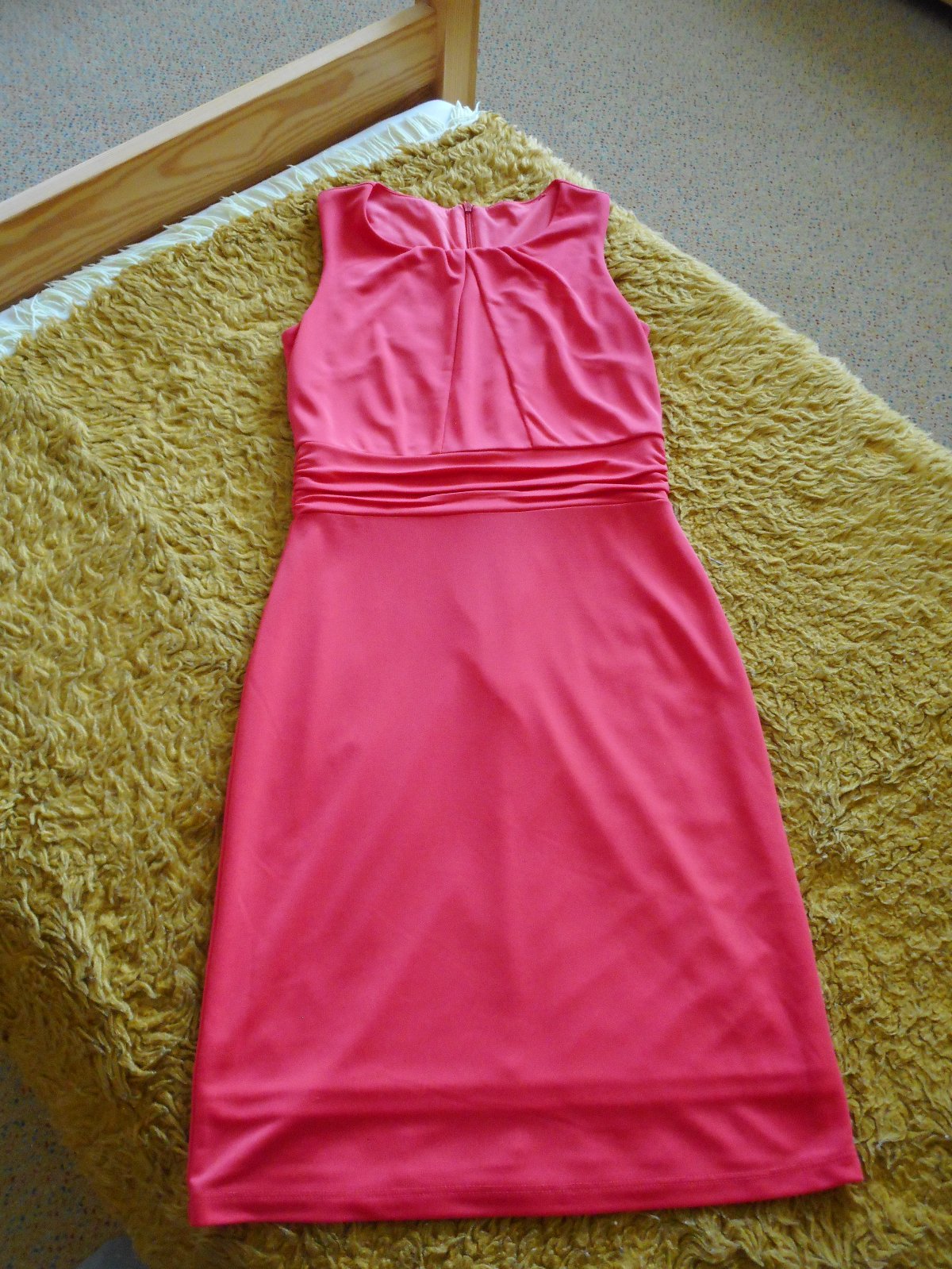predám používané nepoškodené elegantné úzke šaty pre slečnu červenej farby so zapínaním vzadu na zips, podšité, bez rukávov, prestrihnuté v páse, krásne kopírujúce štíhlu postavu, materiál pružný, poddajný, na hrudníku prestrihnutie pre optické zväčšenie pŕs, celková dĺžka šiat je 95, šírka v páse 34cm,šírka pod pazuchami je 41cm