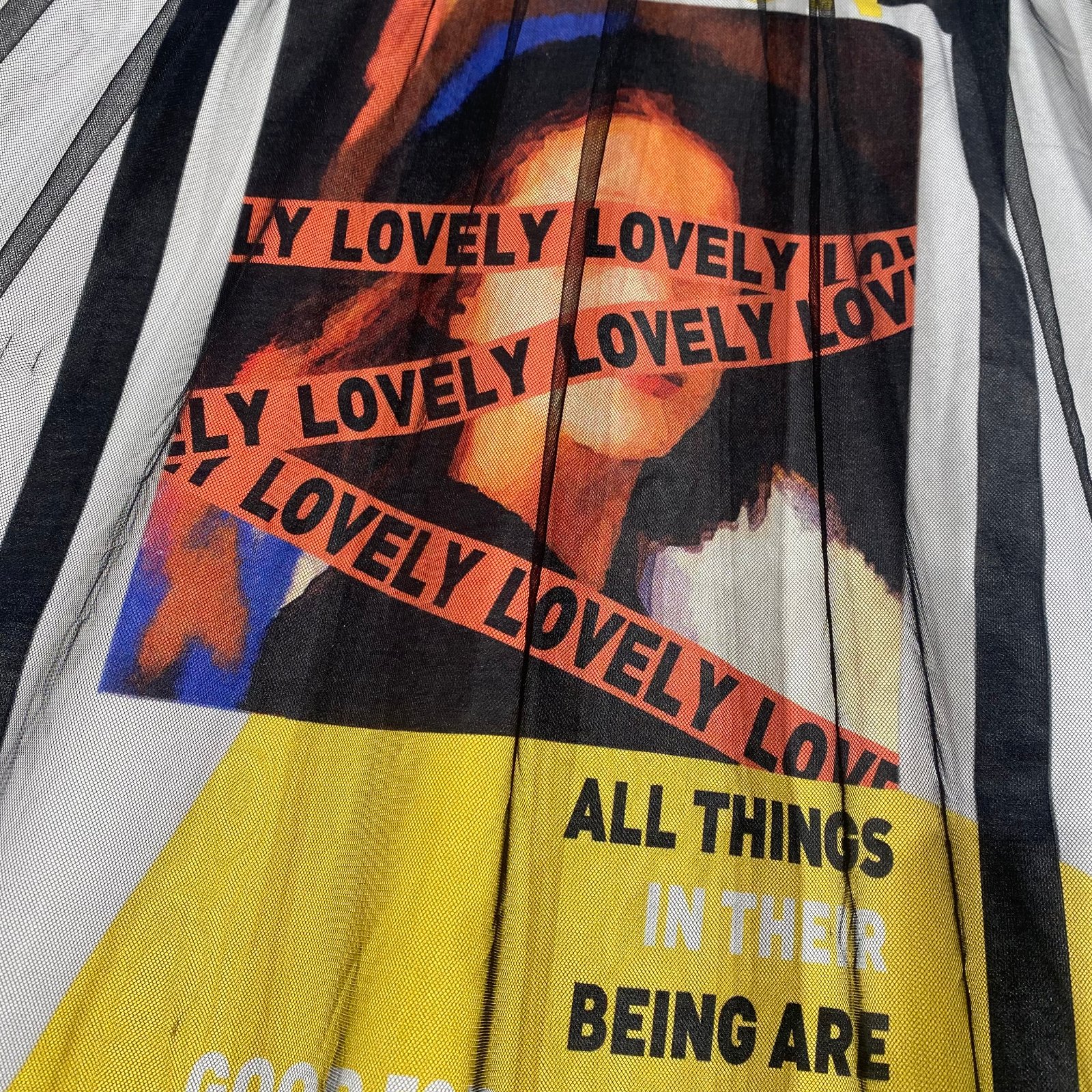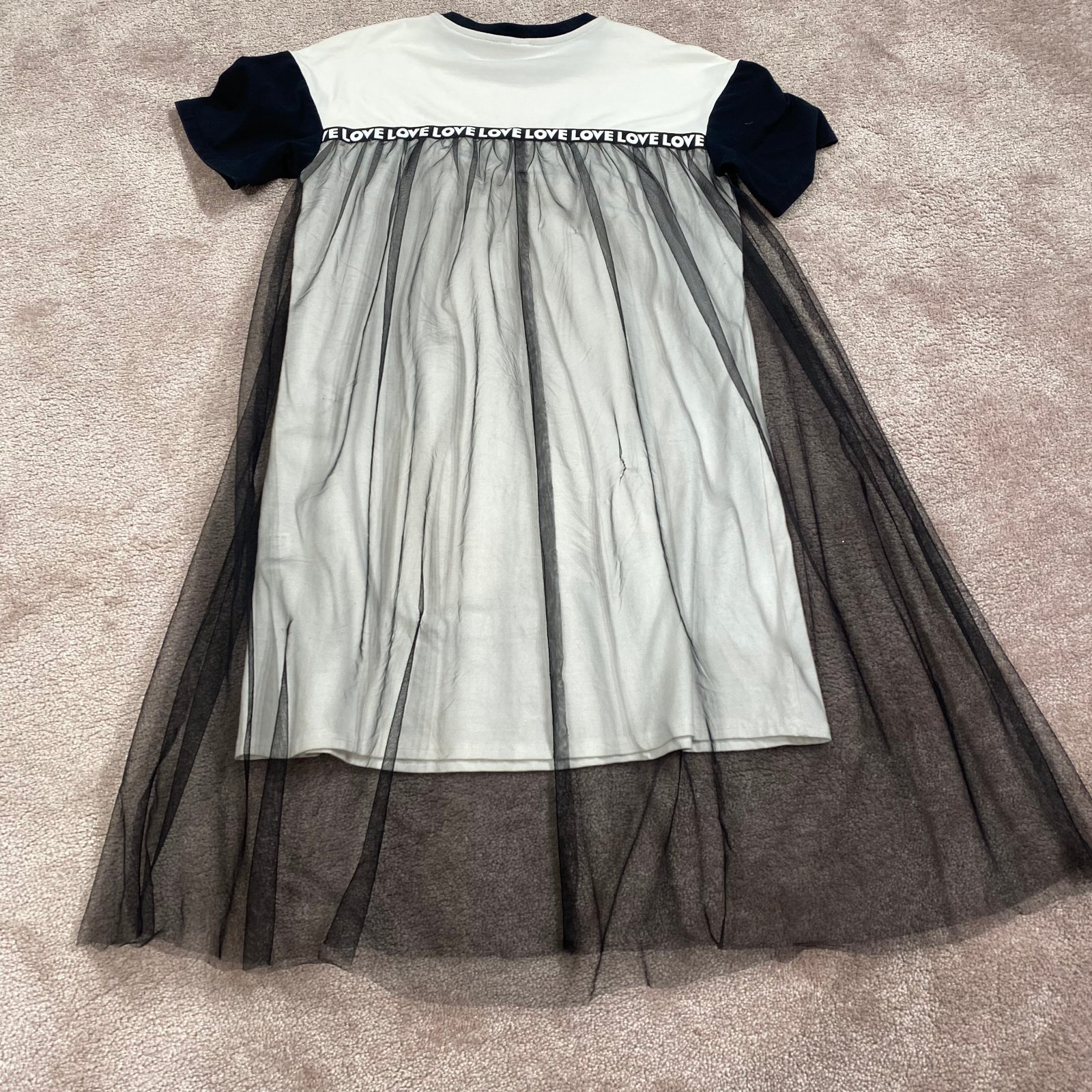 Biele šaty s potlačou na prednej strane. Od živôtika pridáný čierny tyl. Dĺžka šiat 78cm, tyl je o 15cm dlhší, šírka hrudníka je 43cm. Na zadnej strane kúsok tylu zašitý. Veľkosť 140/146