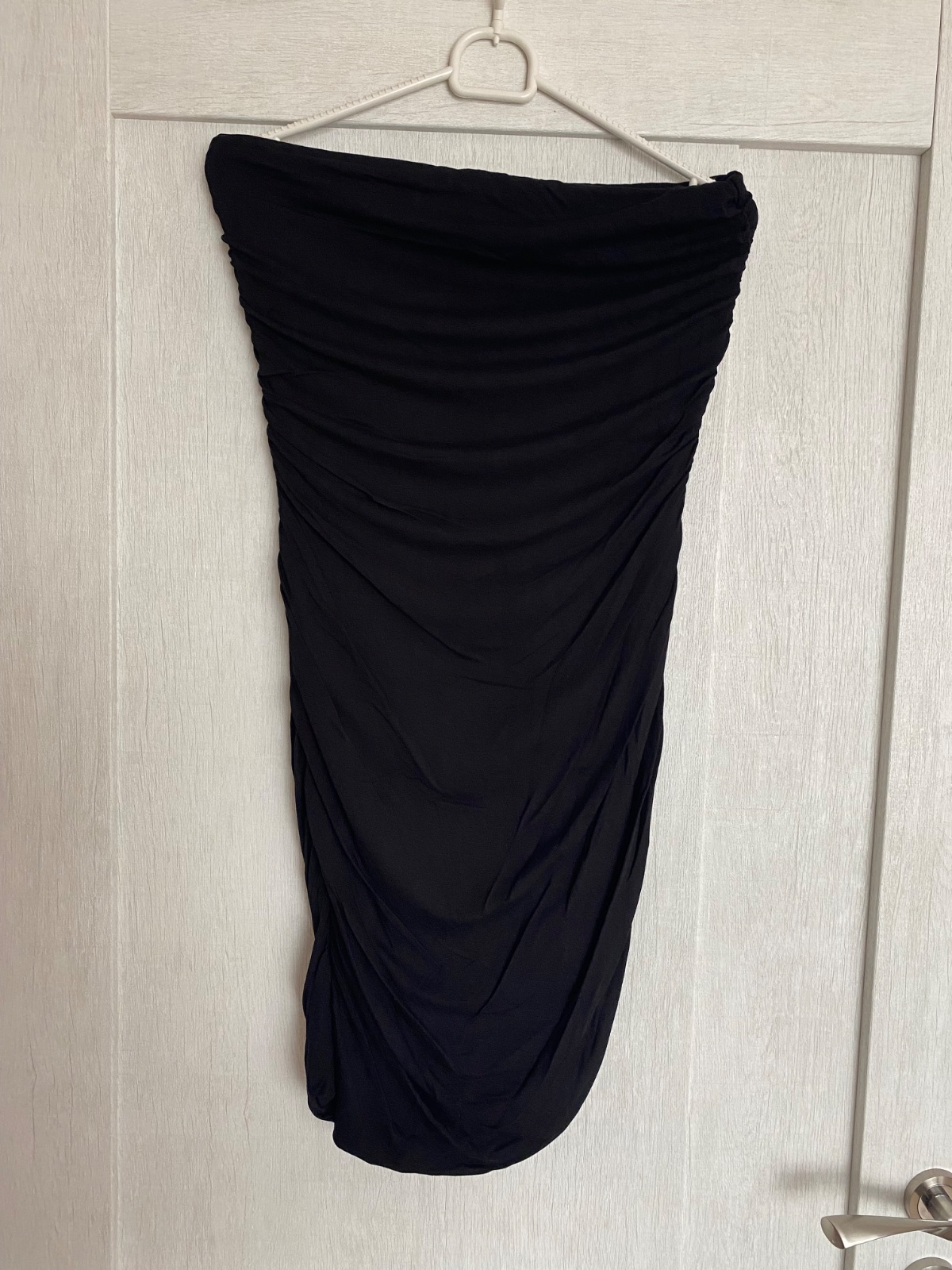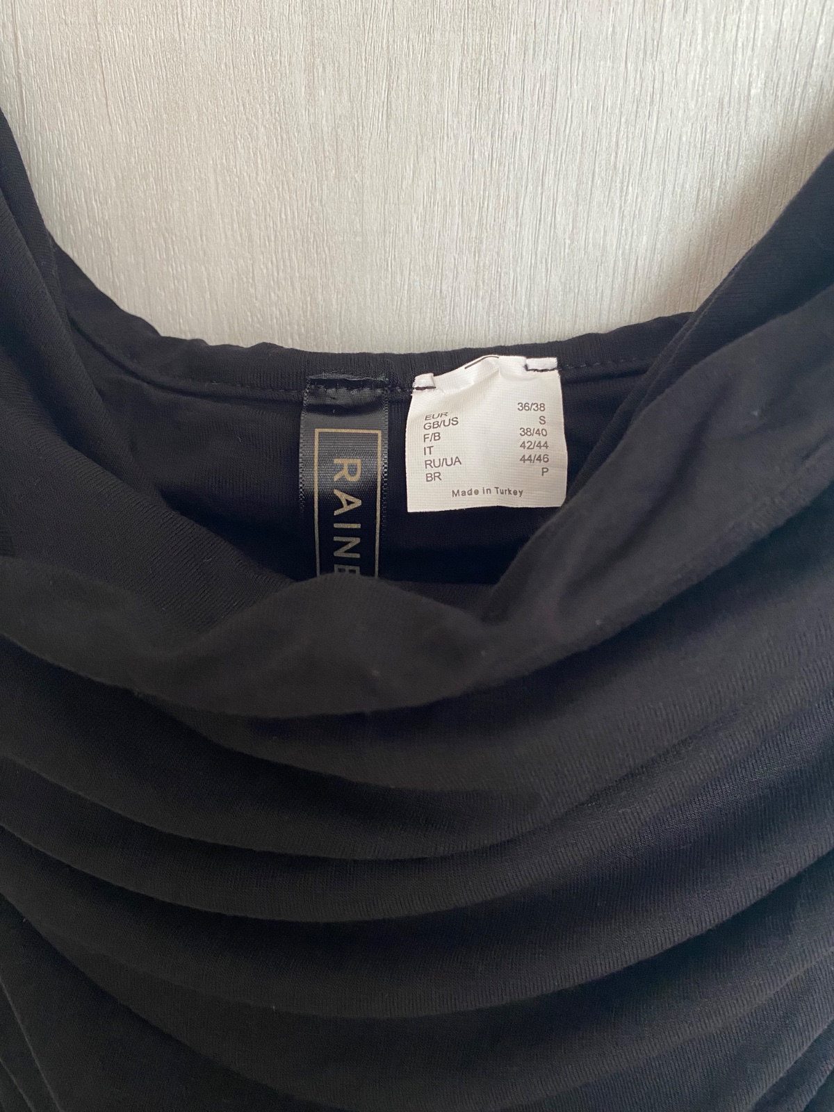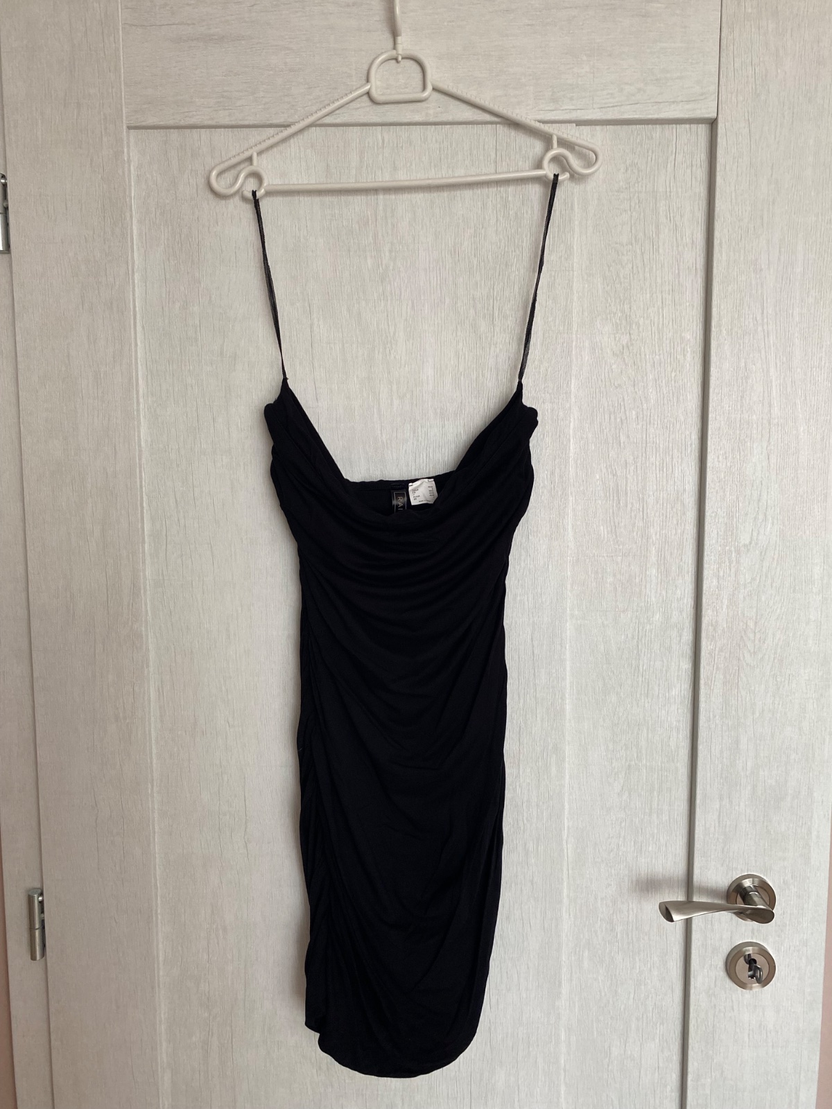 Malé čierne jednoduché šaty, 3/4 rukáv. Materiál: 95% viskóza, 5% elastan. Hlboký výstrih v zavinovacom vzhľade, malé riasenie na boku, strih zvýrazňujúci postavu. Elastický materiál. Nosené be...