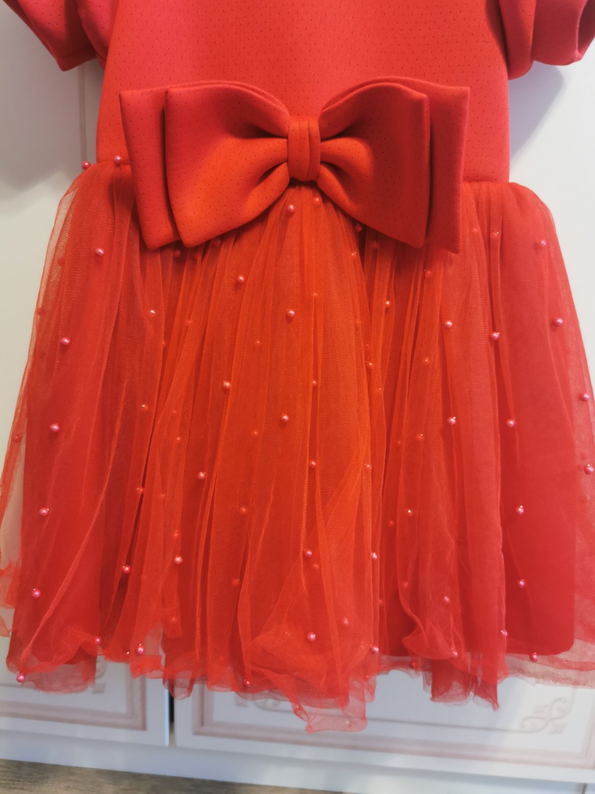 Červené trblietavé elastické šaty zn. H&M. Dá sa pod ne dať aj nátelník s dlhým rukávom. Materiál 81% bavlna, 12% polyester, 7% metalické vlákno. Veľkosť uvedená 110/116, premerajte: dĺžka 59 cm, š...