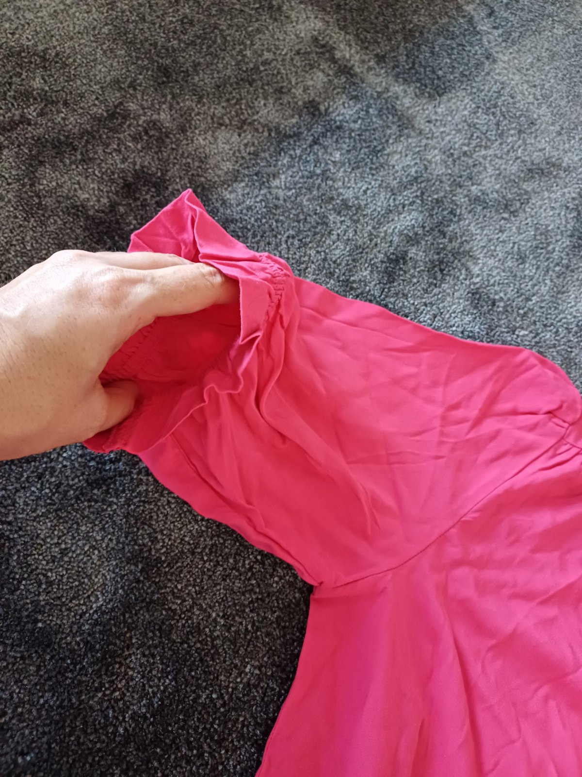 Predam velmi pekne prilezitostne saty. Farba nie je syto ruzova. Skor taka cyklamenova ako keby s odleskami fialovej. Velmi prijemna hladka latka. Kusok pod pazuchou povolena nitka v spoji.(vid. d...