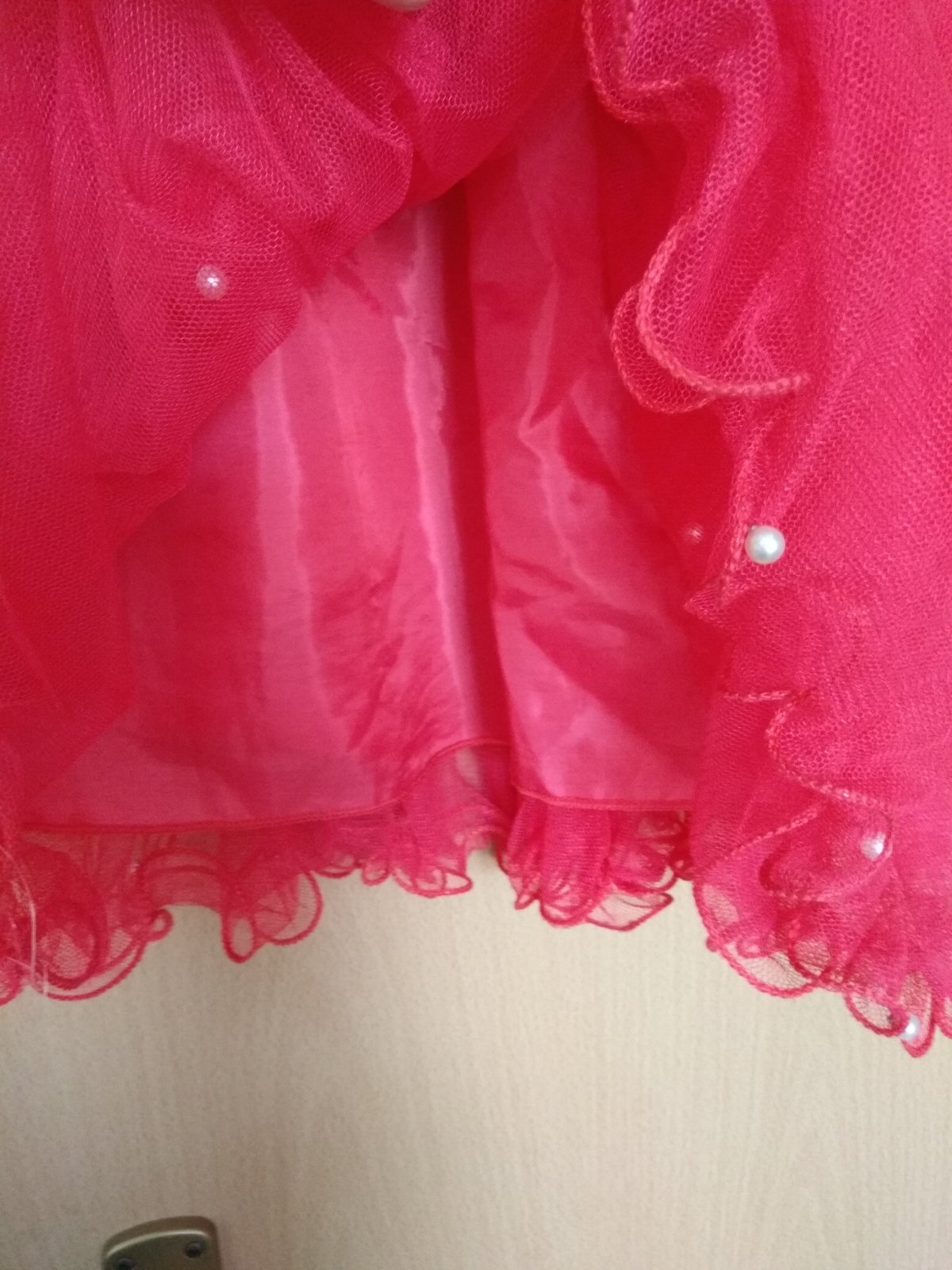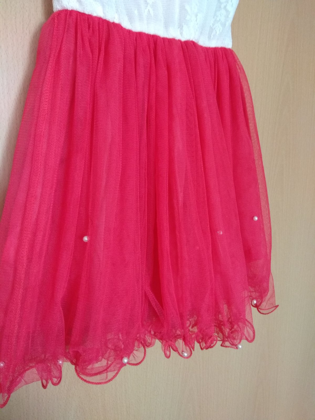 Veľmi pekné, červená farba ju už trošilinku svetlejšia, ale inak, bez poškodenia. Dĺžka šiat vrátanie ramienka 73cm.