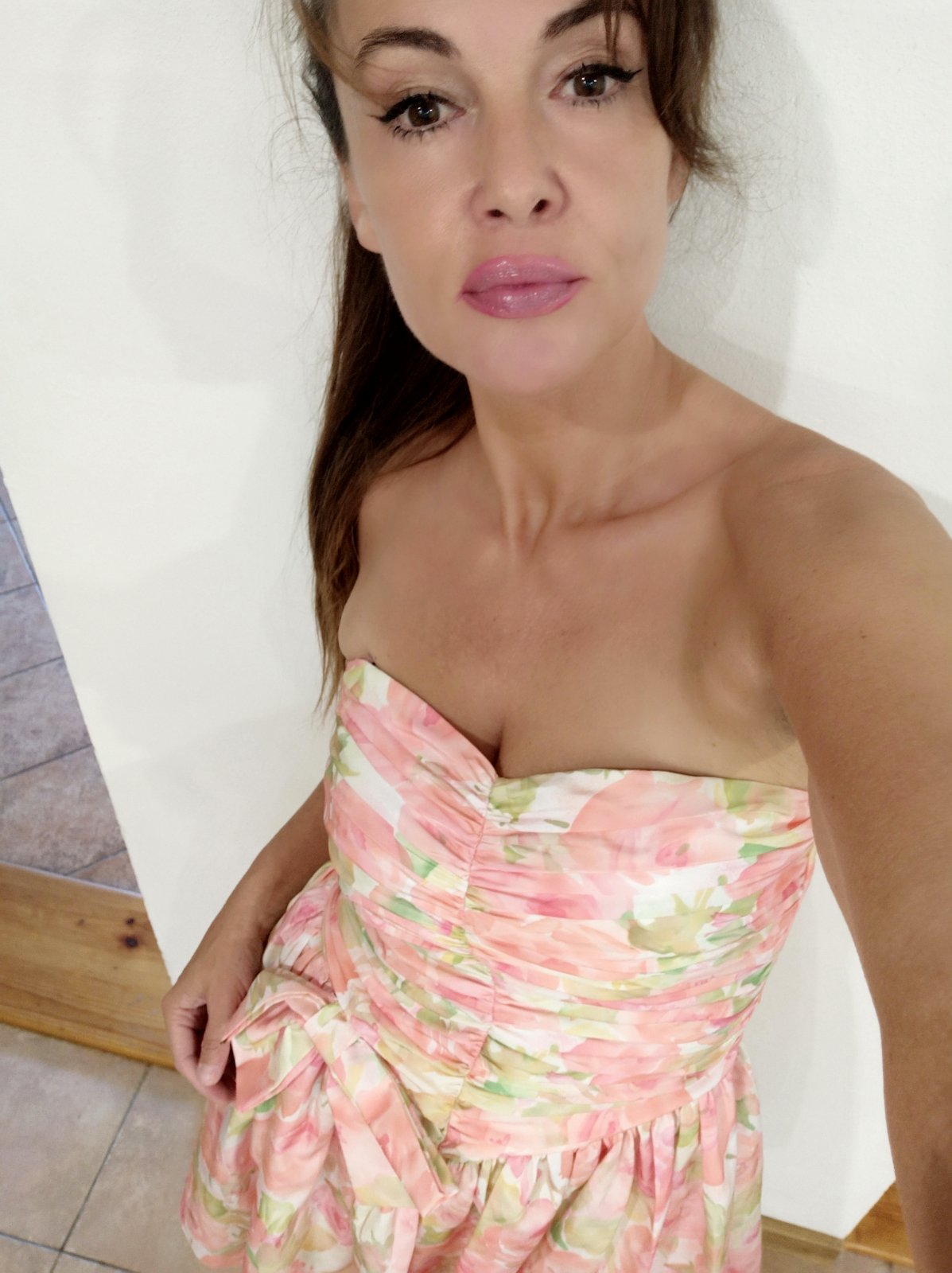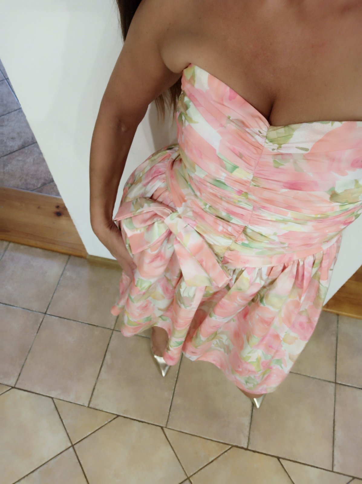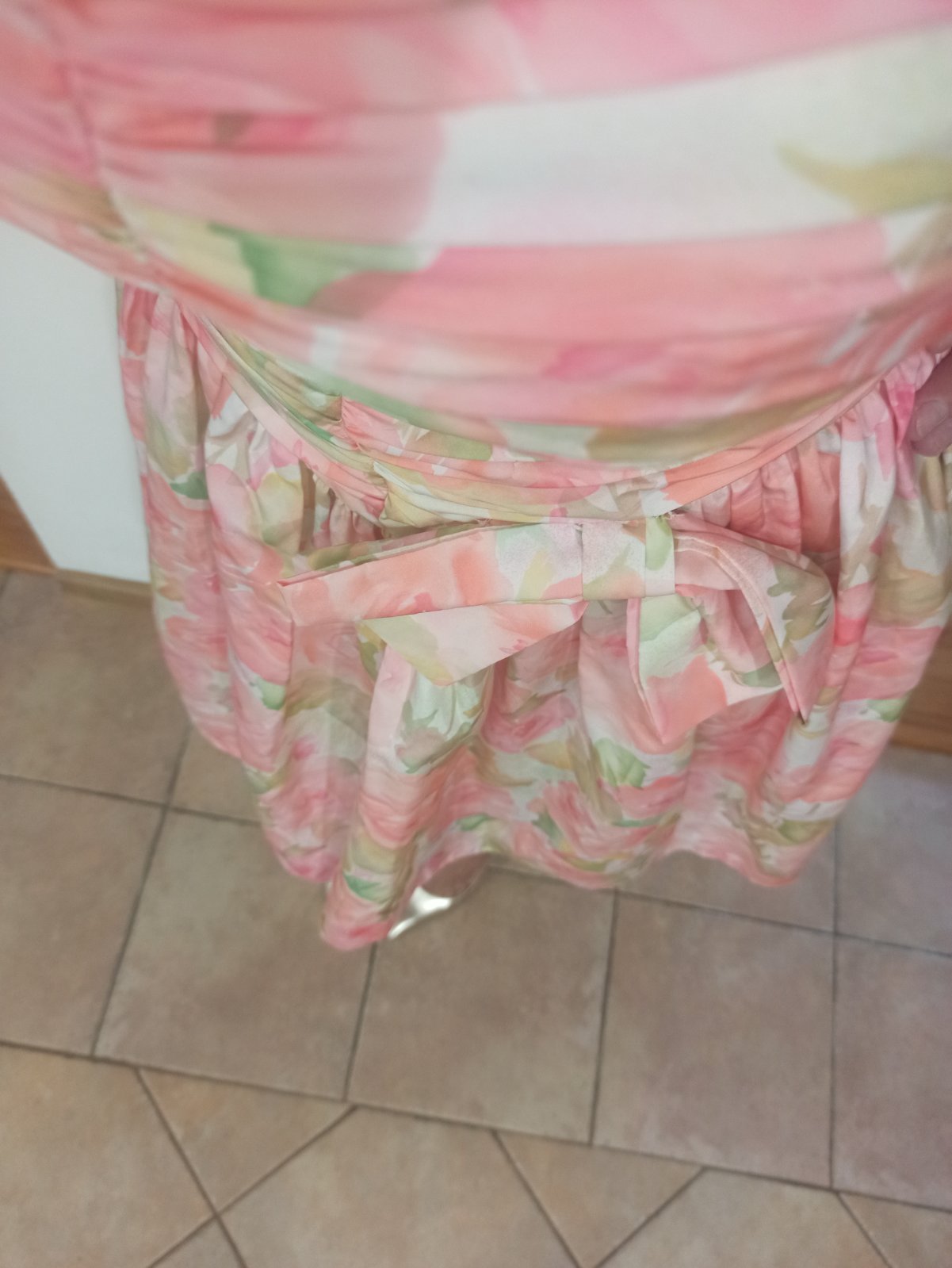 Lososové/bledoružové šaty. Sedia na veľkosť M. Farba je bledšia ako na fotke, skôr do lososovej/ružovej.