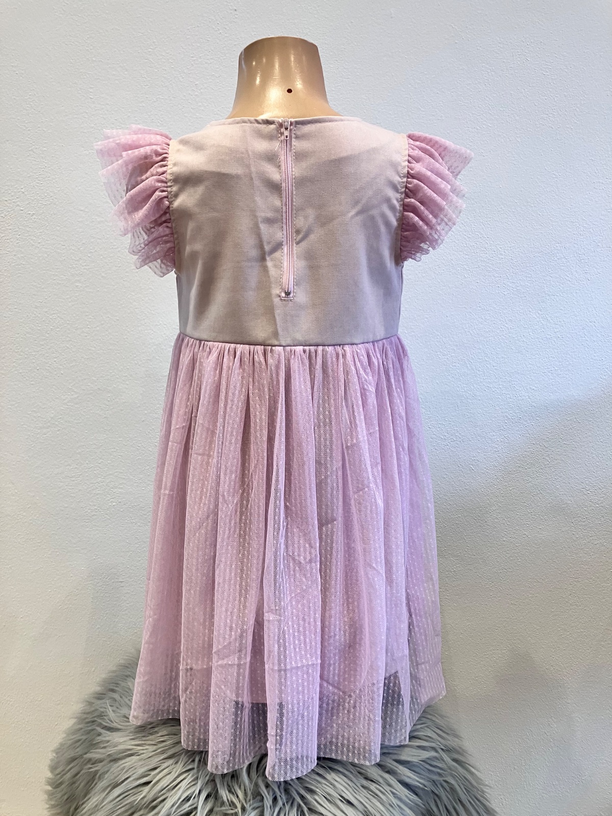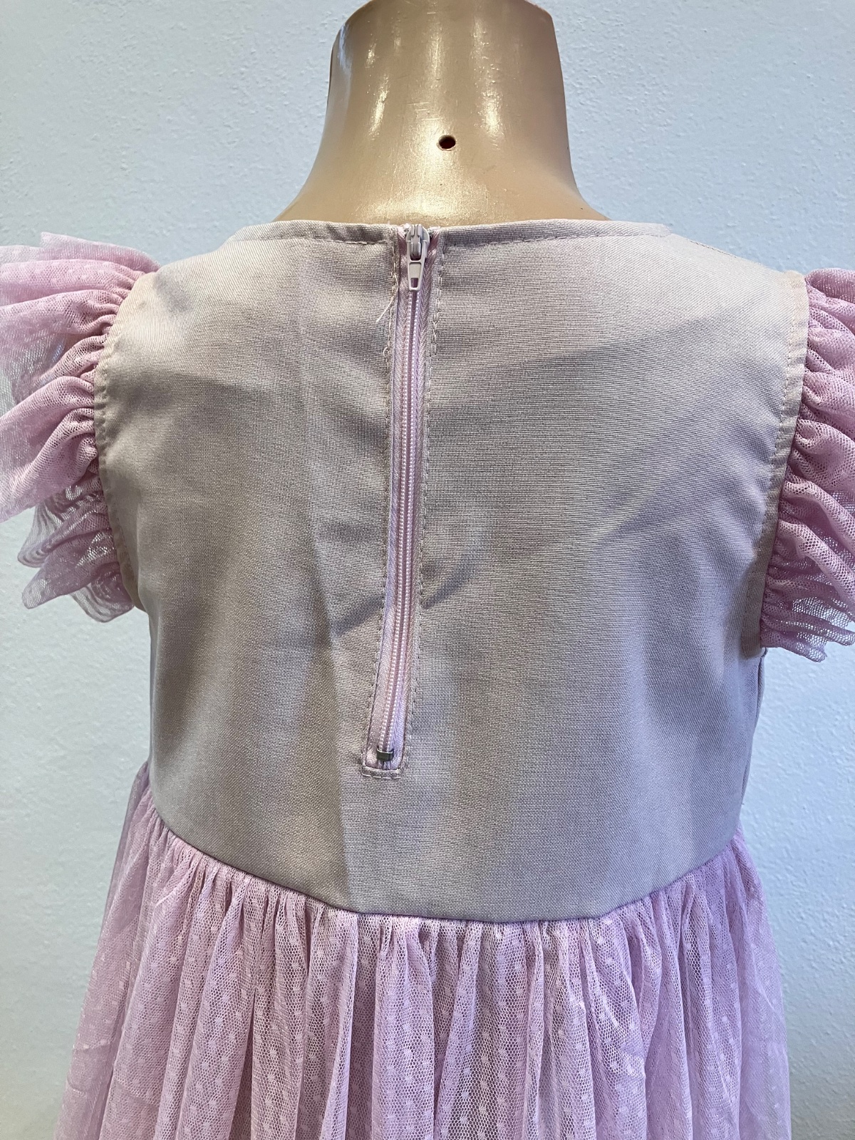 Dievčenské elegantné šaty s krátkym tylovým rukávom a tylovou sukňou, zapínanie vzadu na zips, nie sú elastické.