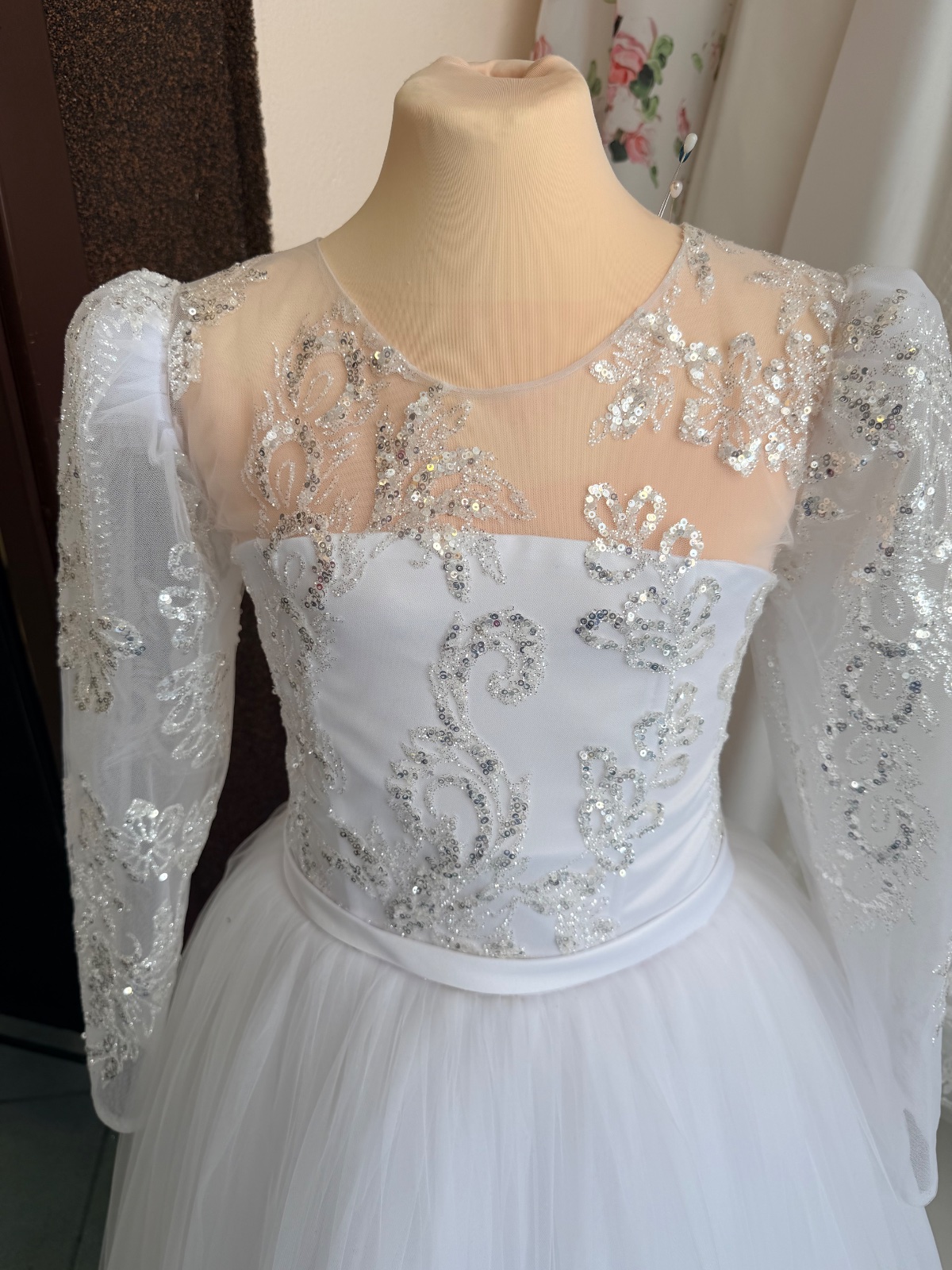 Vrchný diel je zo žiarivého saténu so slávnostným V-éčkovým výstrihom na chrbte a zapínaním na elegantné gombíčky ✨