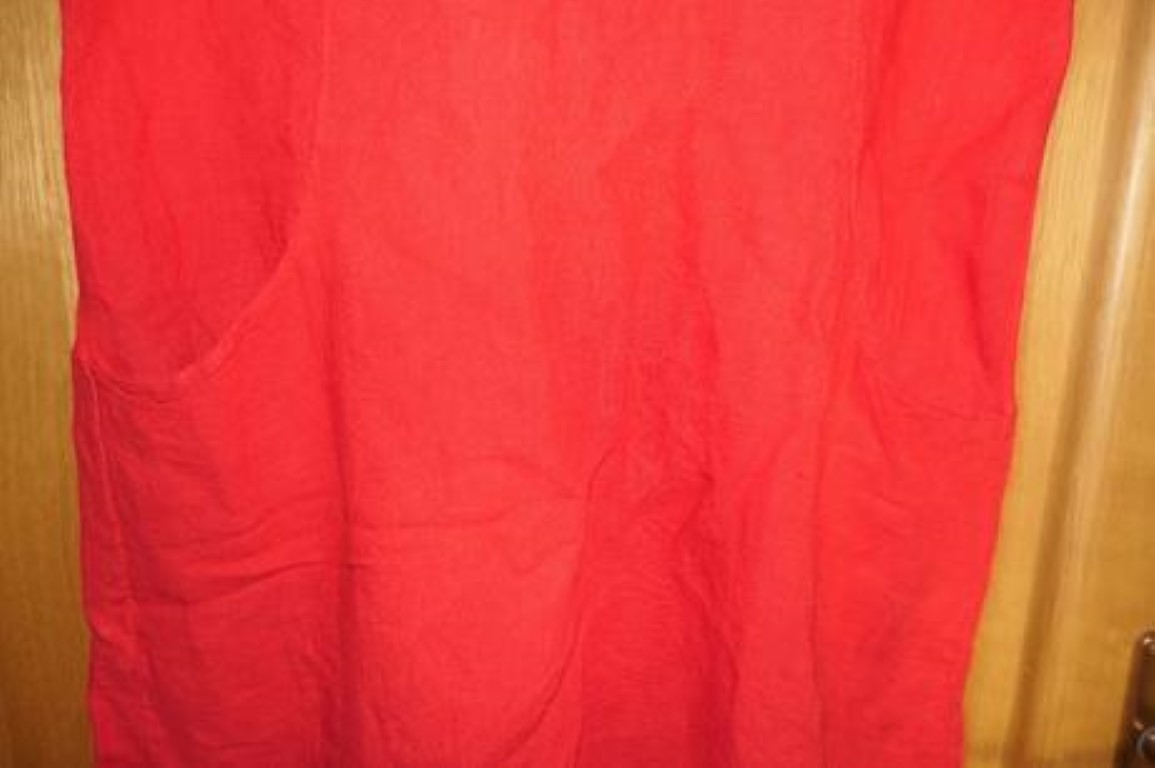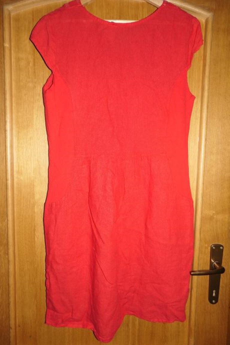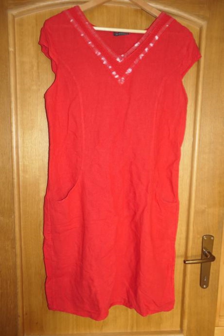 ponukam nadherne, kvalitne, lanove, cervene, damske saty, dva bocne vrecka, krasna aplikacia v dekolte, pohodlne, vzdusne, prijemne