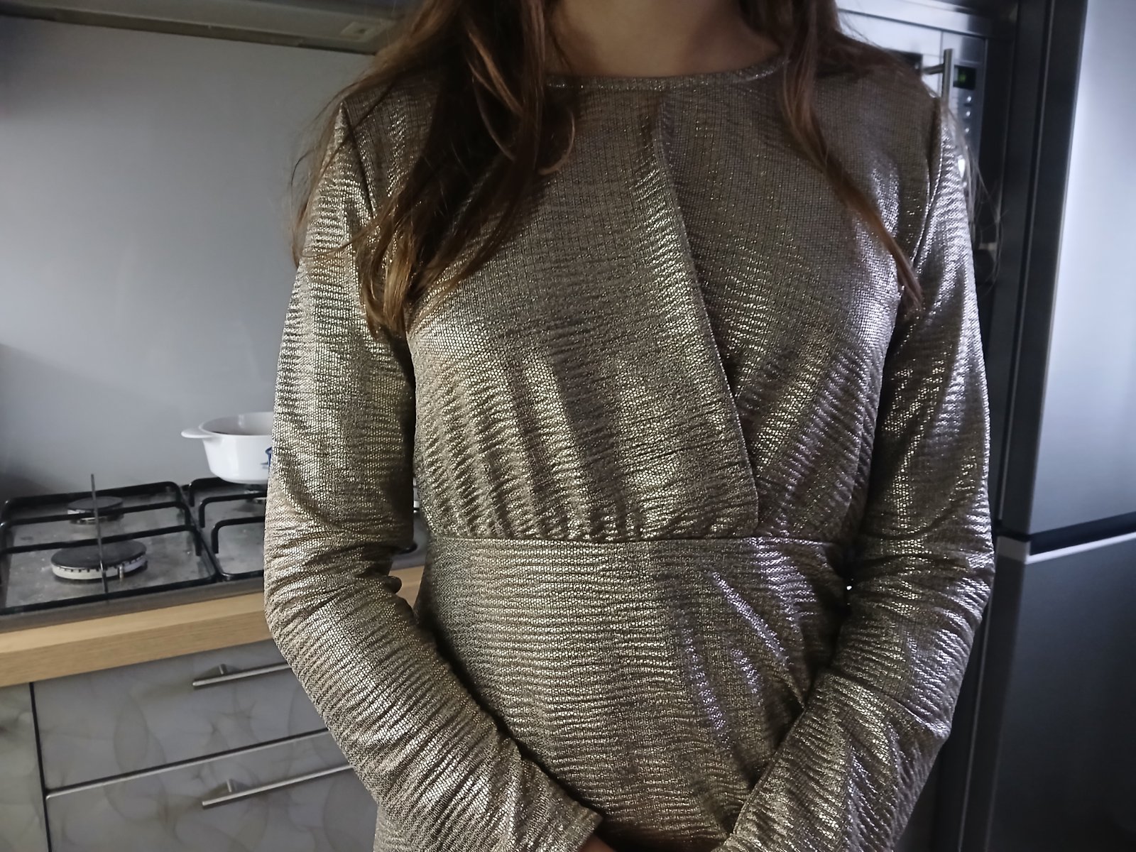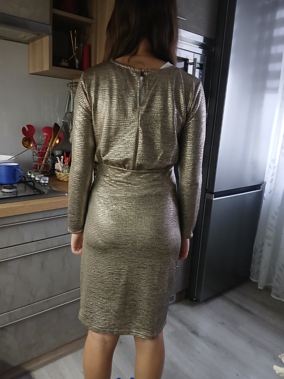 Úžasné šaty lesklej zlatej farby, top stav D 83 Š 43 Pás 33