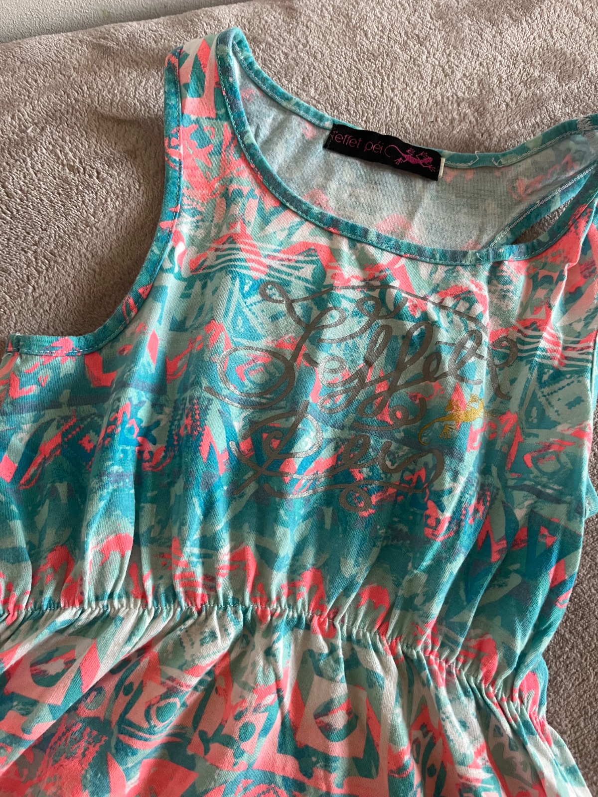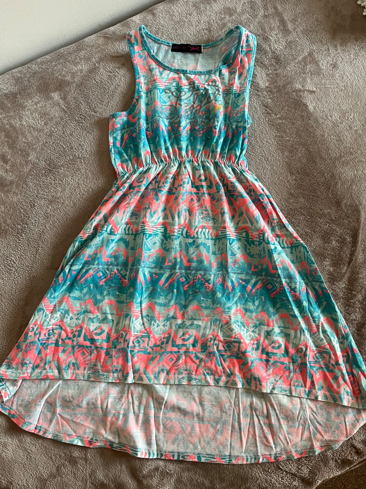 Predám málo nosené dievčenské letné šaty na ramienka. Sukňa s volánikmi. Obvod hrudníka: 66cm. Obvod pásu: 66cm a Dĺžka od ramienok: 66cm.