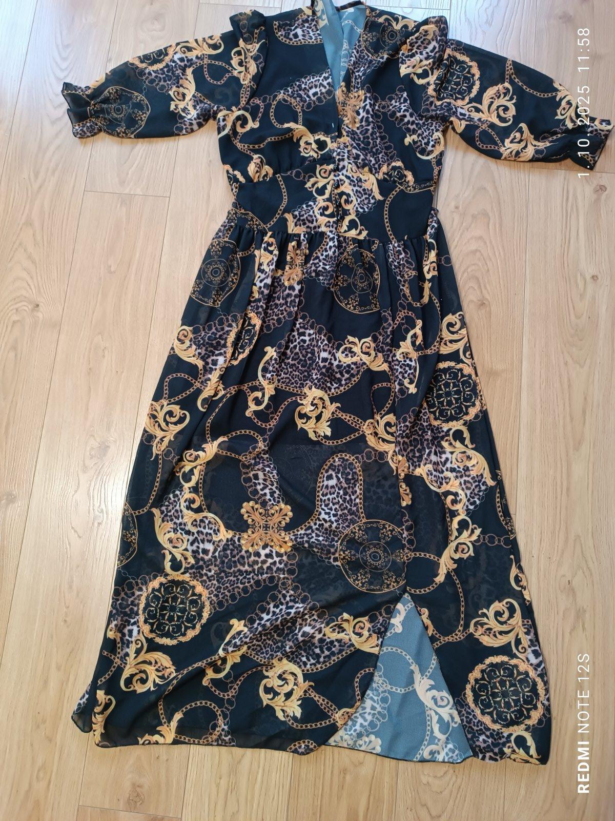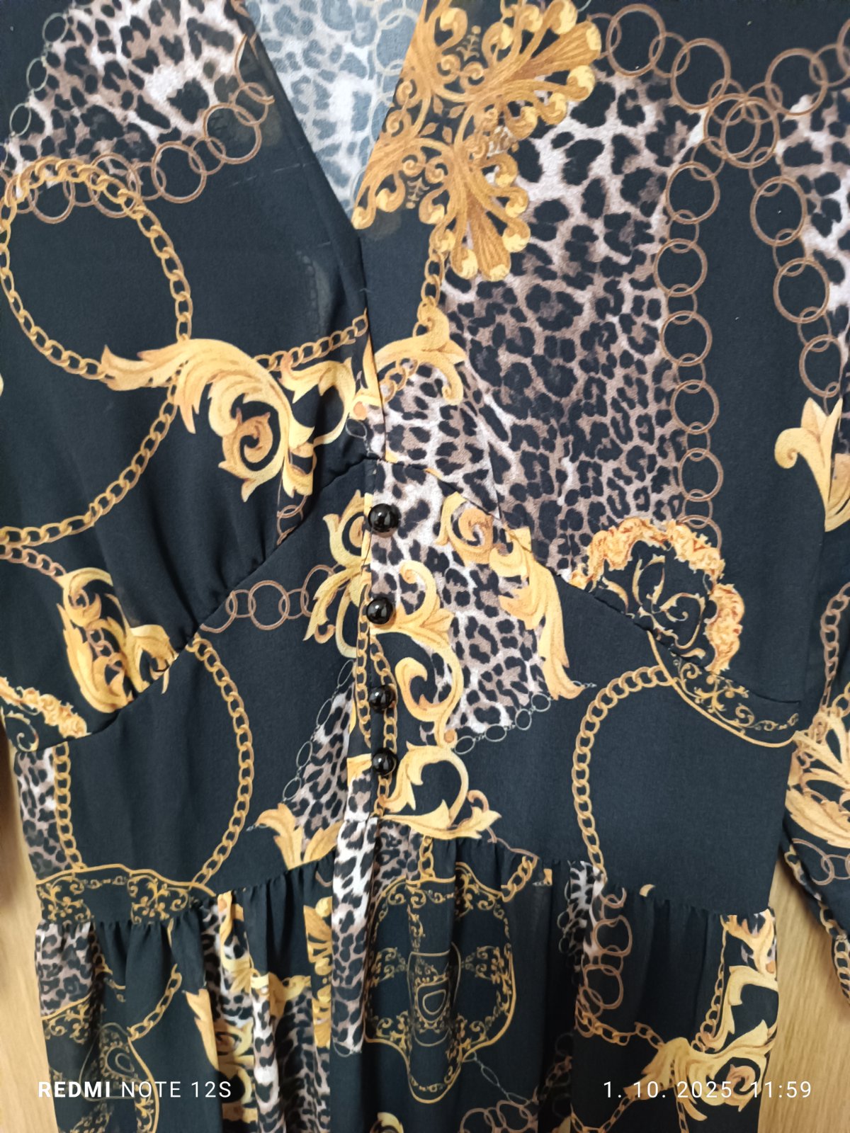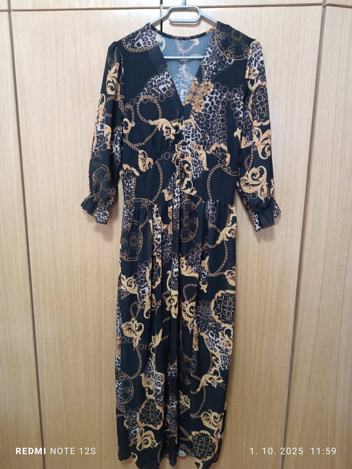 Dámske šaty v páse strihnuté, zadný diel na gumu (viď foto), predný diel páse prestrihnute+ozdobné 4gombiky(viď foto),výstrih v, trojštvrťové rukávy,dĺžka šiat 130cm,dĺžka od pásu 84cm, šírka pás 80cm, podšívka je nad kolená.