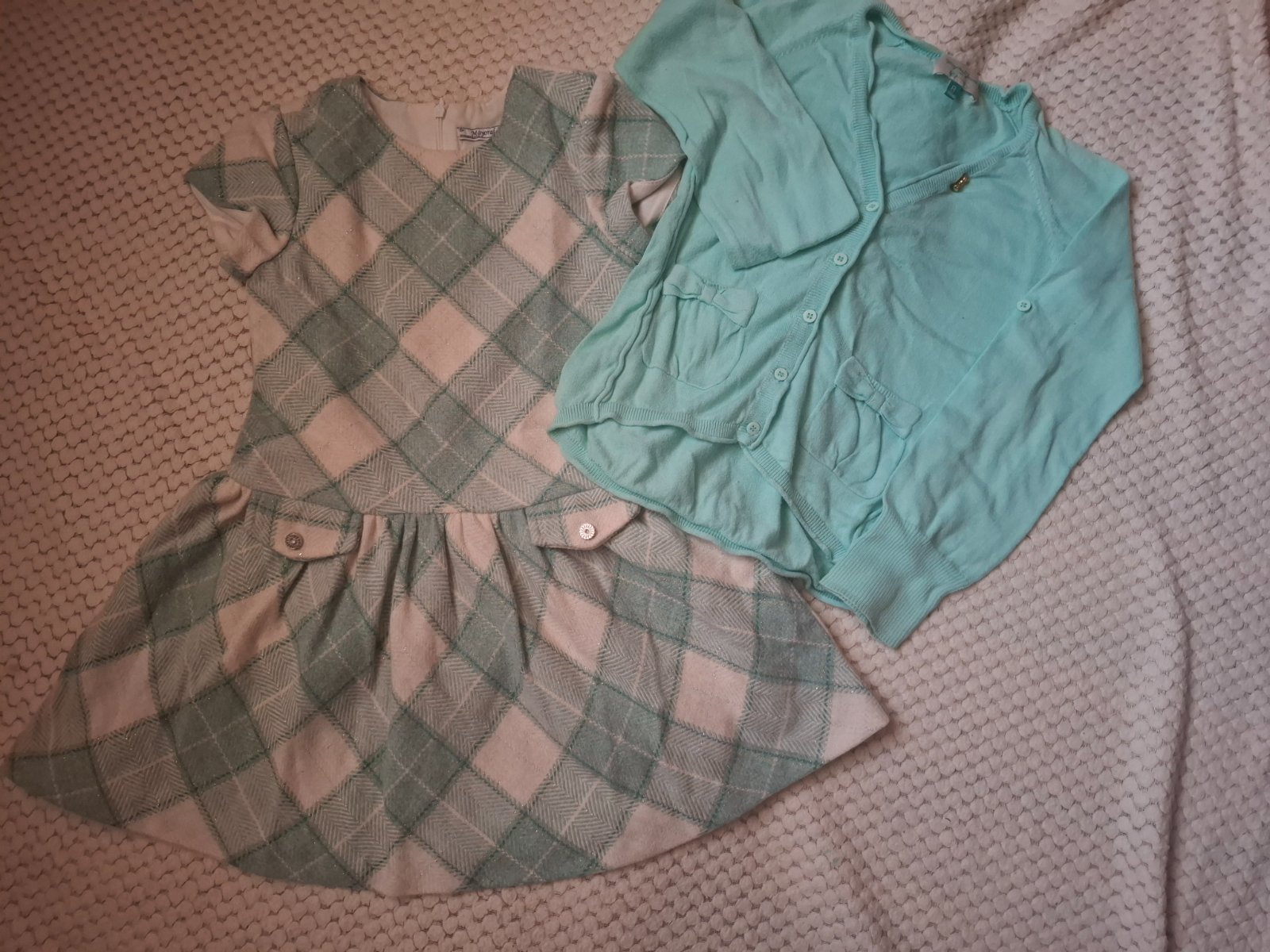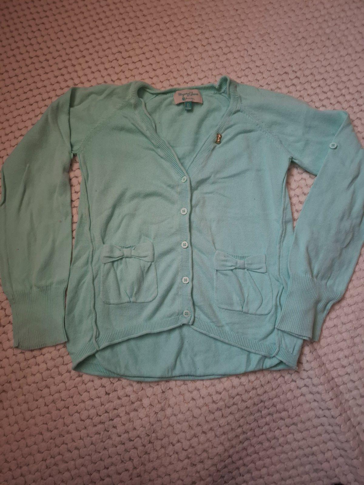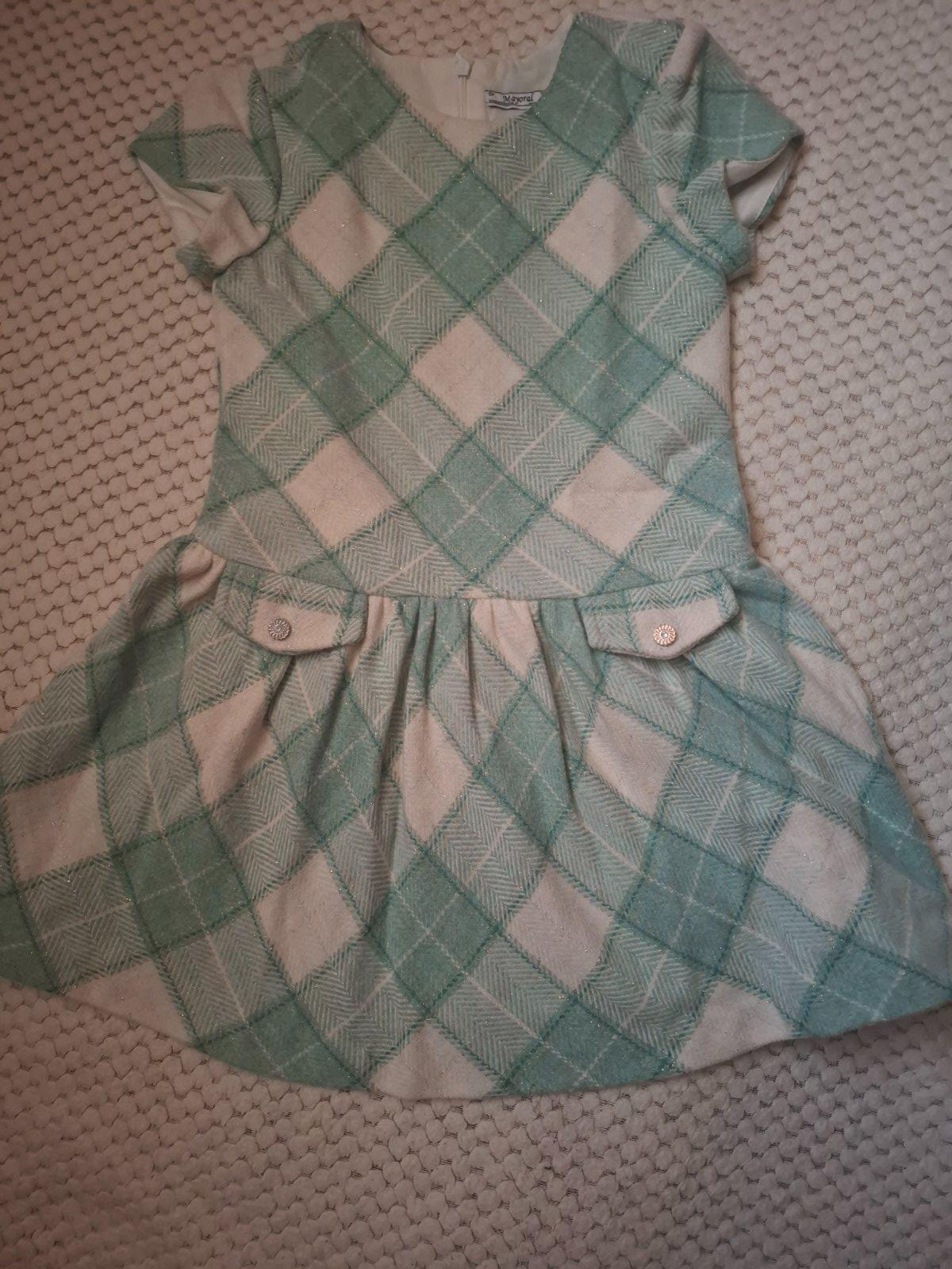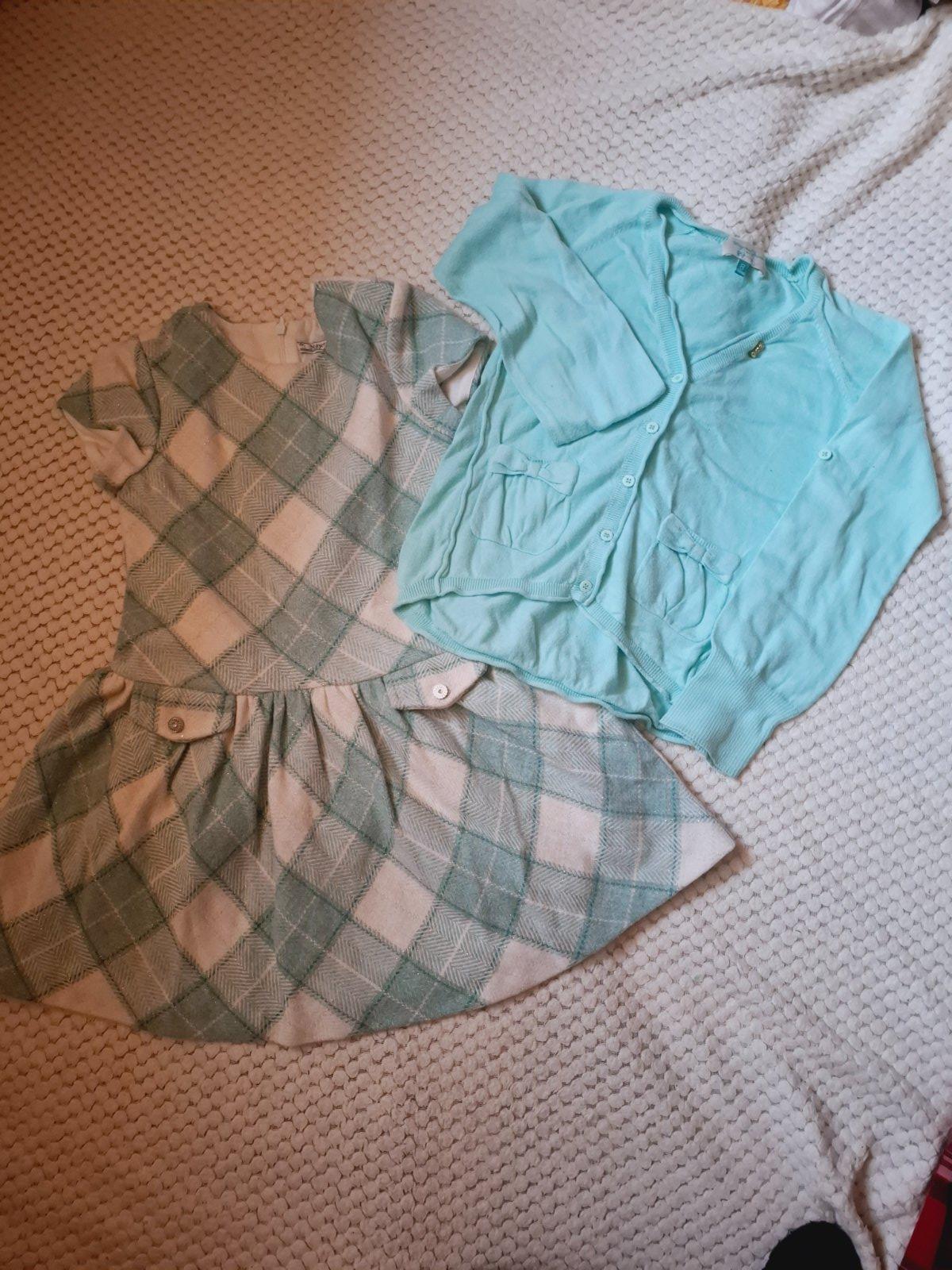 Pár krát oblečené šaty, teplé stav ako nové, vzadu zapínanie na zips , svetrík veľ .128 dobrý stav bez poškodenia .
