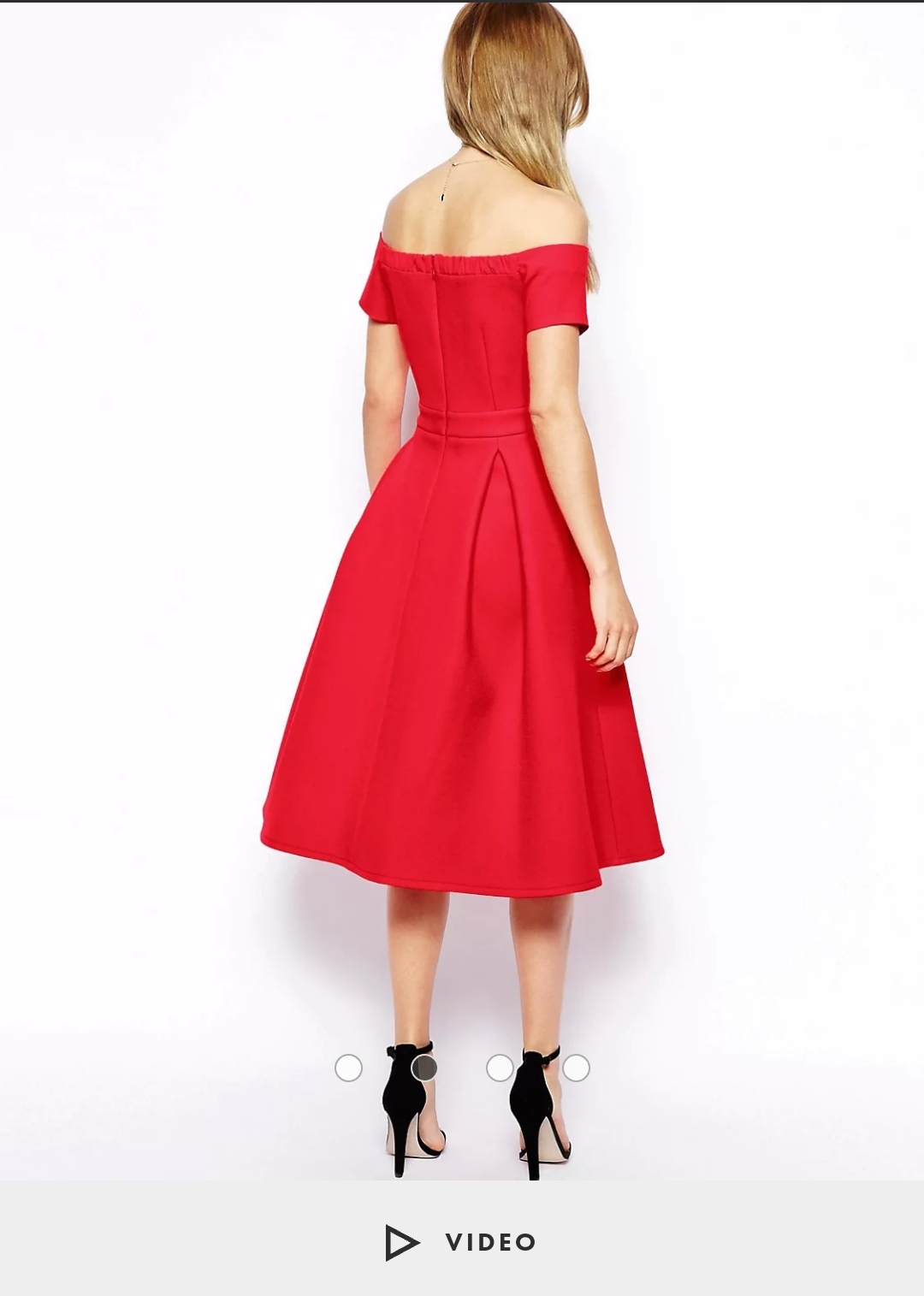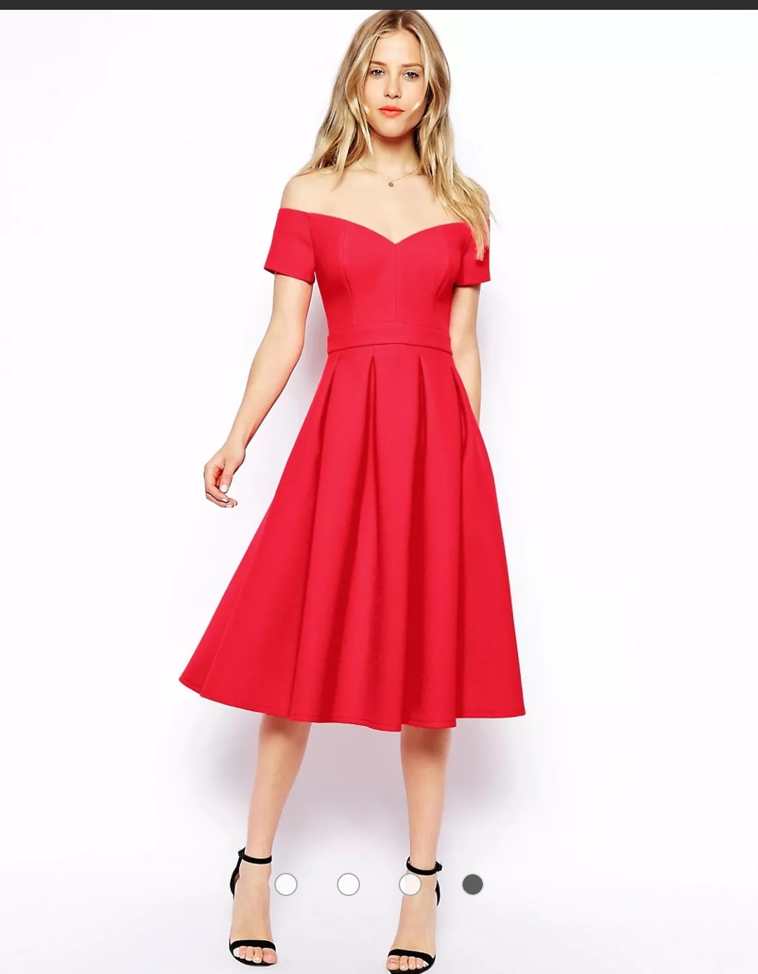 Elegantné červené midi šaty v nadčasovom fit & flare strihu, ktoré krásne zvýraznia pás a vytvoria ženskú siluetu. Odhalené ramená pôsobia romanticky a zároveň sofistikovane. Rozšírená sukňa so symetrickými záhybmi dodáva šatám objem a pohyb, vďaka čomu sú ideálne na špeciálne príležitosti.