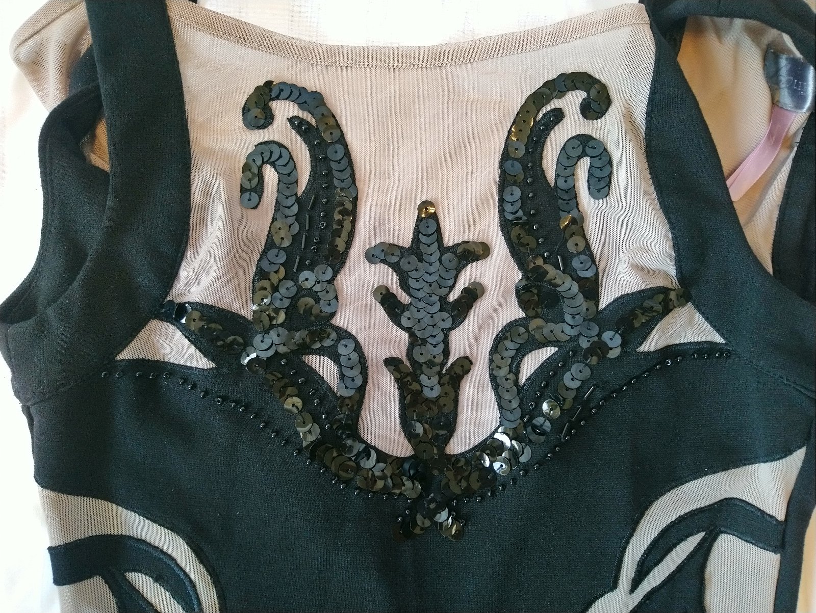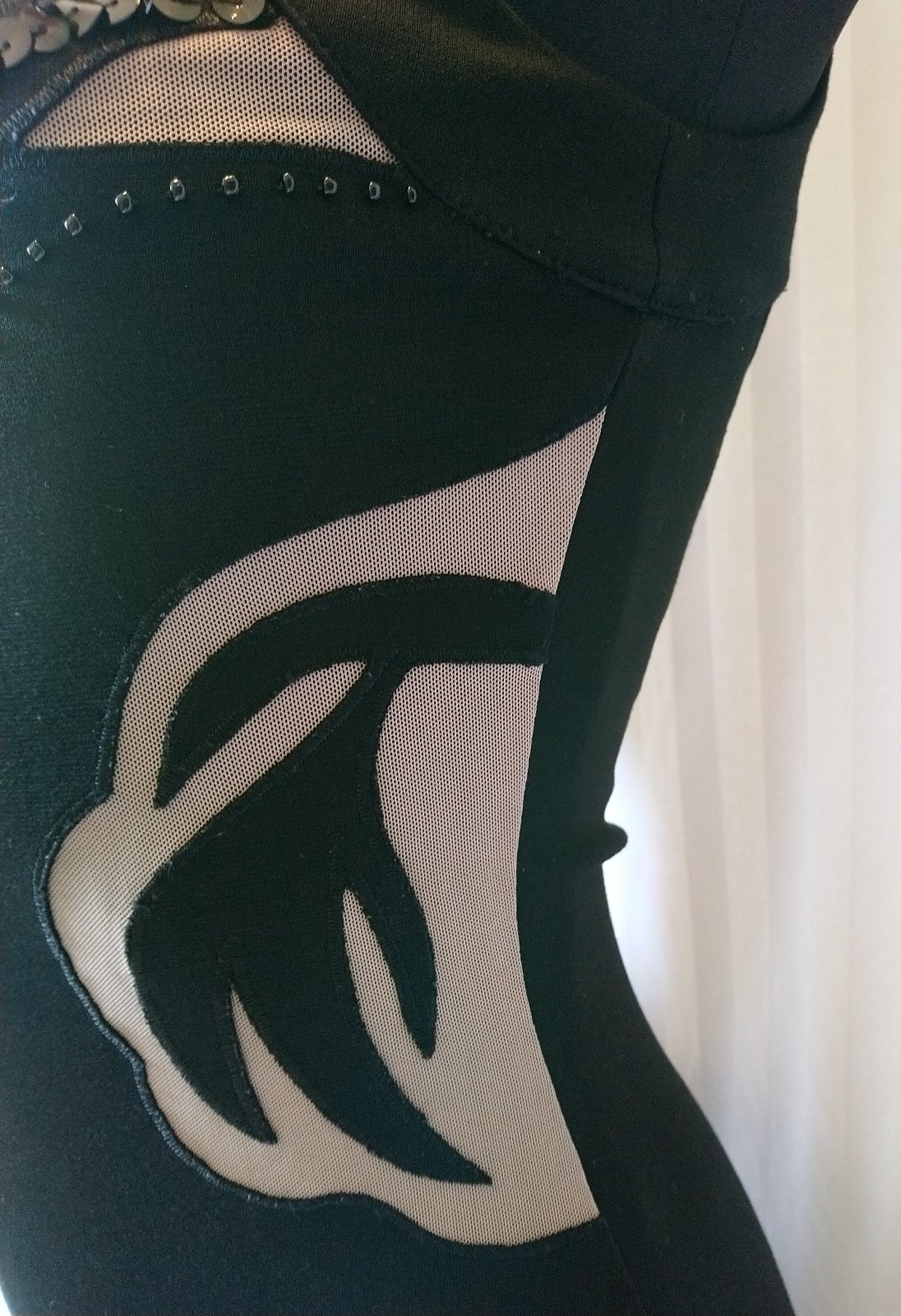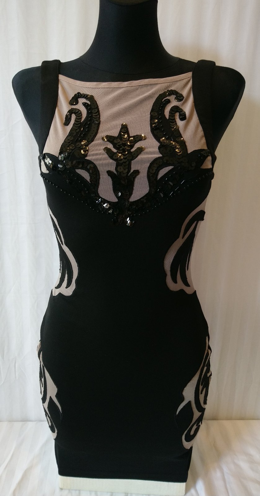 dámske elastické hnedo čierne šaty, vzadu zips, ozdobené flitrami a gorálkami - niektoré z nich chýbajú,