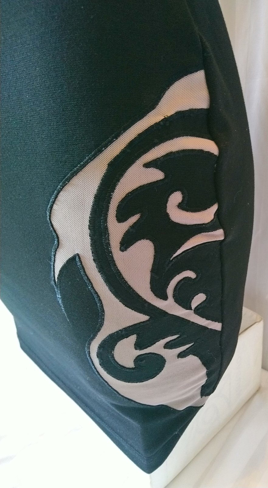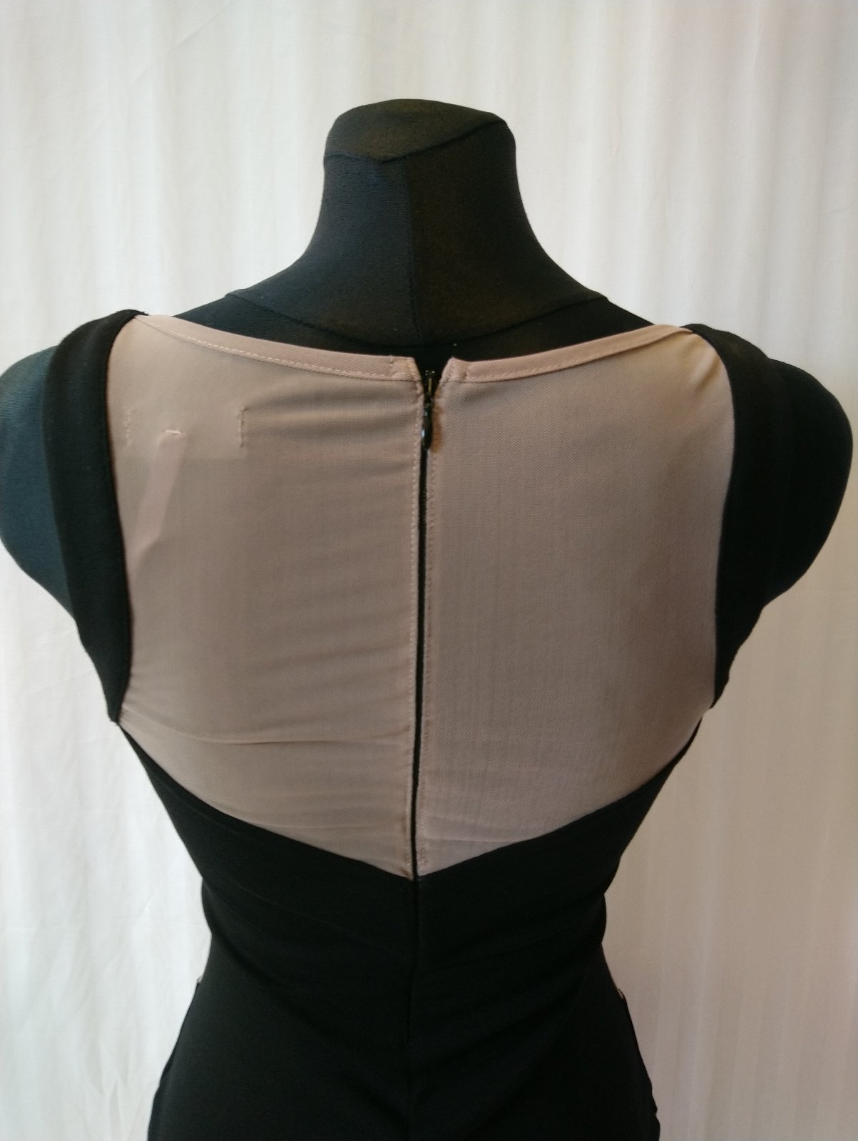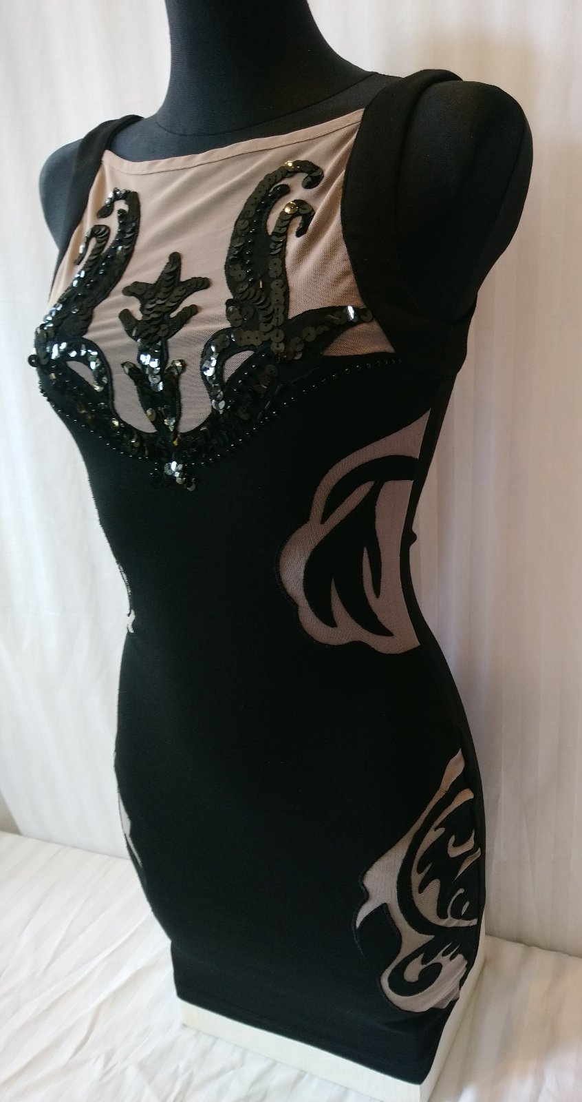 dámske elastické hnedo čierne šaty, vzadu zips, ozdobené flitrami a gorálkami - niektoré z nich chýbajú,