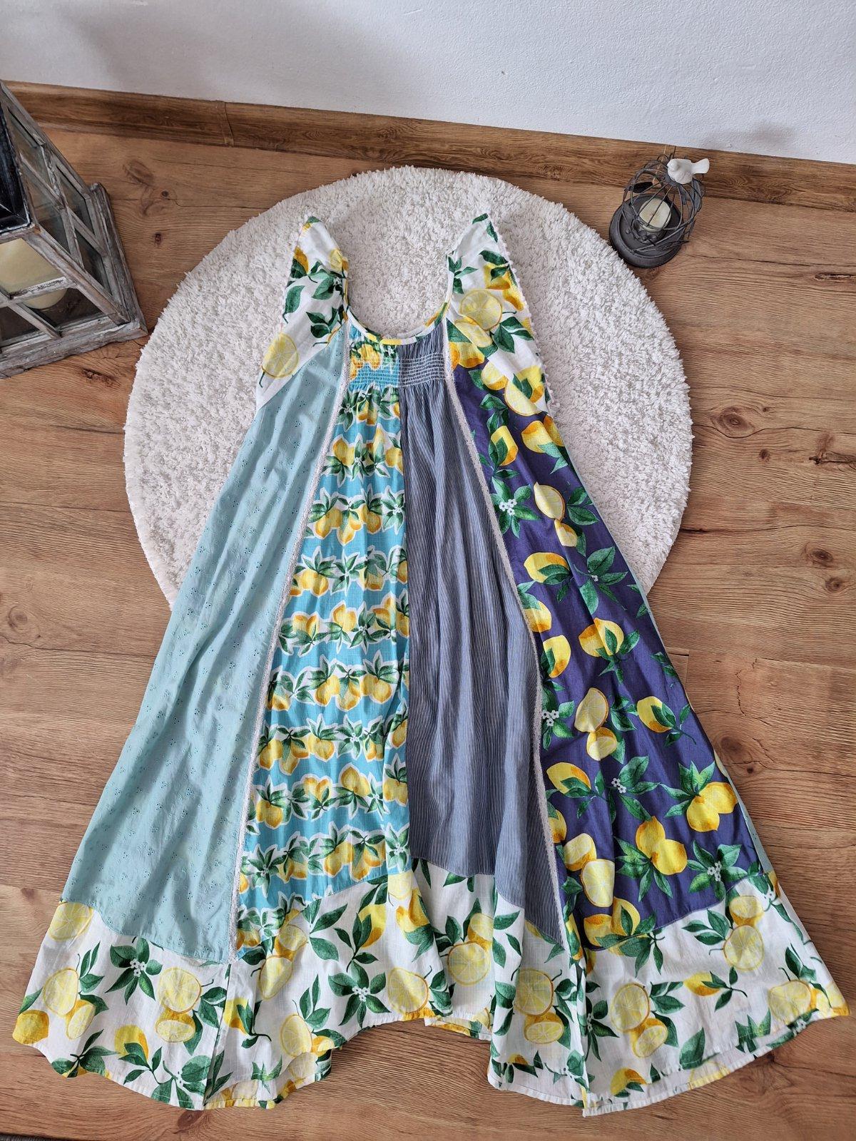 Letné šaty, veľmi pekné v dobrom stave, bez poškodení. Dĺžka- 101cm šírka pod pazuchami- 37cm x 2. Pod prsiami gumička. Zaujívamé ukončenie spodku šiat bombuľkami. Cena za kus 6 eur plus pošta.
