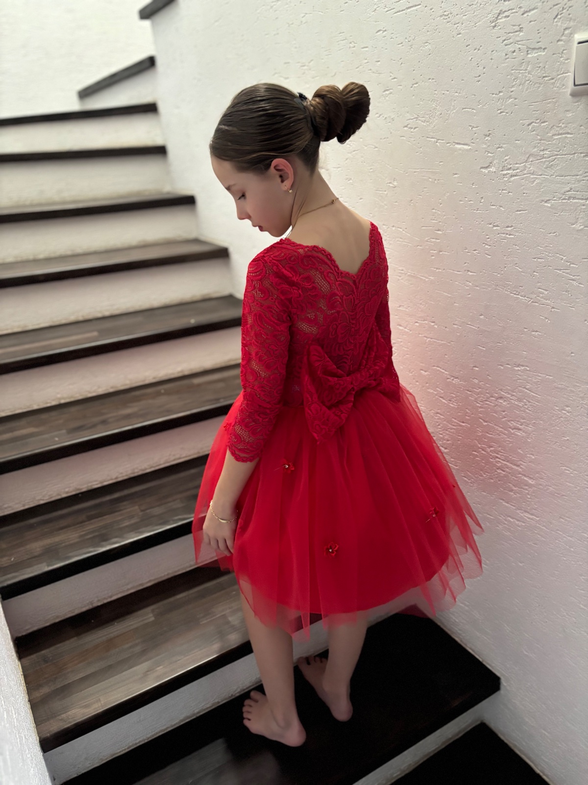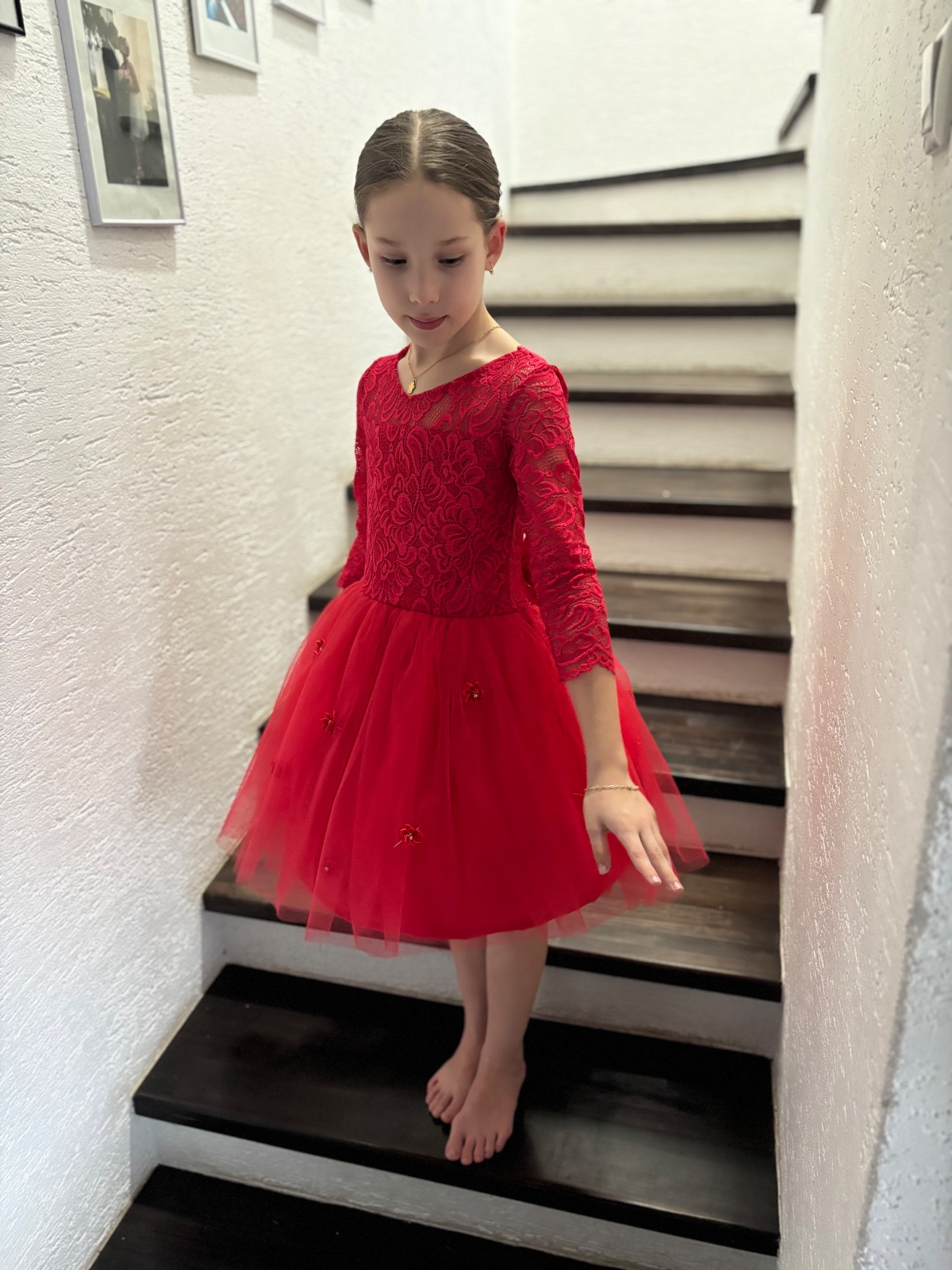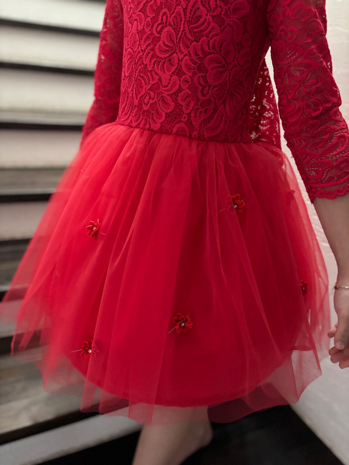 Krásna červená farba v kombinácii s elegantnými detailmi – vrchný diel z elastickej krajky s podšitým predným dielom a nádherným V výstrihom vzadu s lemovaním. 🌹Trištvrťové rukávy dodávajú šatám jemnosť a štýlový nádych. Sukienka je kruhová, nadýchaná a na tyle zdobená nádhernými červenými látkovými kvetinkami.