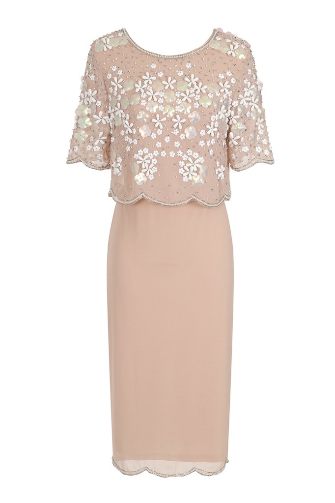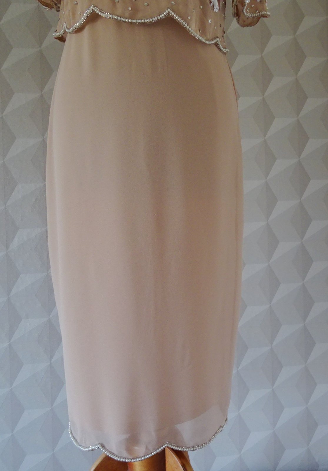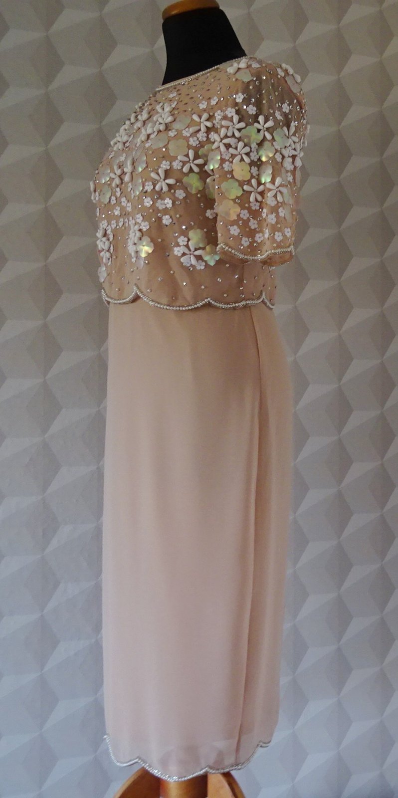 Tieto lichotivé šaty strednej dĺžky majú vrubkované lemy a živôtik zdobený bielym, krištáľovým a perleťovým zdobením. - vrstvené šaty ručne vyšívané flitrami a umelými perlami - okrúhly výstrih - Podšité - Úzky strih -