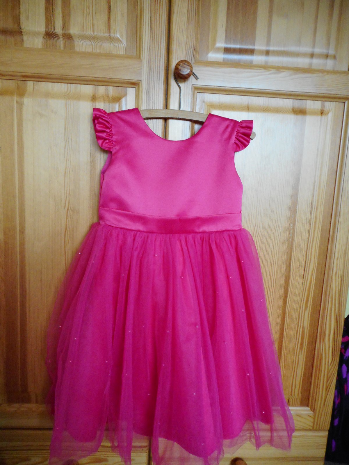 predám minimálne používané v top stave krásne slávnostné dievčenské šaty fuksiovej farby s tylovou podšitou sukničkou s gorálkami veľkosť 140cm, vrchná časť je z pevného materiálu s prestrihnutím pod prsiami, bez rukávou, vzadu na chrbátiku výtrih v tvare písmena V, prestrihnutie vpredu je vzadu ukončené veľkosť mašľou, ktorá sa pripína na patentky, celková dĺžka šiat je 77cm, dĺžka sukne od prestrihnutia 51cm, šírka šiat v časti prestrihnutia aj pod pazuchami je rovnaká 35cm