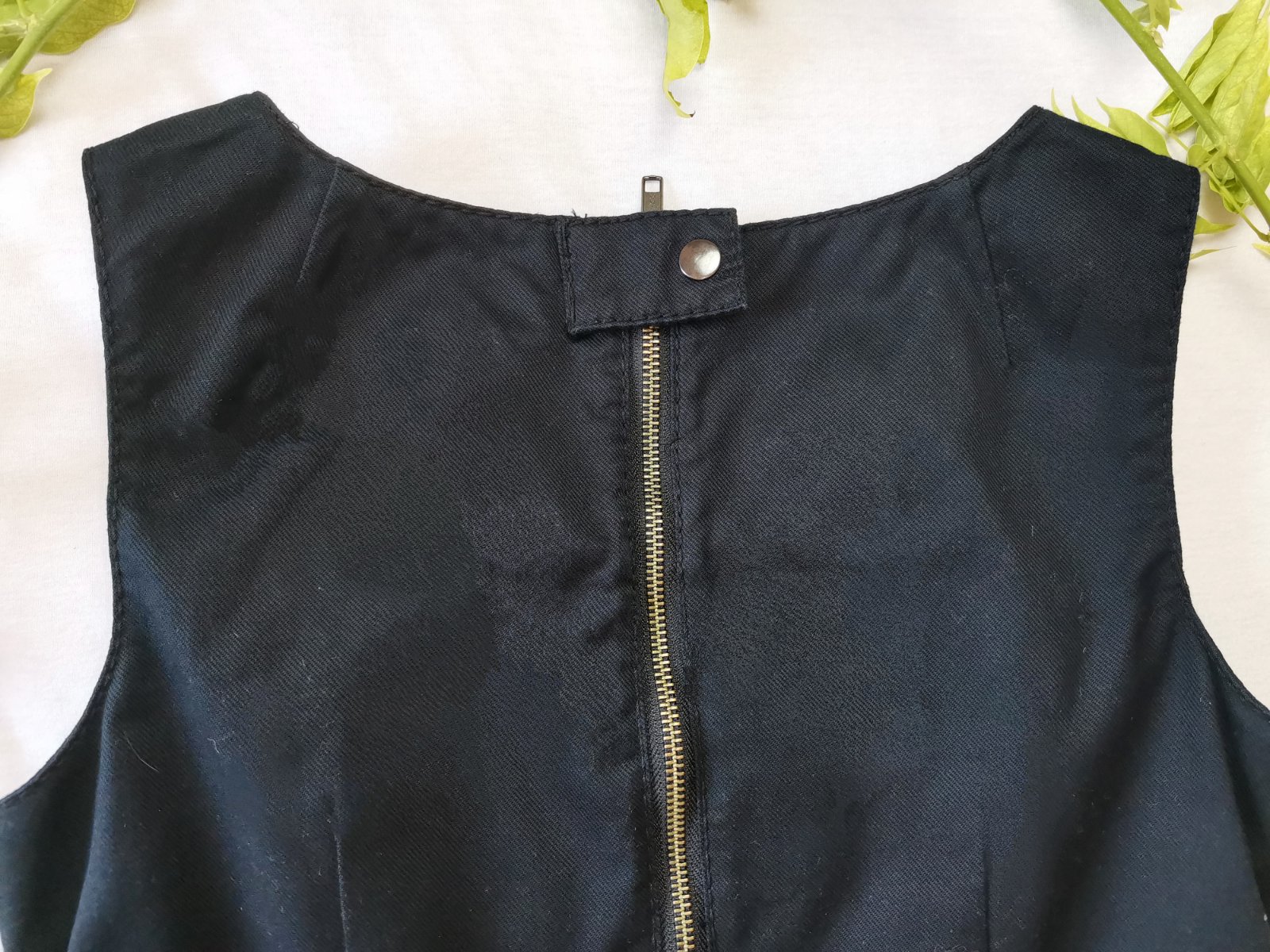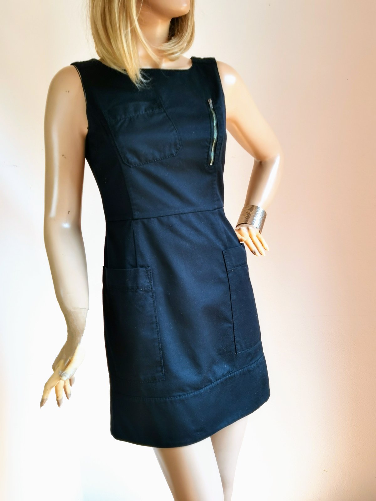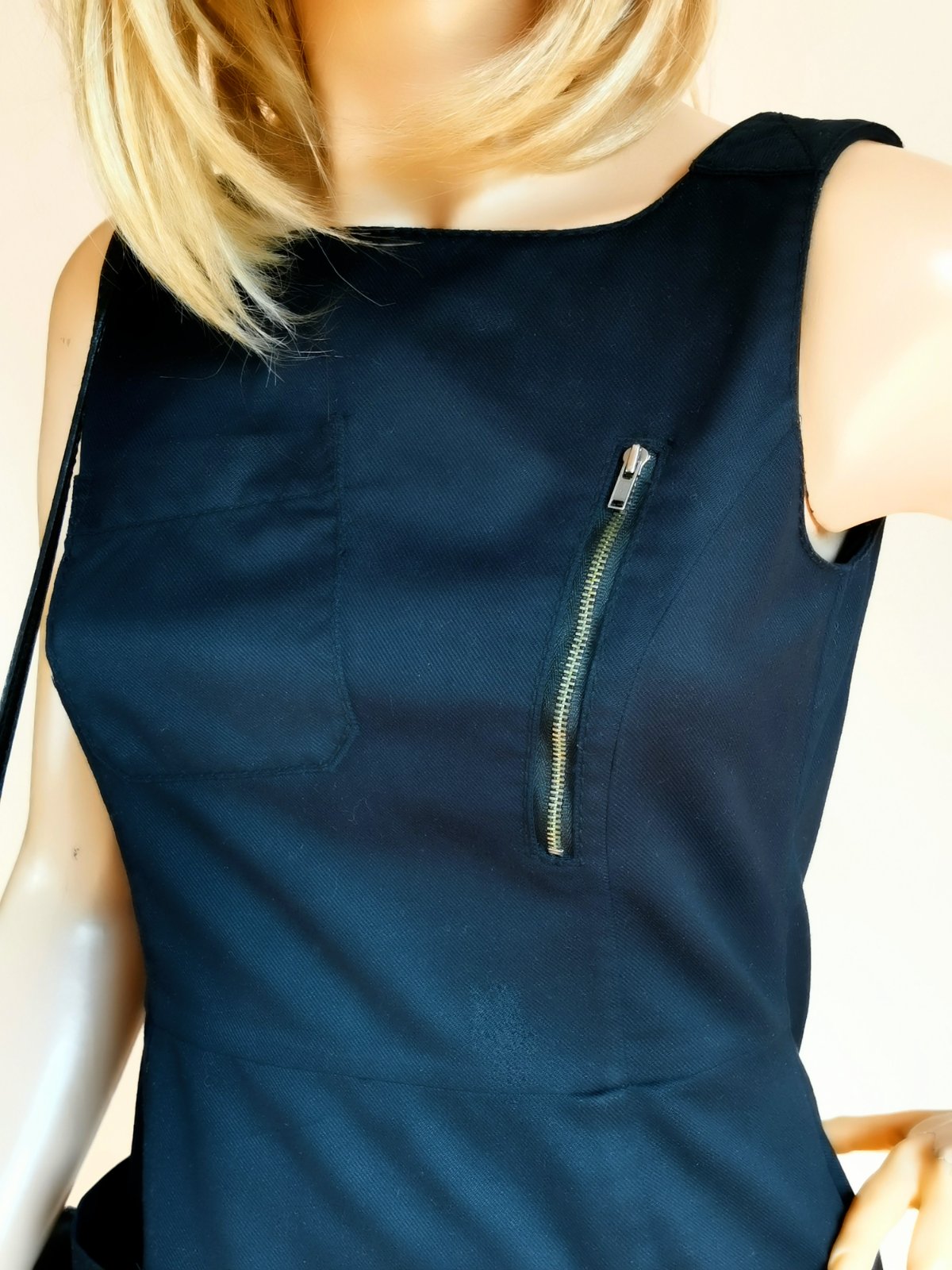 Ponúkam šaty z čistého bavlneného kepru v sýtej čiernej farbe s ozdobnými švami, so zipsíkom na hrudi a našitými vreckom, hranatým výstrihom, širokými ramienkami a rovnou sukňou s veľkými vreckami. Zapínanie na zips s patentným gombíkom na chrbte.