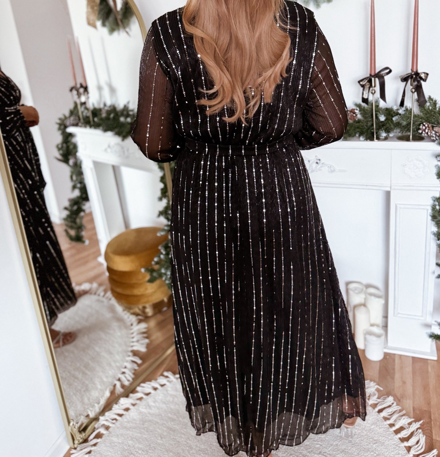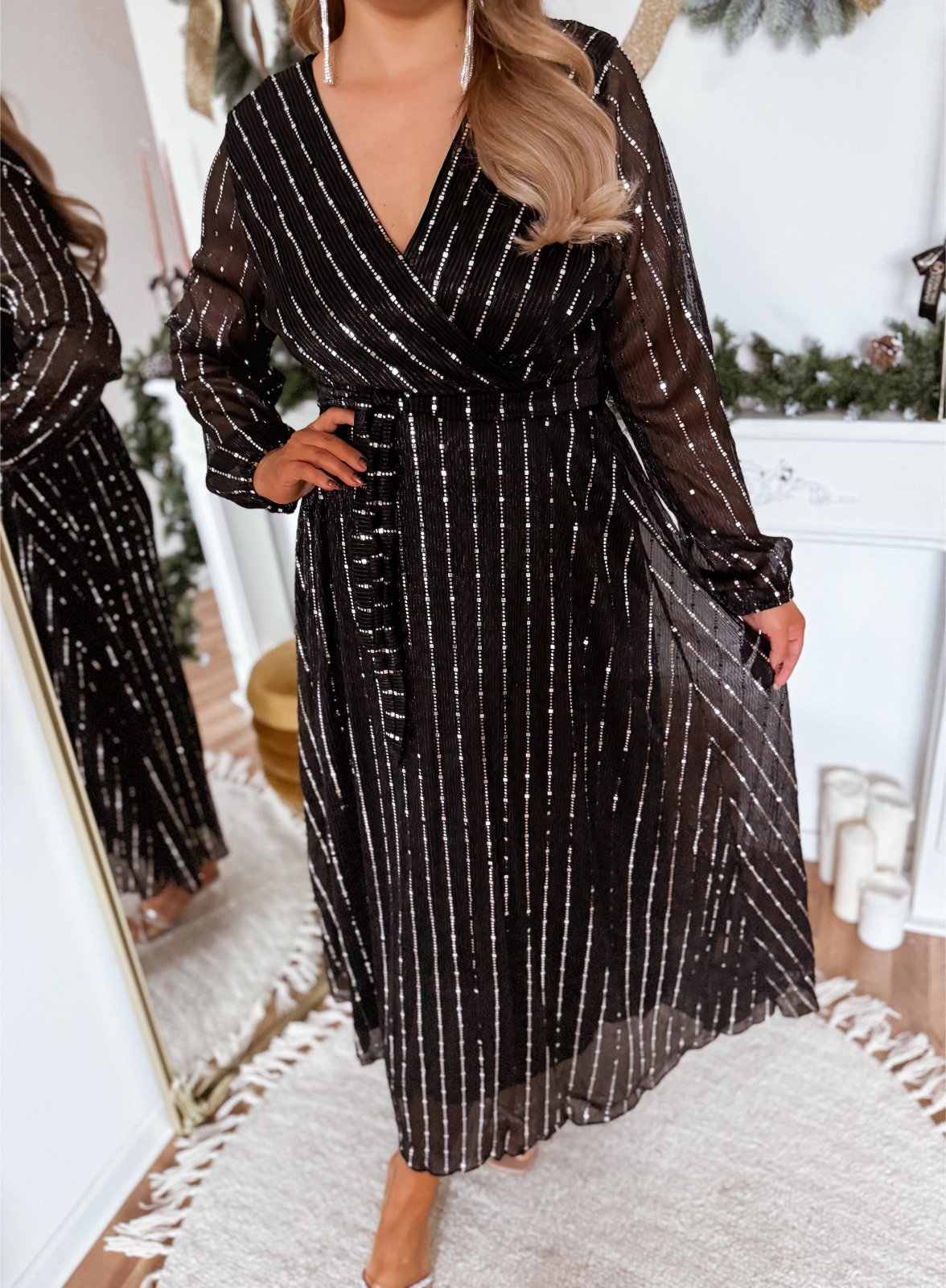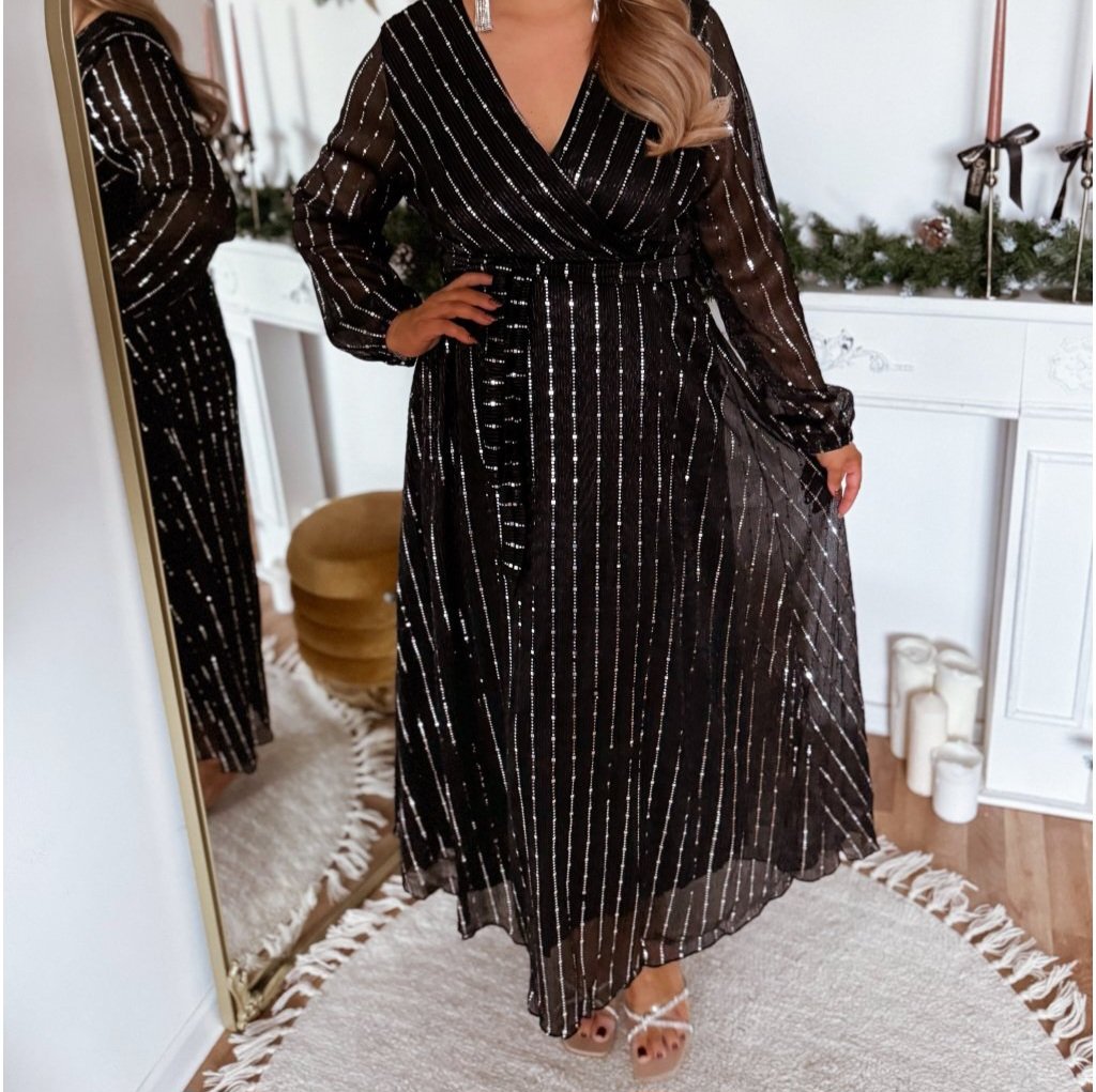 Dlhé spoločenské dámske šaty s gumičkou v páse a výstrihom do V. Na šatách sú našité strieborné trblietky . Veľkosť : XL/2XL- prsia 105-125 cm, pás 80-100 cm, boky sú voľné, celková dĺžka 130 cm. Nové s výsačkou. PC 45€.