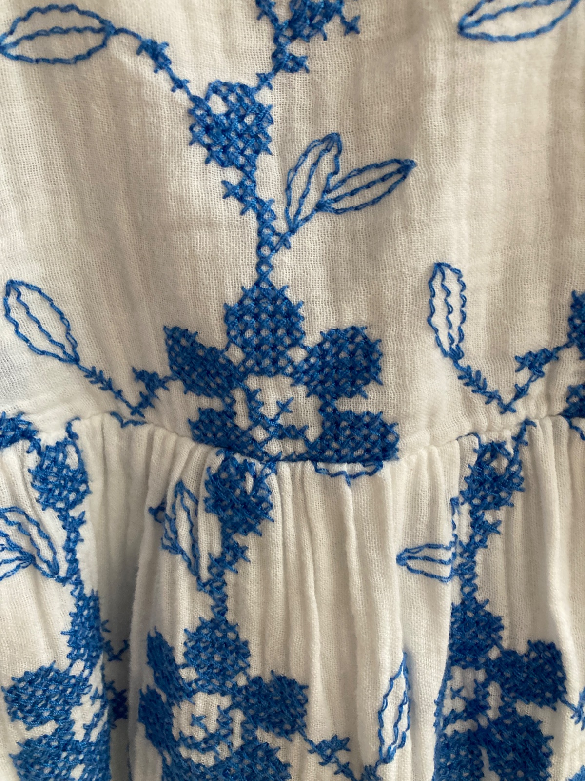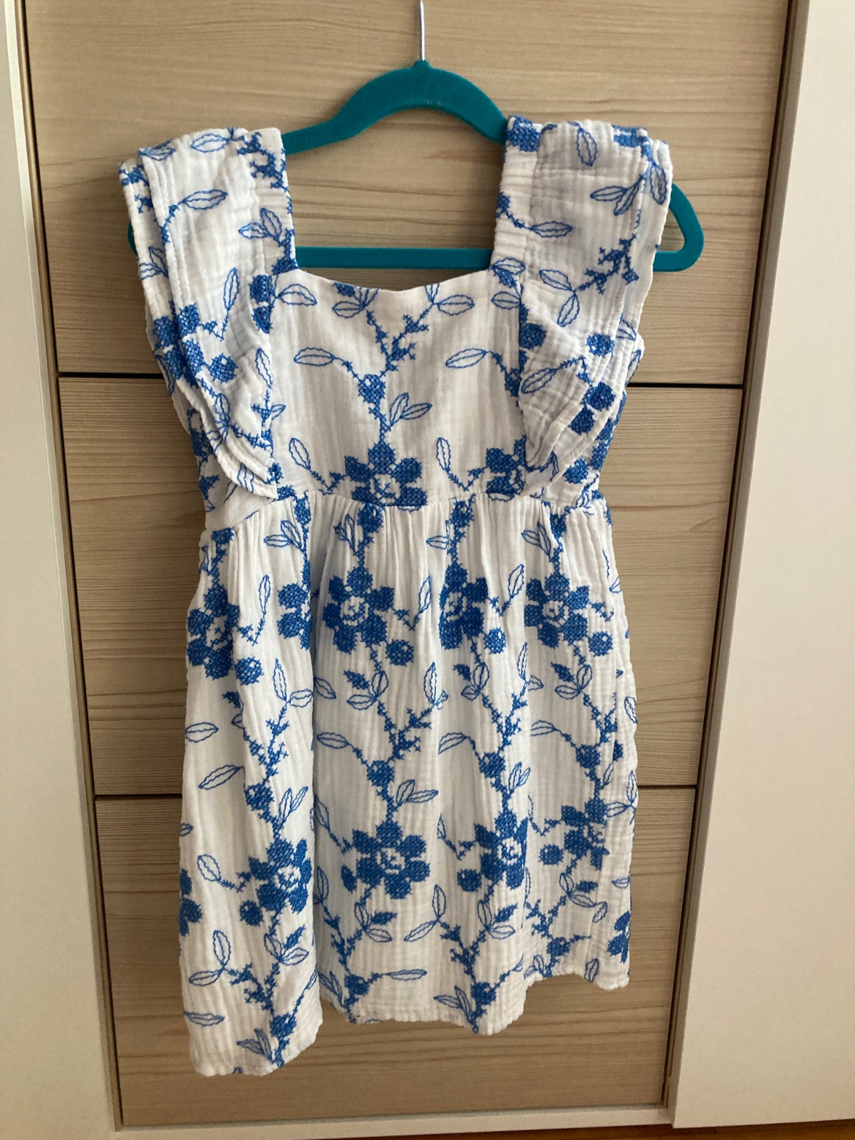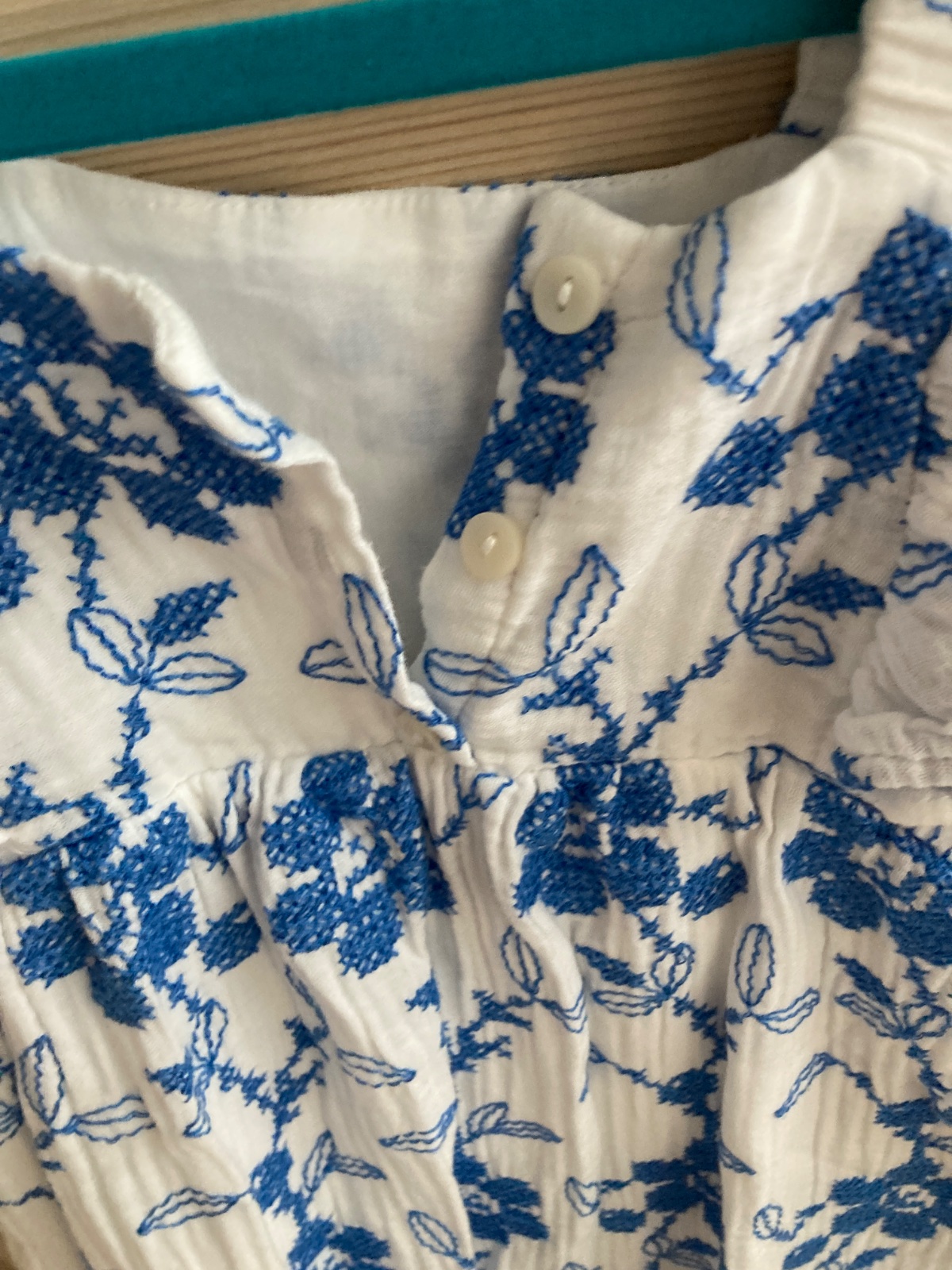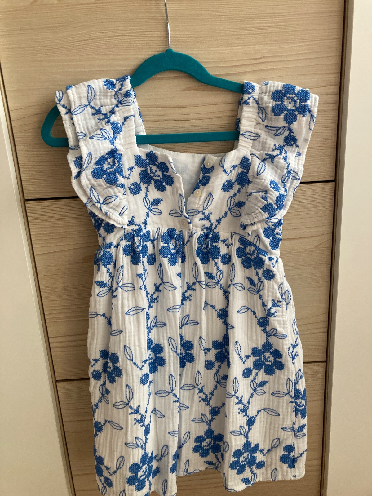 Ponukam na predaj letne saty Zara s modrou výšivkou. Vŕšok zdobia volany okolo ramien. Vzadu na chrbatiku zapínanie na gombíky, ktoré uľahčuje obliekanie. Pod vyšívanou vrstvou latky sa nachádza ešte jedna vrstva. Kupované nové, nosene príležitostne 1 dieťaťom. Bez poškodení či známok nosenia, ako nové. Visacka udava velkost 116, dcérka nosila uz ako 110 a potom aj 116.