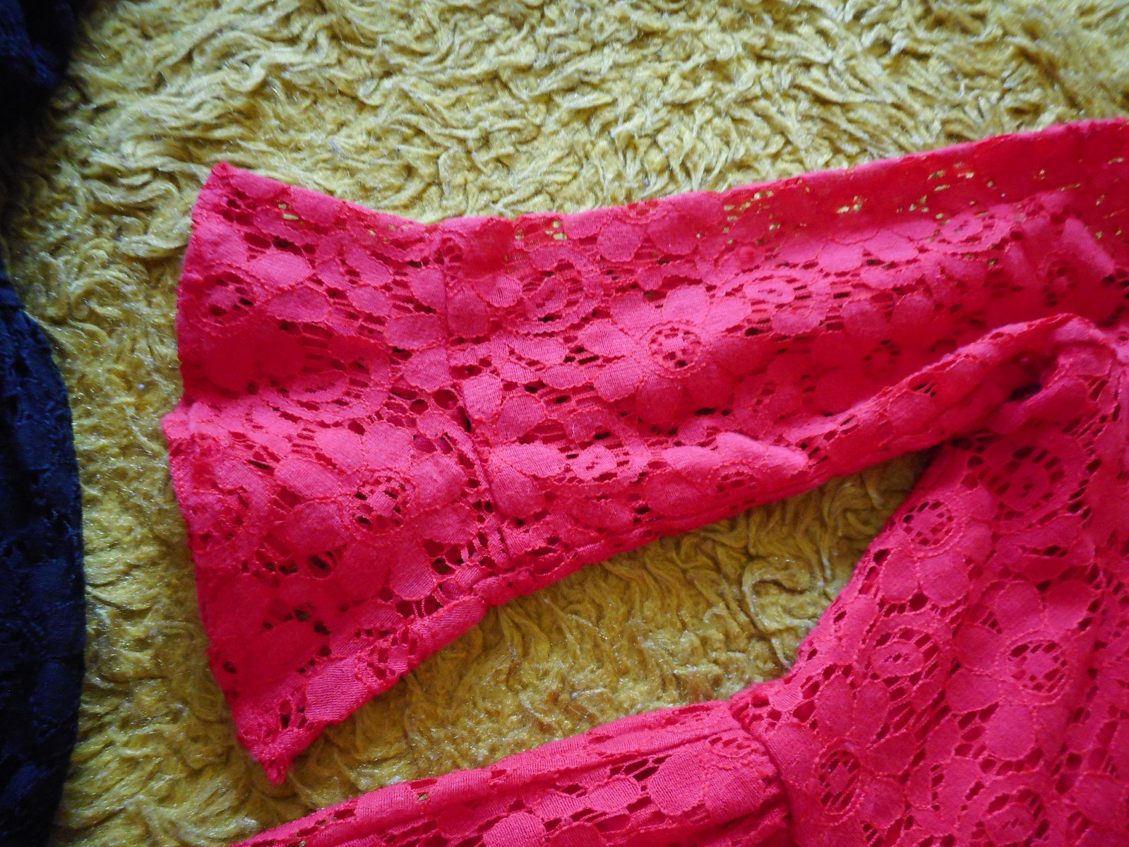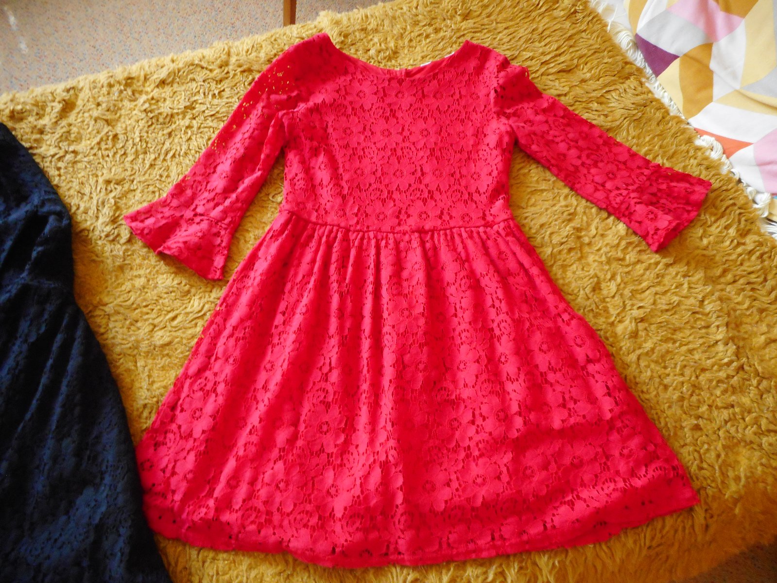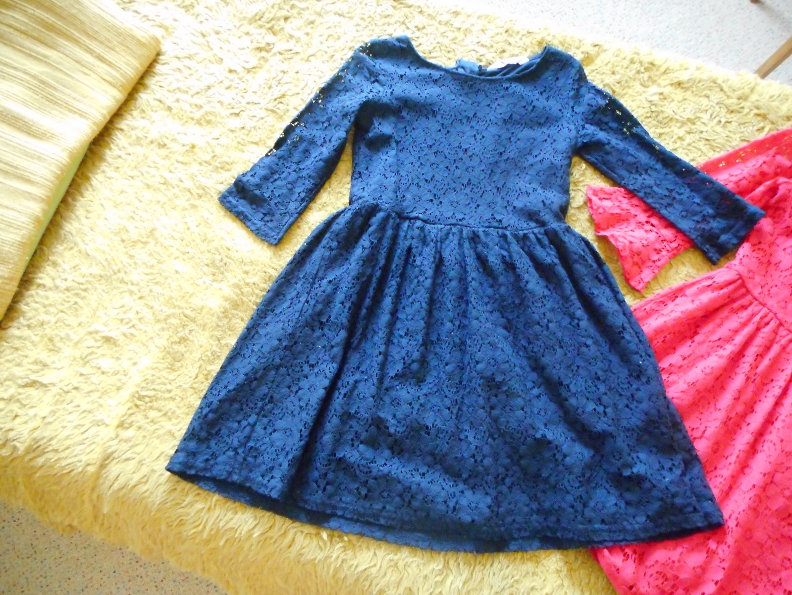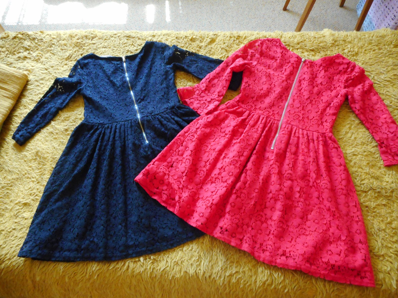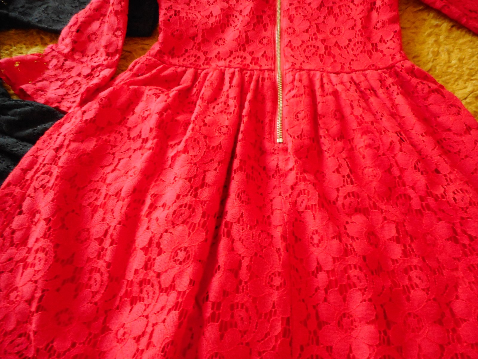 predám 2ks používané, nepoškodené krásne slávnostné čipkované šatočky pre dievčatko červenej a čiernej farby zn. H&M veľkosť podľa štítku 152cm, alebo 11-12 rokov, ale záleží od postavy dievčatka, moja nosila v 9-10 rokoch, celková dĺžka pri oboch šatách je 76cm, pás je pevný 34cm, šírka pod pazuchami je 36-37cm, látka je pružná, ešte sa trošku natiahne, obliekanie cez hlavu, vzadu na chrbte nekrytý kovový zips, obe šaty majú 3/4 rukávy, červené majú rukáv ukončený volánom , predávam len spolu