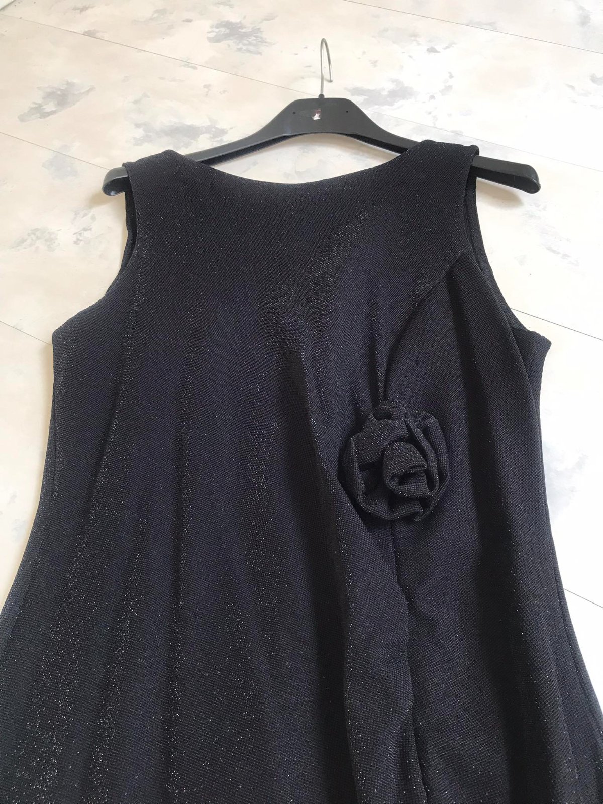 krásne a štýlové sýtočierne spoločenské šaty,super materiál,jemný lurexový streč,vpredu na boku rozporok,pekne sedia na postave,na boku jemne nariasené a ozdobené jemným kvietkom z tej istej látky,sem-tam frknuté jemným strieborným akoby "popraškom " - top kúsok,pc = 95 eur