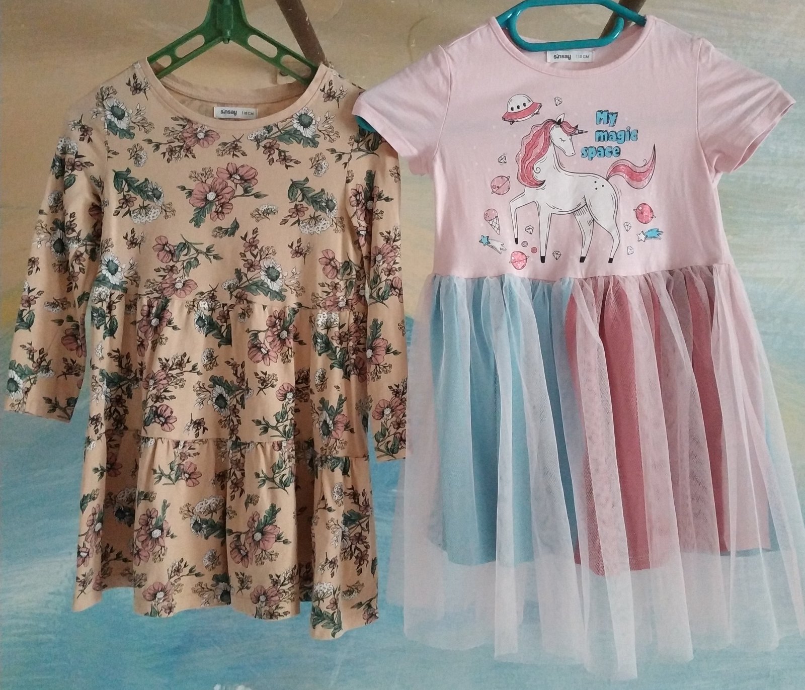Dievčenské šaty vo veľkosti 110, pár krát oblečené, bez fľakov a dier. Cena spolu 4 € plus poštovné alebo osobný odber.