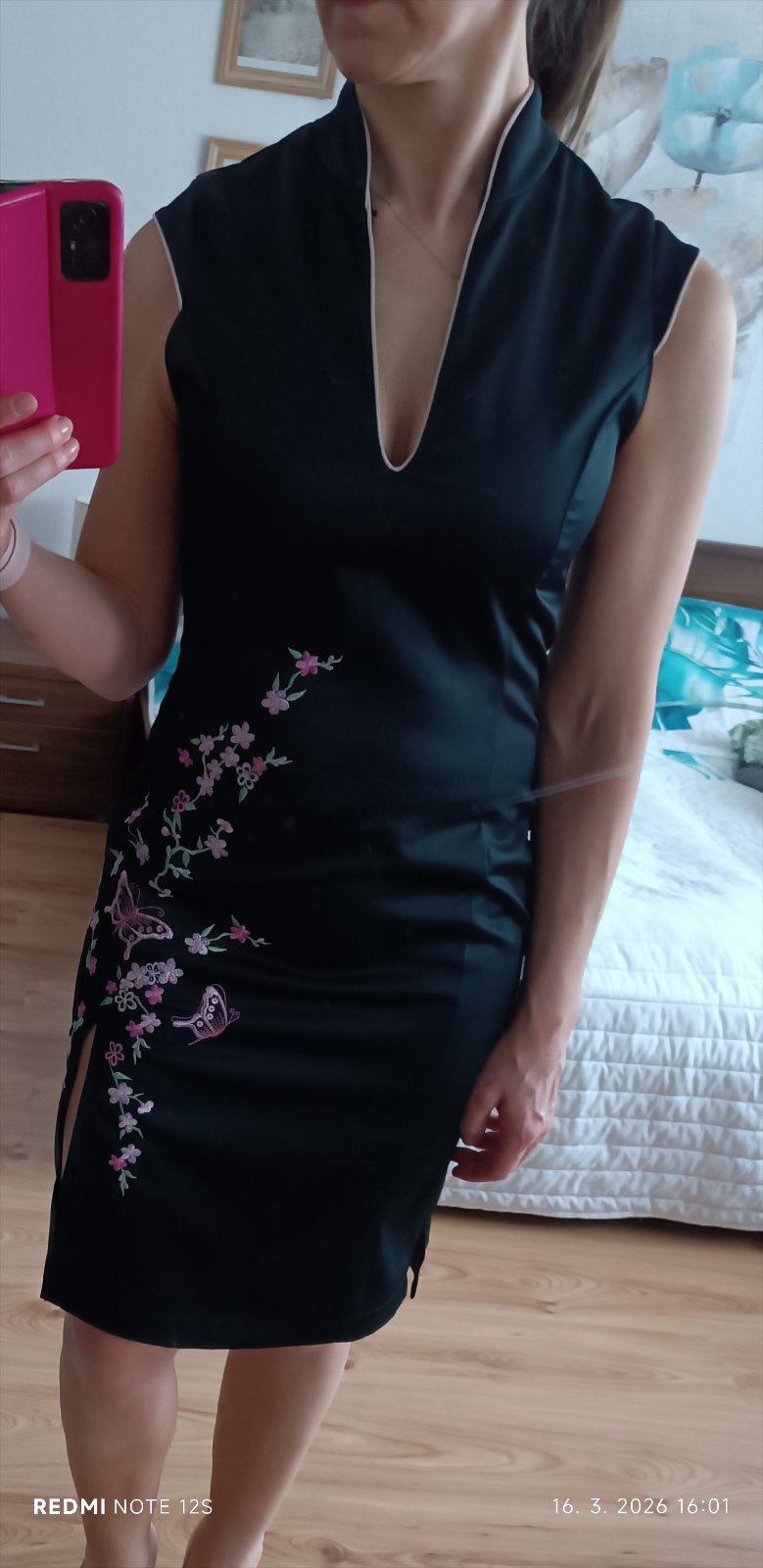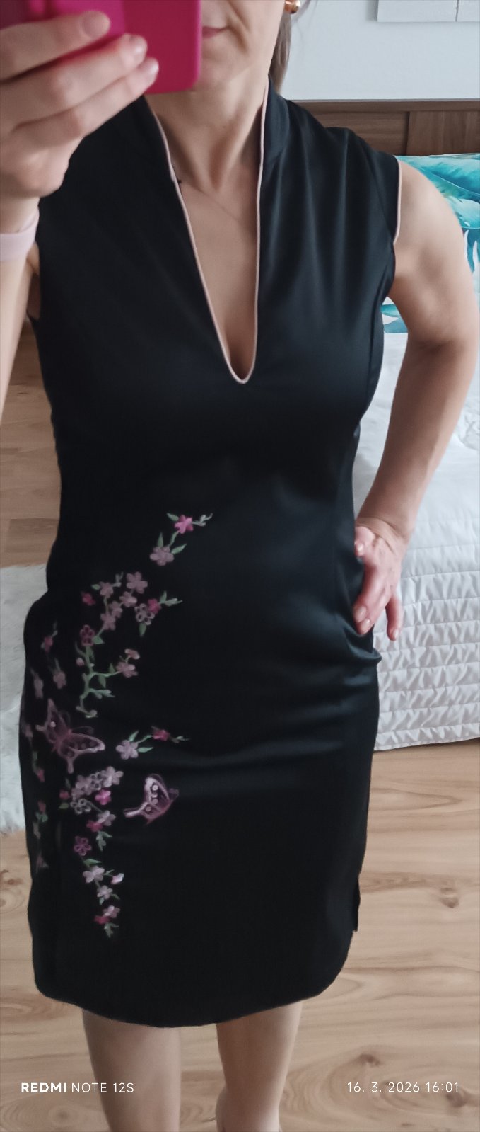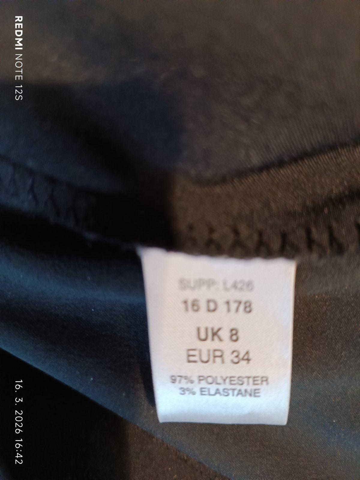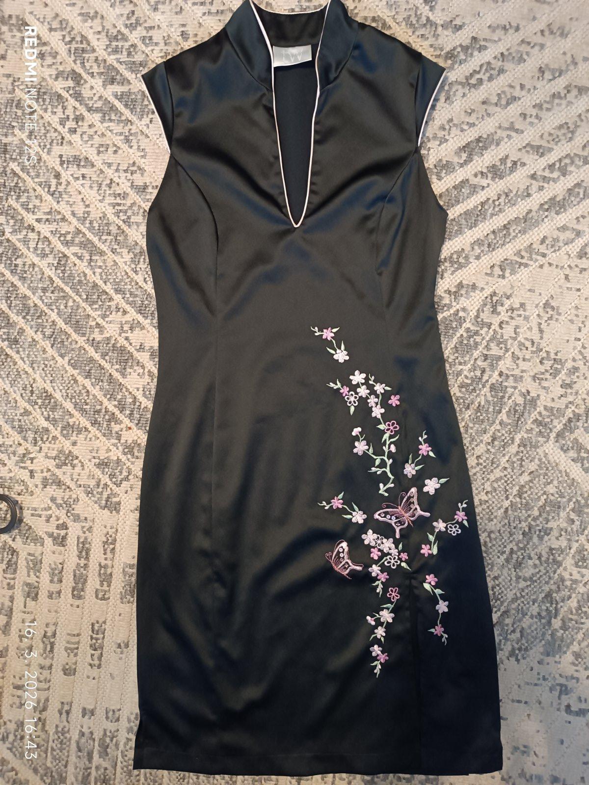 Veľkosť uvedená 34, ale spodok sedí na M, v pleciach sú menšie. Šaty majú stojačik, rozparok, zapínajú sa na zips.