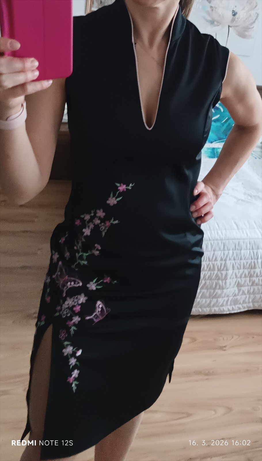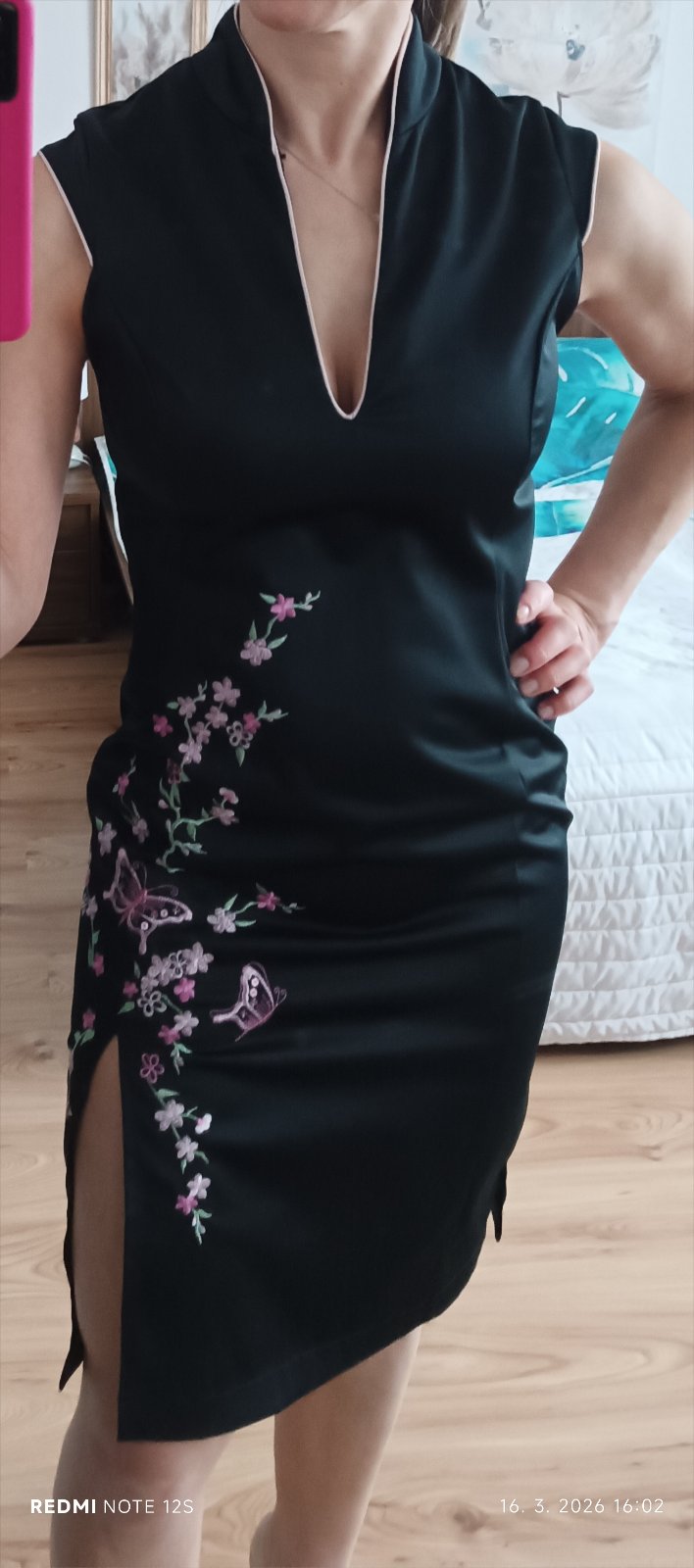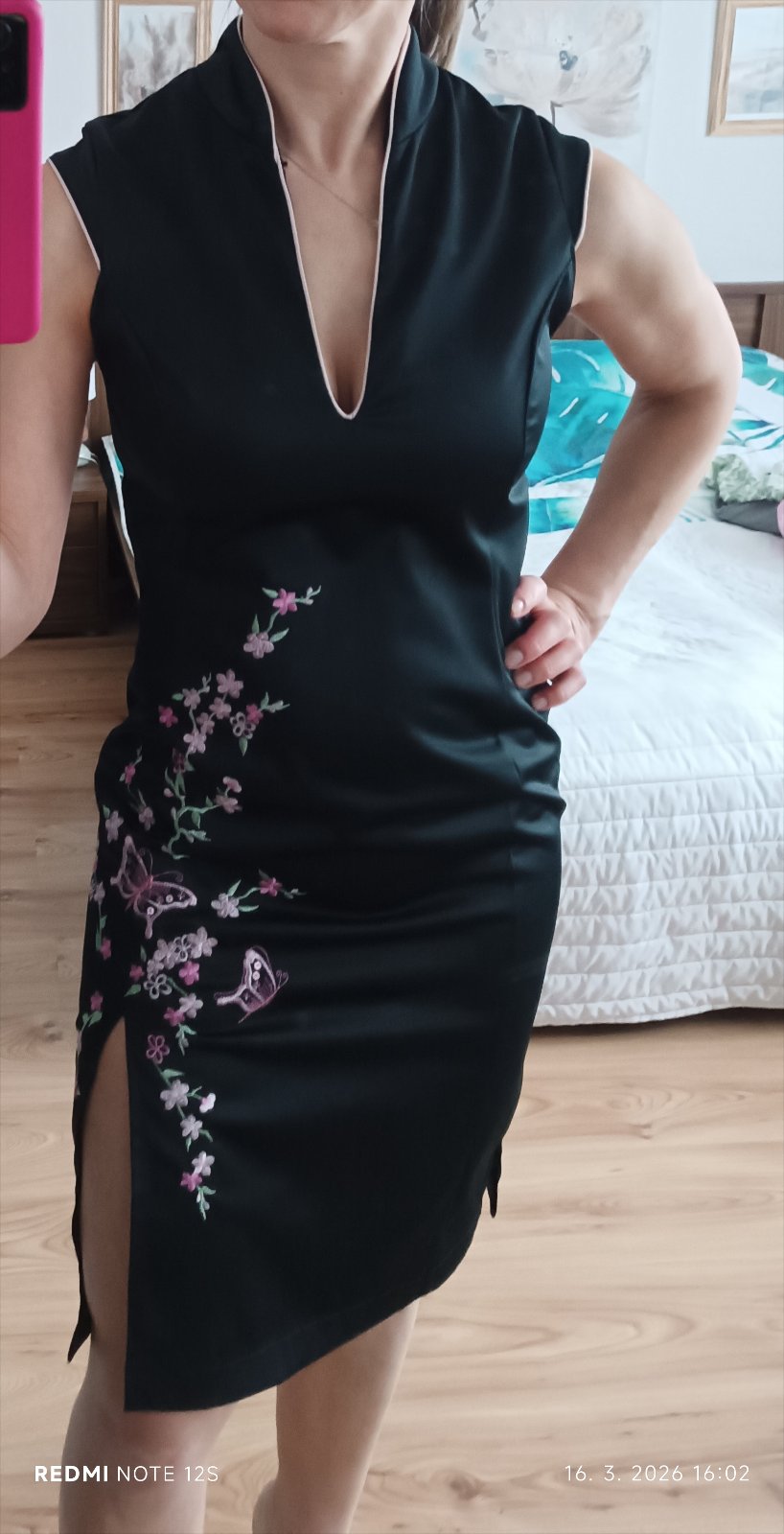 Veľkosť uvedená 34, ale spodok sedí na M, v pleciach sú menšie. Šaty majú stojačik, rozparok, zapínajú sa na zips.