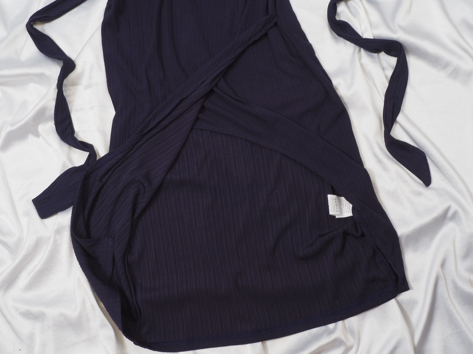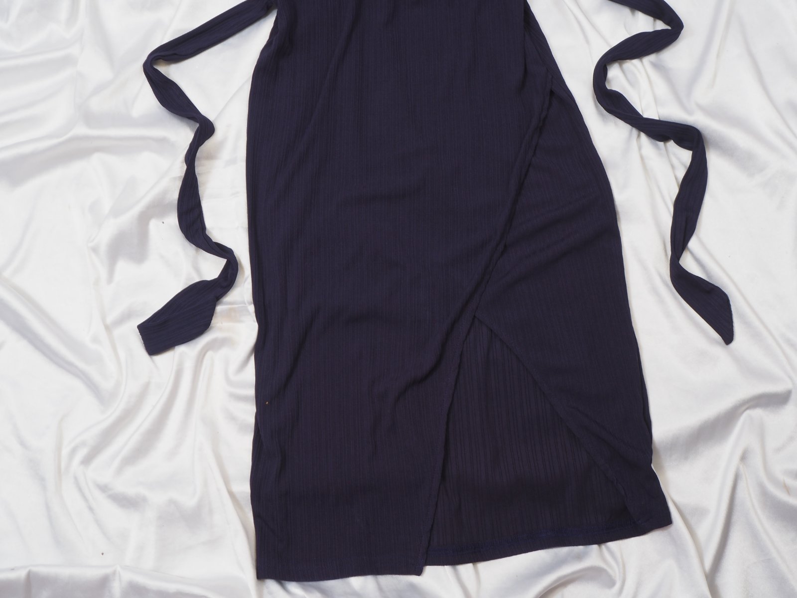 Kvalitné úpletové šaty, tmavomodrej farby, v páse všitý opasok, sukňová časť prekrížená, super stav.