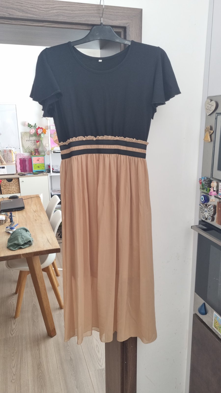 Úpletové maxi šaty. Spodný diel sa zakončuje do oblúka. Bočné vrecká. Bez známok nosenia. Dĺžka 153cm. Dĺžka od prieramku k prieramku 59cm 2x