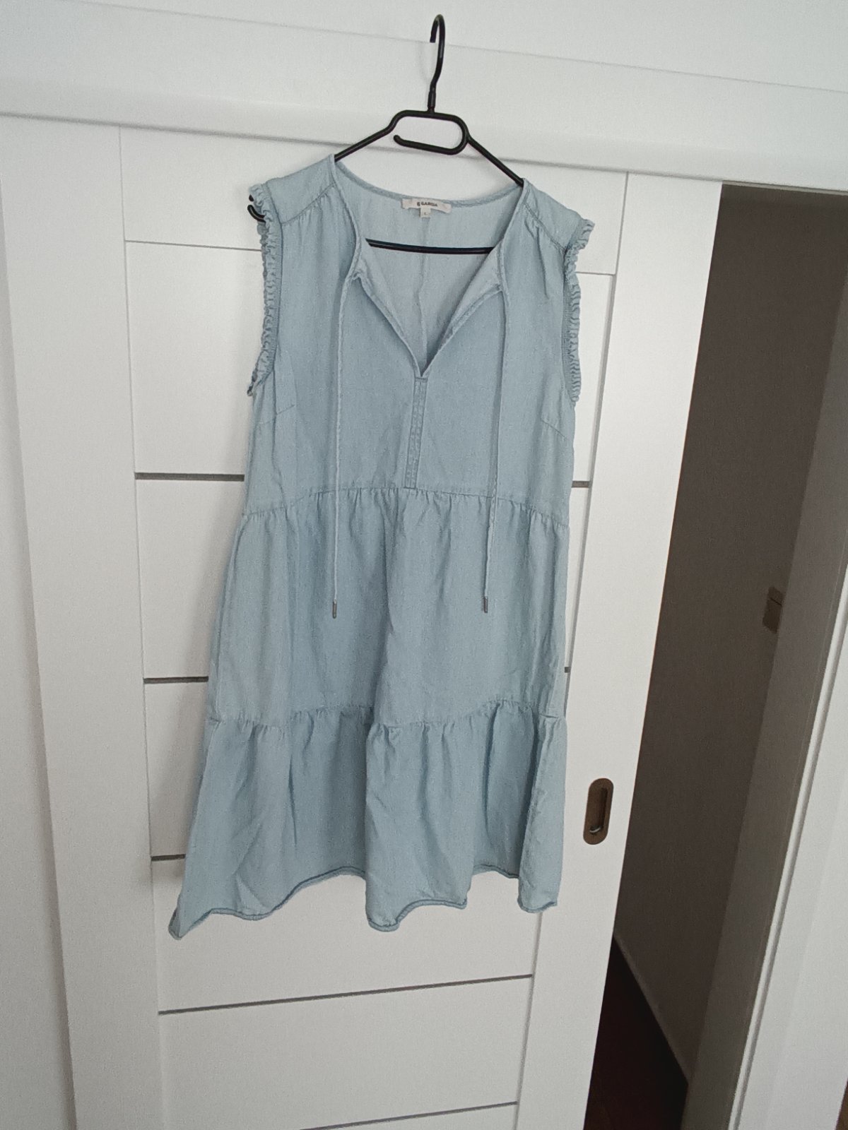 Ponúkam pár krát oblečené šaty sadnú na lko, mne sú už žiaľ väčšie:(, ospravedlňujem sa, že nie sú vyžehlené, farba svetlo modrá a riflovina tenká:) sú kvalitné.