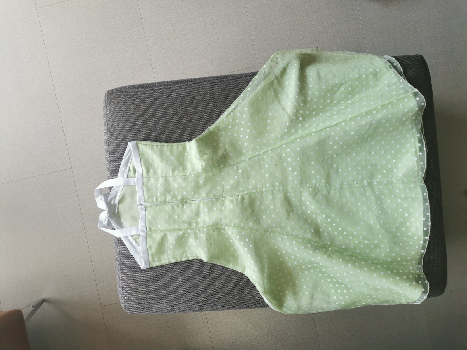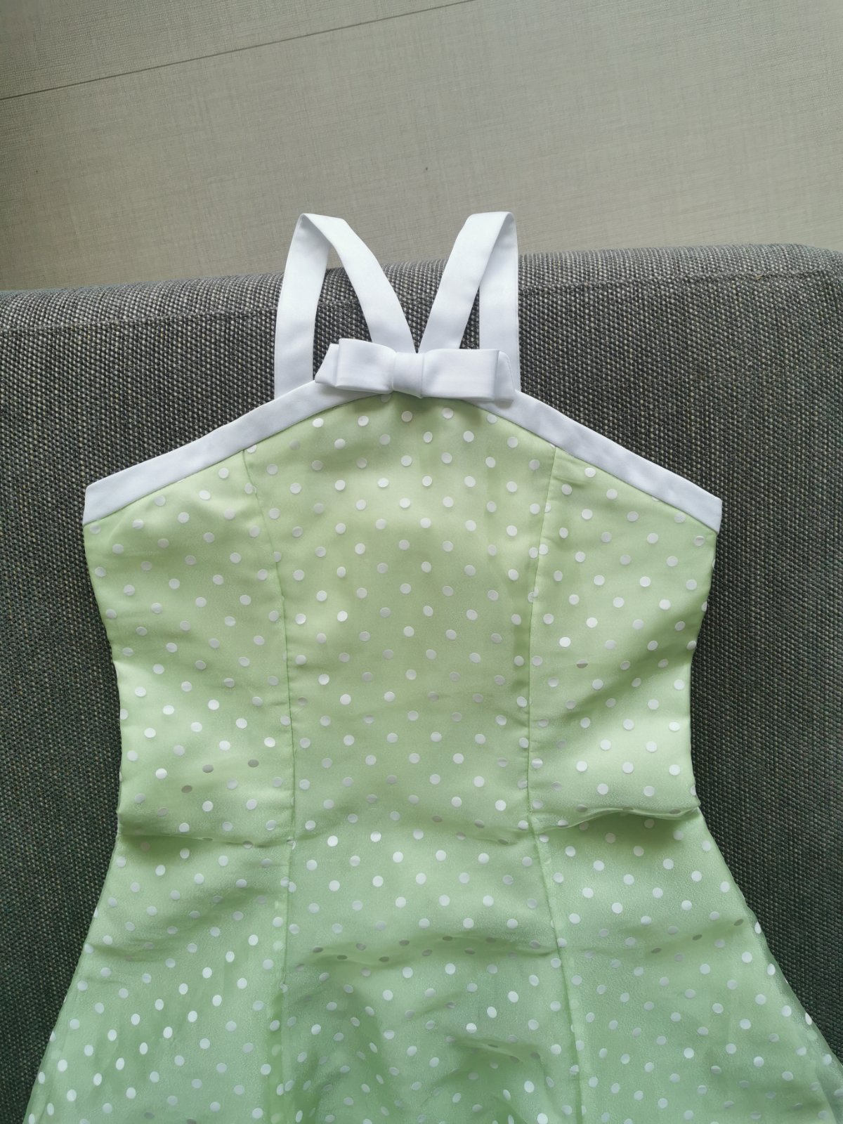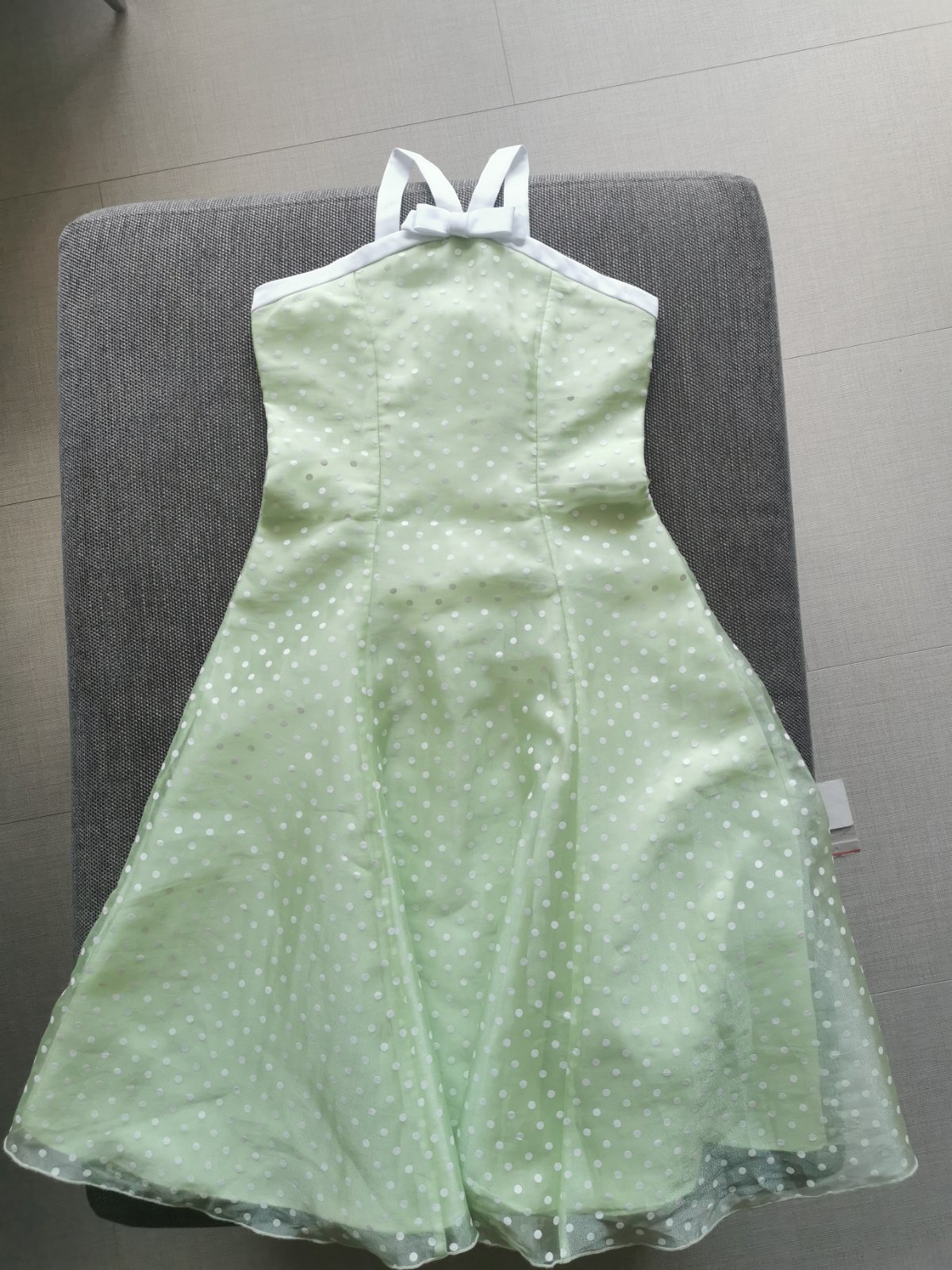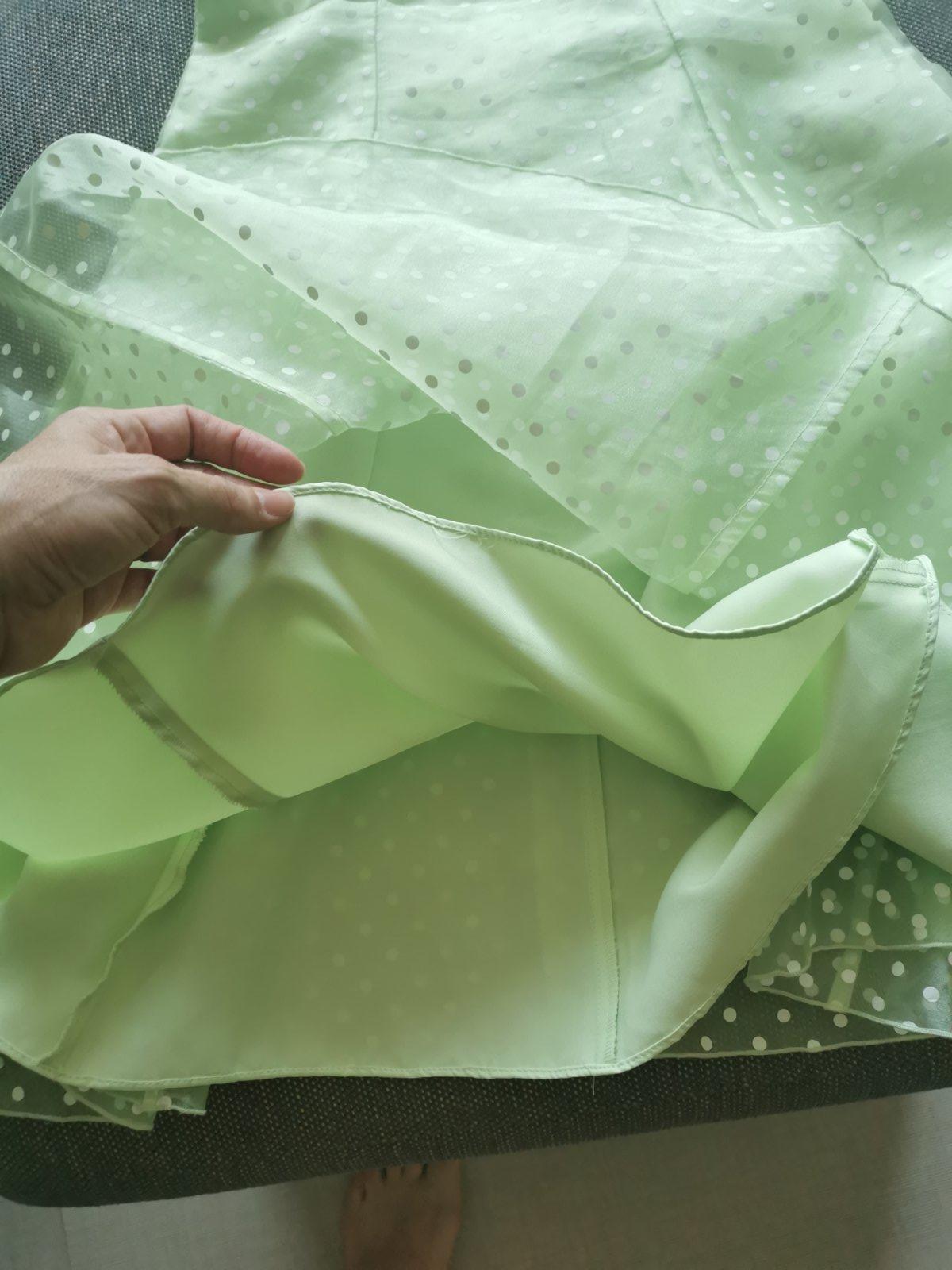 Nádherné šaty v krásnej farbe s kontrastným lemovaním, vzadu na zips. PC cez 80€. Veľkosť uvedená 10 (zodpovedá veľkosti 140/146), dĺžka predného dielu 90cm - s ramienkami 98cm, šírka cez hrudník 2x37cm, pás 2x33cm, cez boky 2x39cm. Malinkú chybičku majú, že vzadu na odševkoch sú trošku dieročky z natiahnutia látky(posledné 2 fotky), ale stačí to milimeter prešiť a bude to ok. Uhradím polovicu poštovného.