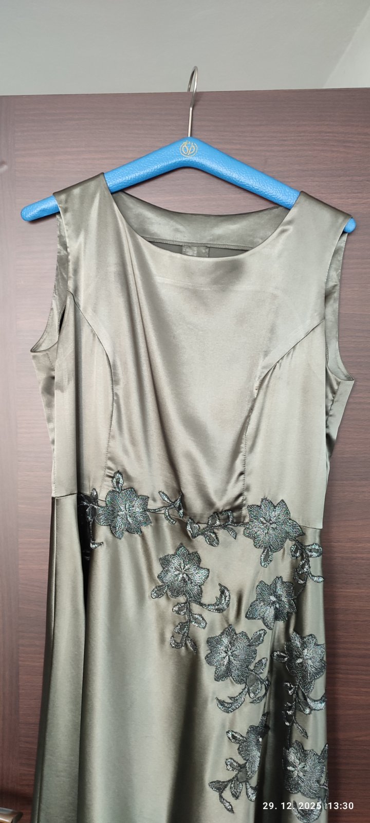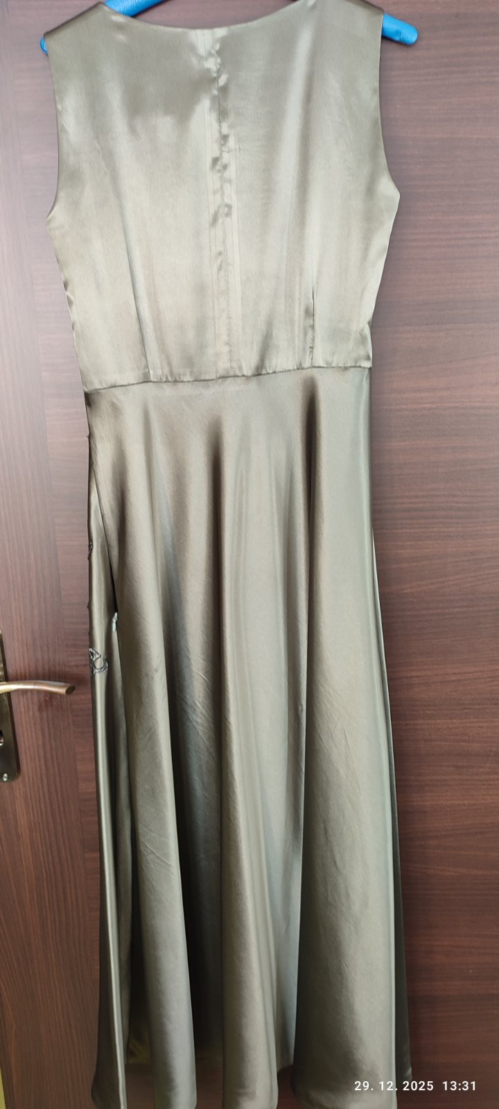 Spoločenské šaty, oceľová farba, na nižšiu postavu. Ručne šité aj s aplikáciami. Bez rukávov s čipkovaným bolerkom. Použité 2x. Dĺžka 145-146cm, prsia 2x48, pás 2x34, boky 2x60. Rukáv na bolerku 50cm. Majú drobné zašpinenie, treba dať vyčistiť.