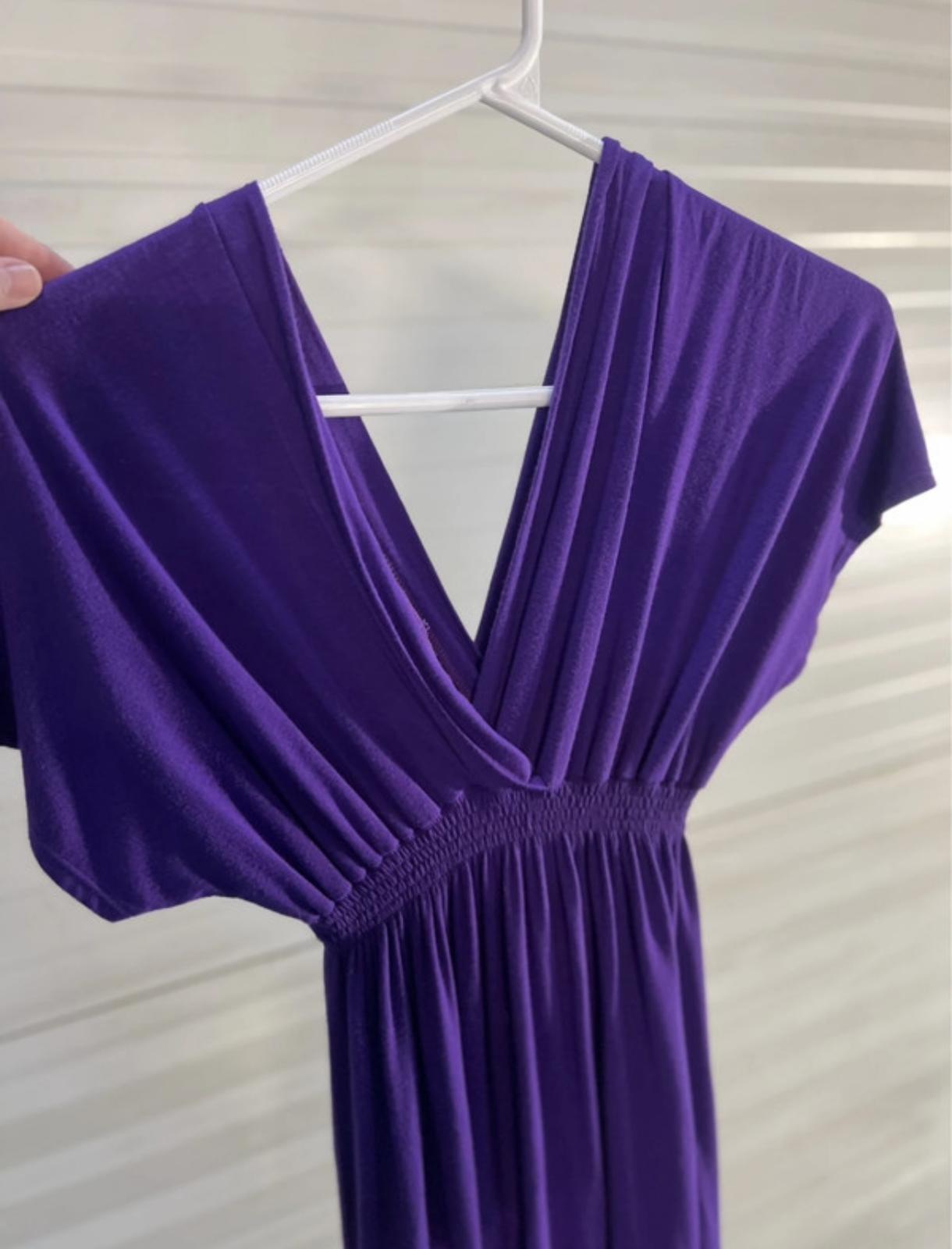 Fialovo čierne elastické šaty, na chrbte sa zapínajú na zips. Veľkosť M. Miery obvod cez prsia: 2x41-46cm obvod pásu: 2x40-46cm dĺžka: 90cm