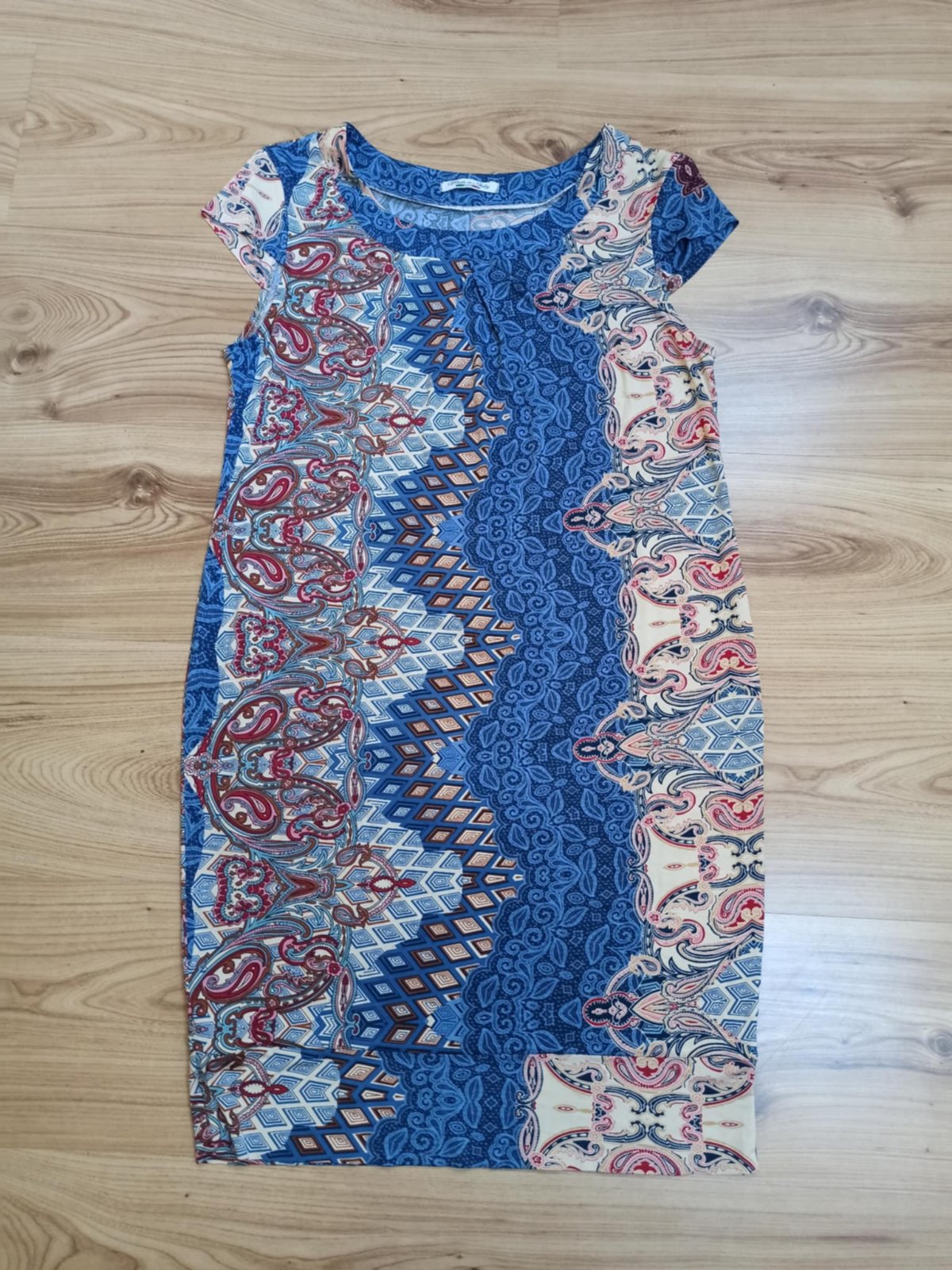 Dámske letné tenké šaty vzorované s krátkym rukávom. Elastická guma v páse. Výstrih do V. Farba biela,modrá,zlatá. Materiál: 100% viskóza. Veľkosť UNI ( vhodná pre S,M,L,XL). Krajina pôvodu: Talian...