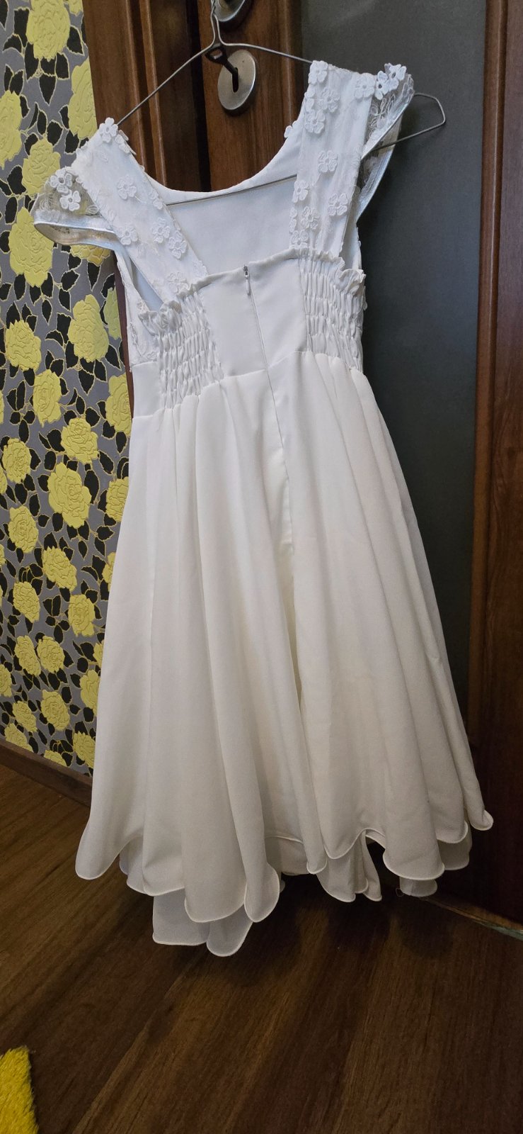 Predám biele šaty vhodné na svadbu alebo na Sväté prijímanie. Dcerka ich mala 2 x oblečené cca 2 hodiny. Su nepoškodené. Velkost cca od 122 do 140. Využite boli ked dcerka mala 10 rokov a výšku 134 cm. Vzadu je gumička tak su dosť prispôsobivé. Do súkromnej správy viem poprípade poslať foto dcérky, ked ich mala oblečené.