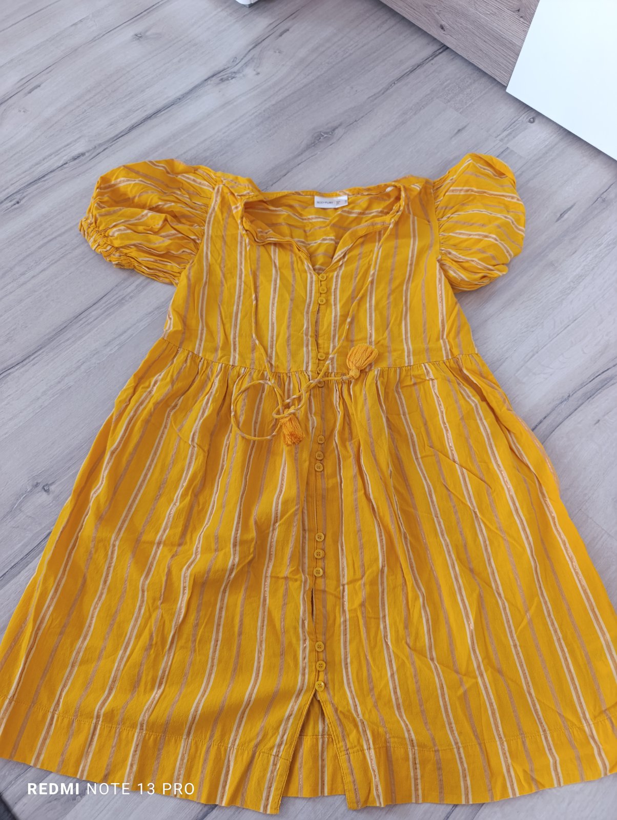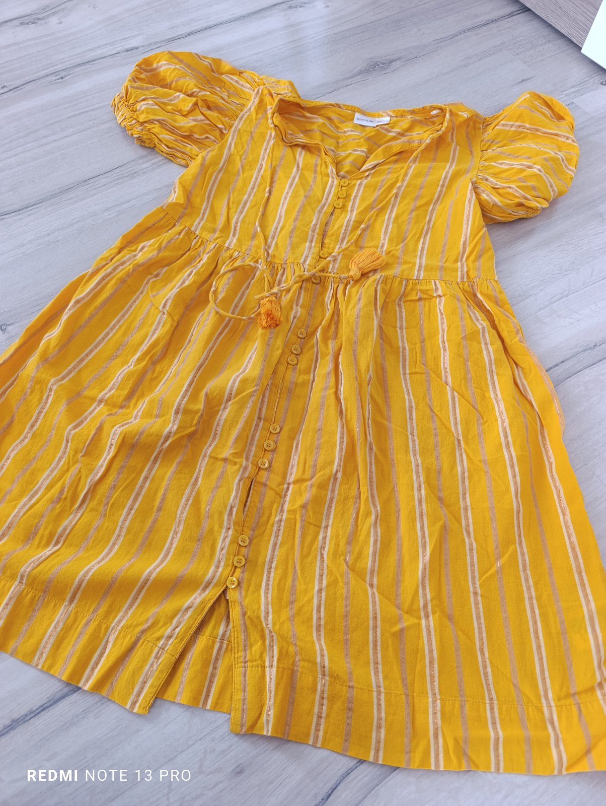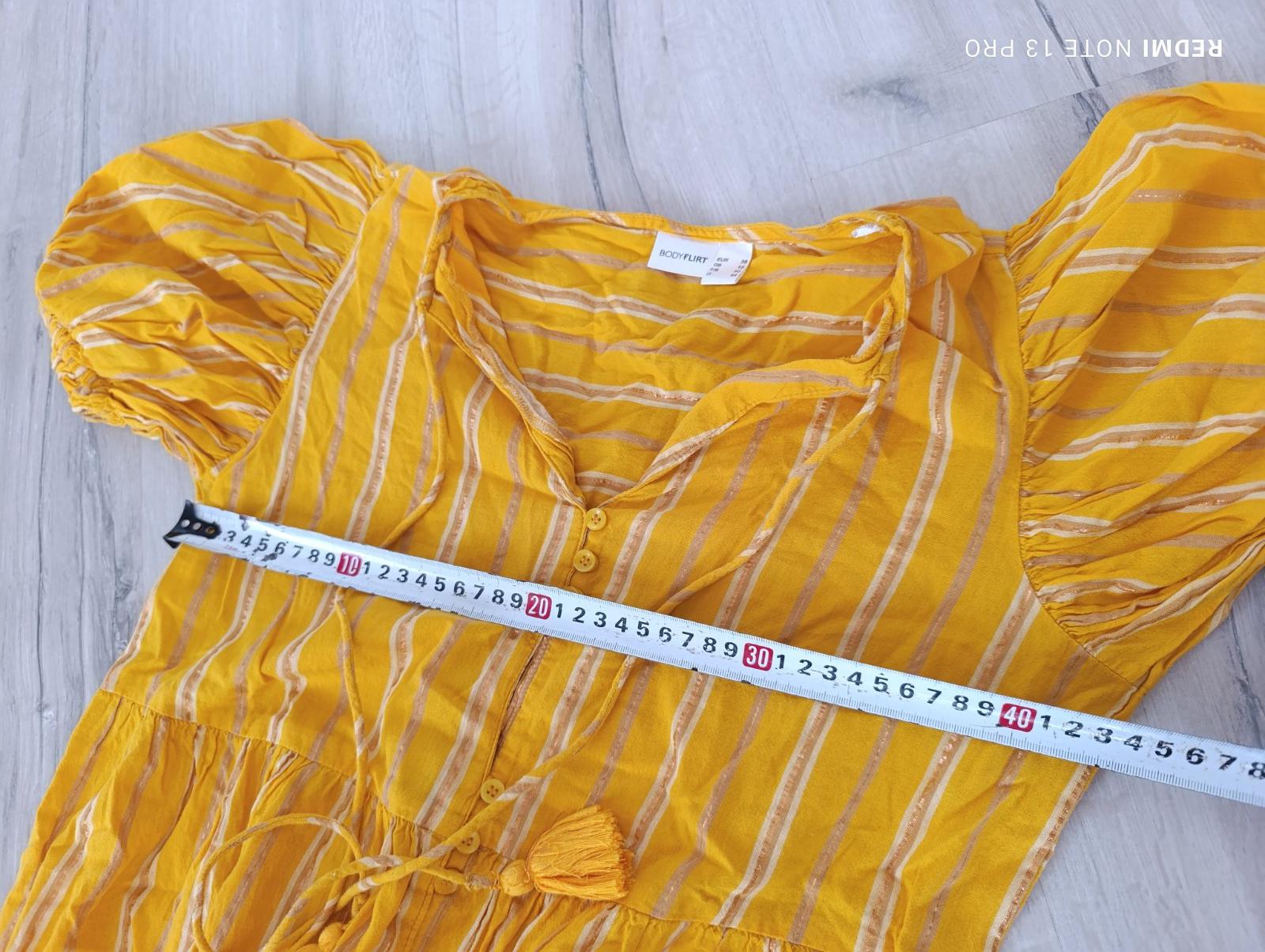 Pekné šaty, majú drobné gombíky, tenké prúžky sú pretkávané zlatou niťou, rukávy nazberkané, vo výstrihu majú ozdobnú šnúrku so strapcami... Sú v top stave, oblečené 2x ako nové. Pri výmene 6€