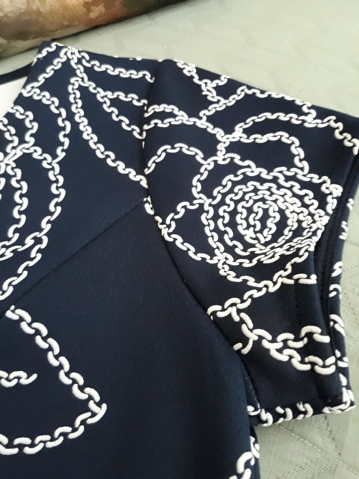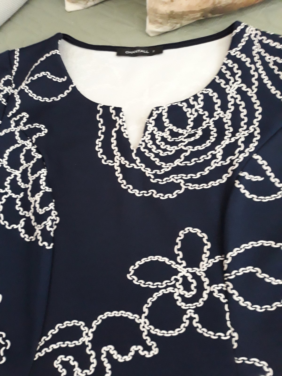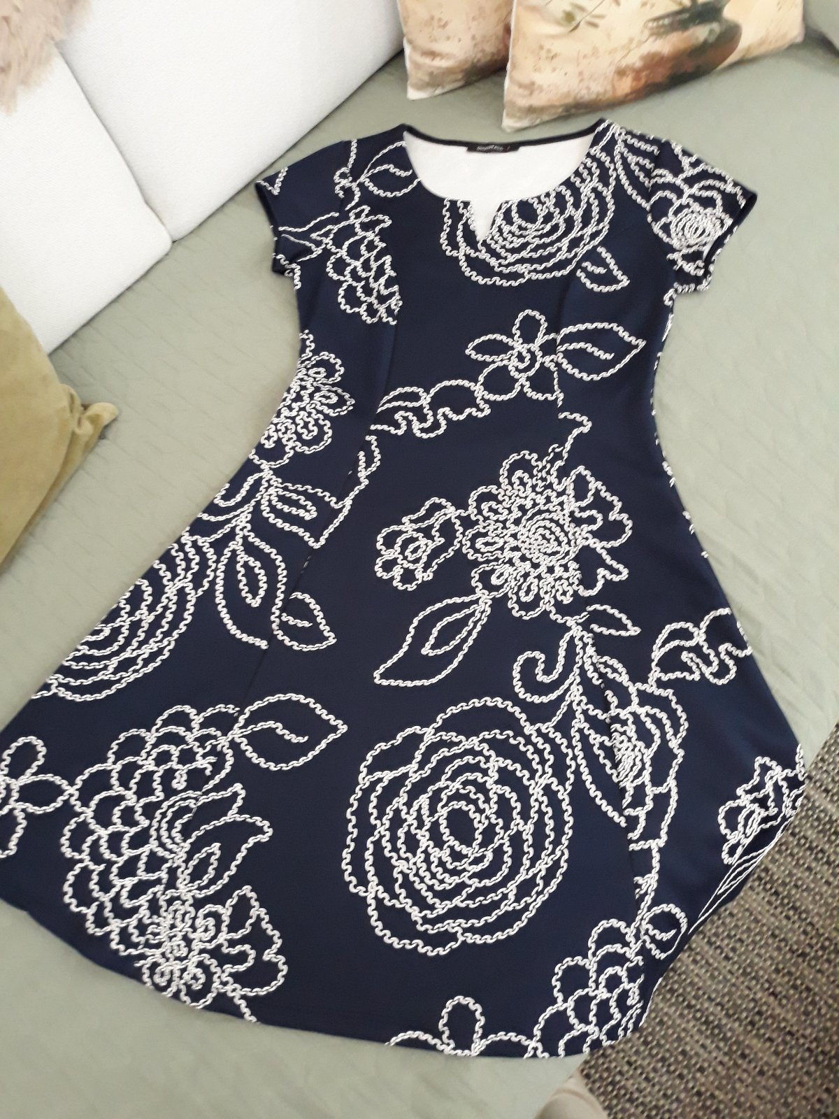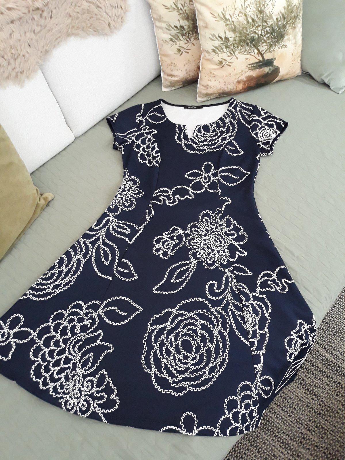 Na predaj nové, nenosené dámske elegantné šaty zn. Chantall, veľ. S. Veľmi príjemný, jemný lesklý materiál. Tmavomodrá farba s bielou výšivkou. Tvar do "A" dole mierne rozšírené. Vhodné na sviatočnú príležitosť, ale i bežné nosenie. Dĺžka šiat 92cm. Dĺžka rukávov 12cm.