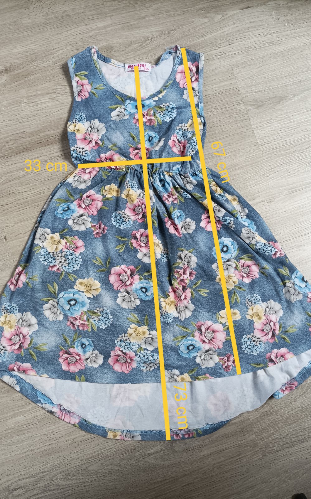 Krásne kvetinové dievčenské šaty. Rastú spolu s dieťaťom. V páse sa dajú natiahnuť, na fotke je rozmer natiahnutého pásu. Veľkosť 128-140.