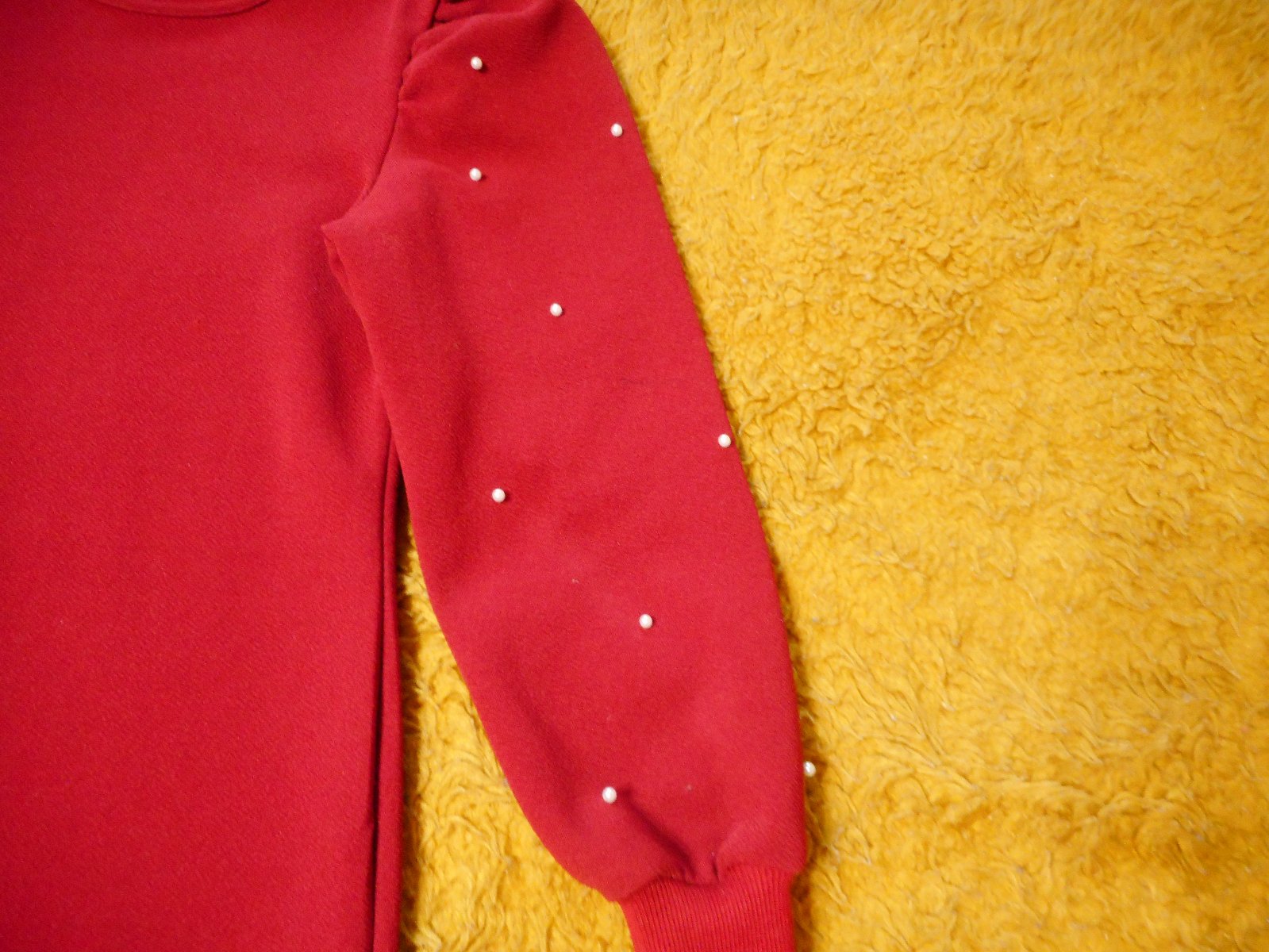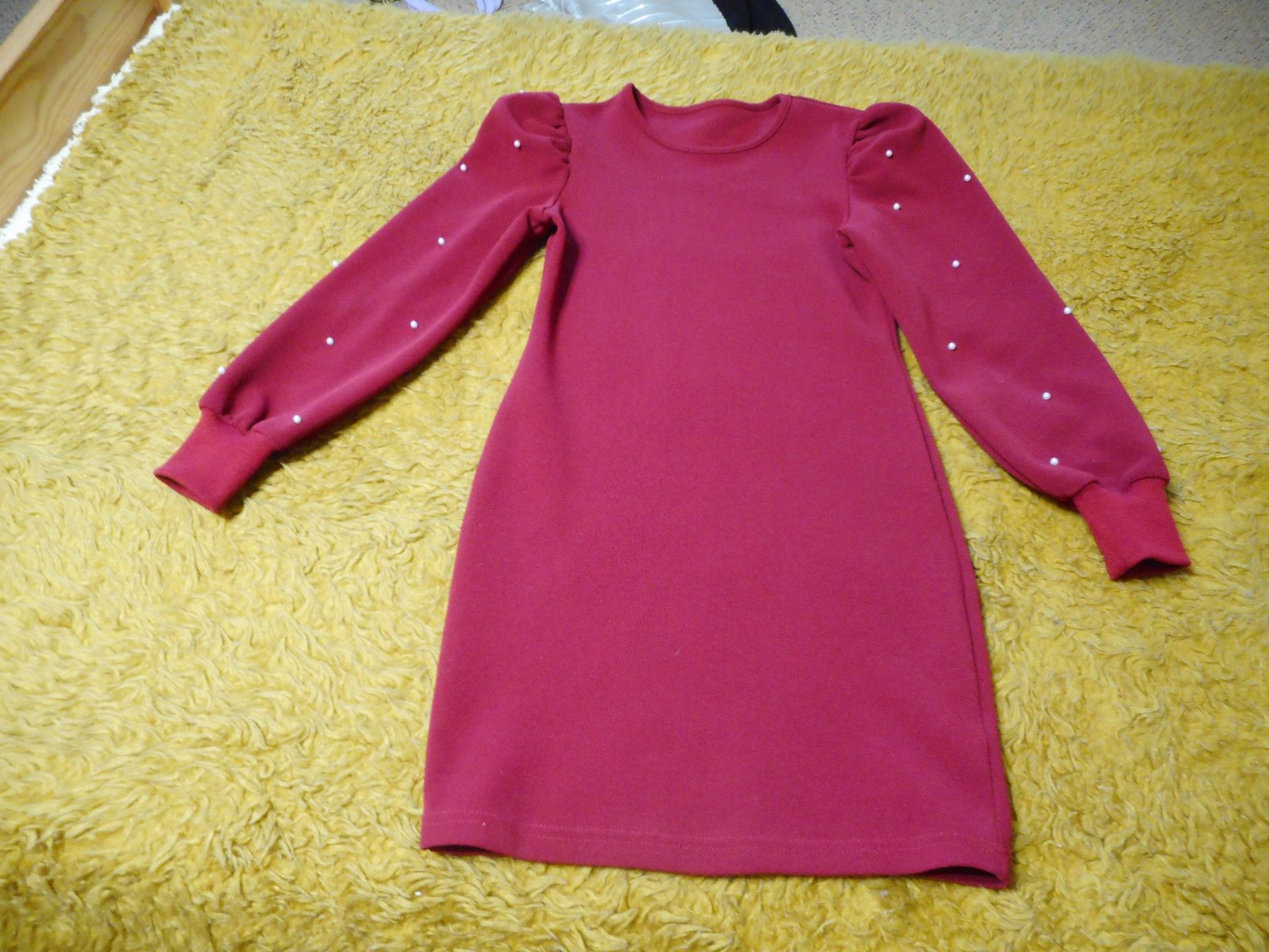 predám používané, nepoškodené dievčenské elastické šaty peknej bordovej farby s dlhým rukávom veľkosť cca 134cm, podľa výšky dievčatka s ozdobou guličiek na rukávoch, obliekanie cez krk, celková dĺžka šiat je 71cm, šírka pod pazuchami 34cm, vonkajšia dĺžka rukávu od šitia ramena až po patent je 51cm