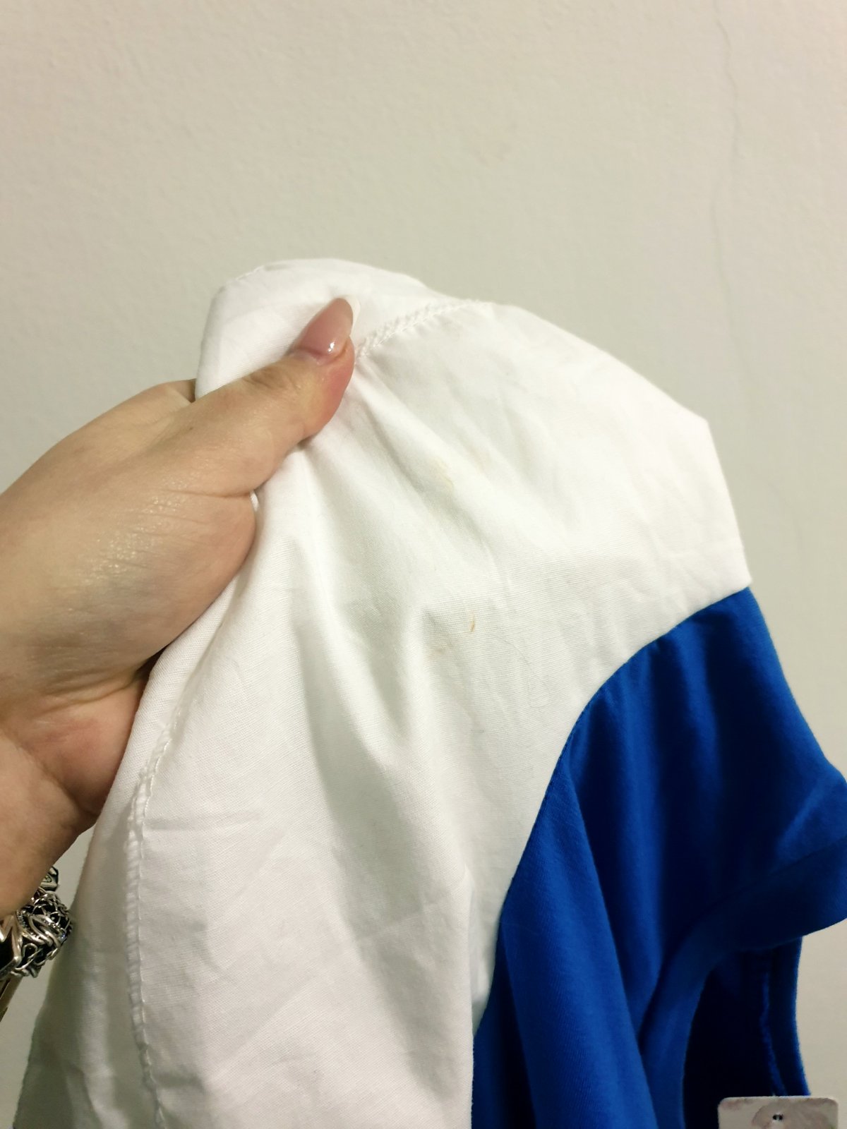 Veľkosť odhadom M. Bledunké fliačky na rukáve, pri nosení zanedbateľné.