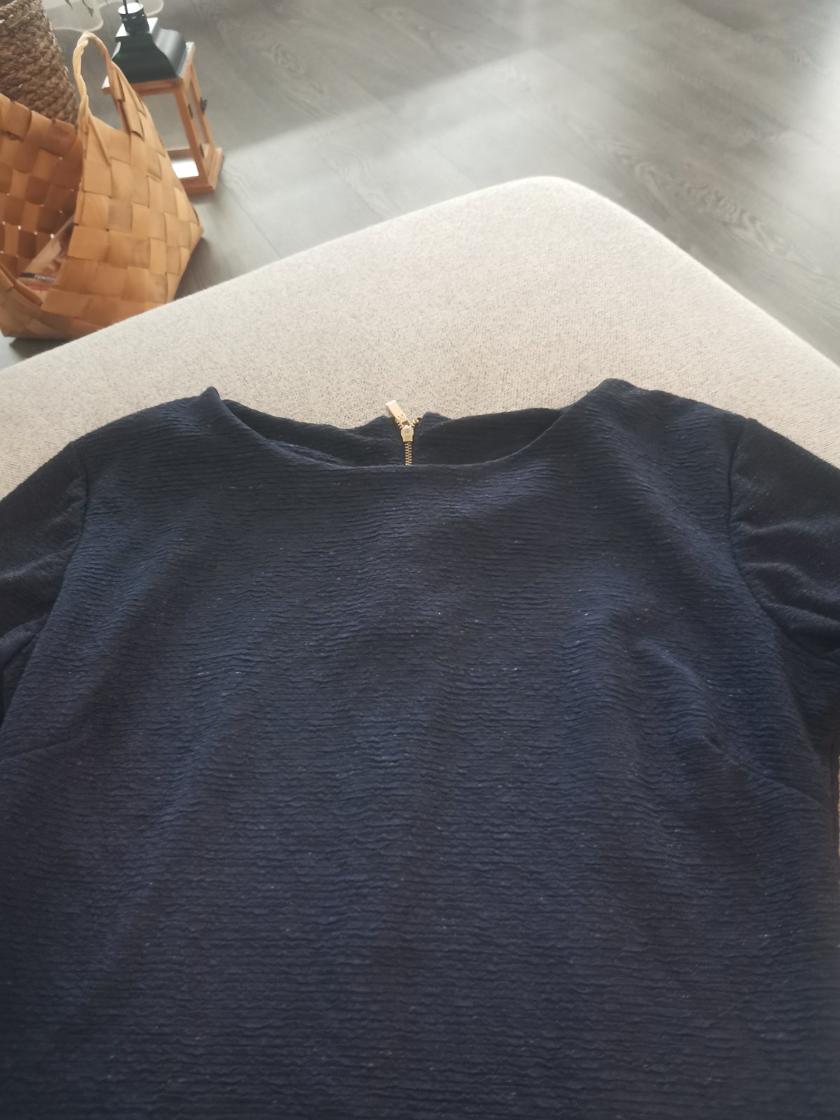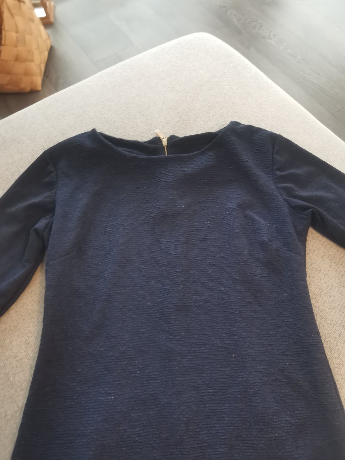 praktické, elastické šaty, vzadu je zips,....... celkova dlžka-89cm,, šírka cez prsia- 43-49cmx2,.. veľmi pekné :).rukávy su olemované akoby brúsenou kožou,