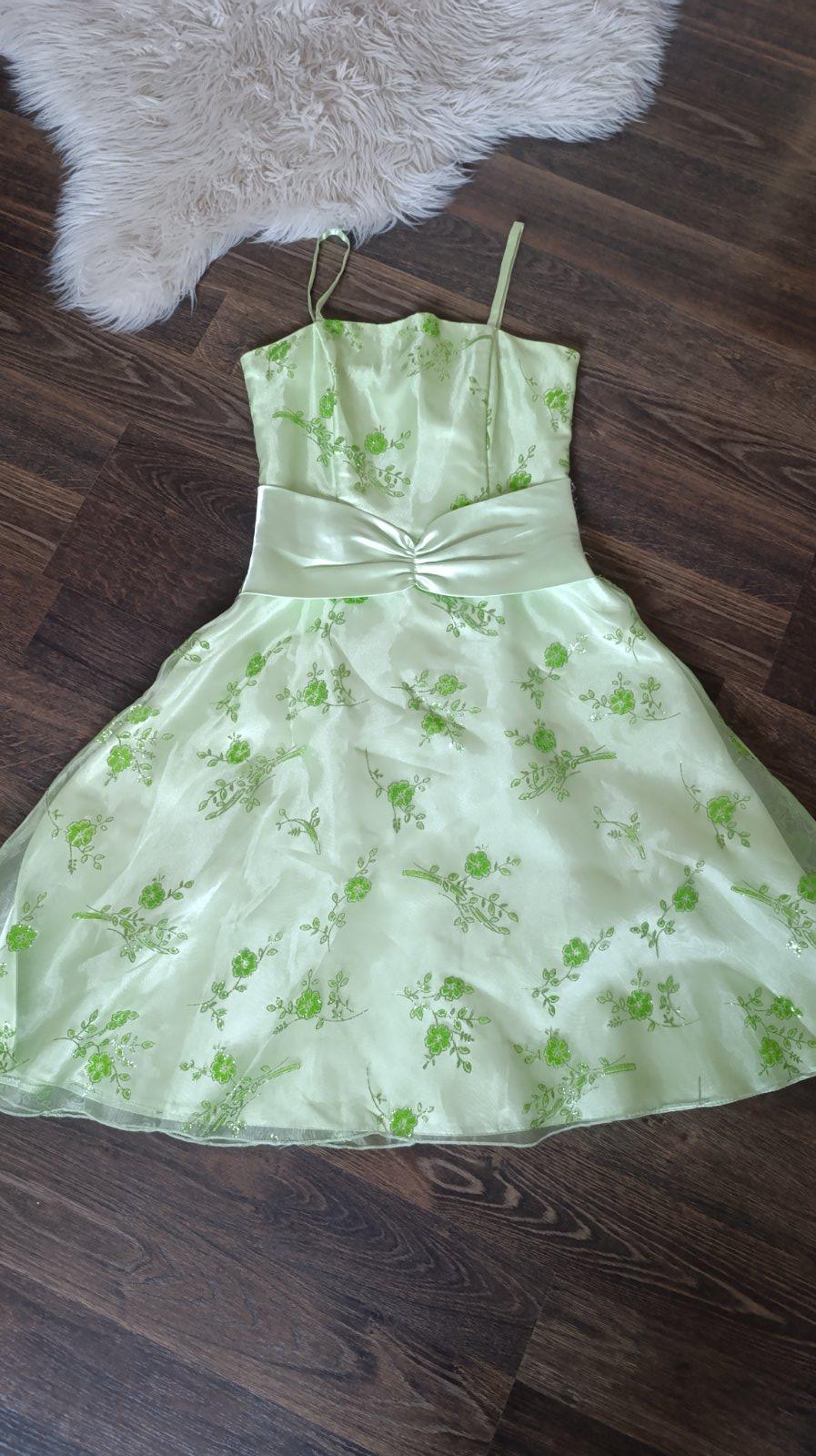 Predám spoločenské šaty aj s bolerkom 2krát oblečené. Majú zips+viazanie. Svietivej zelenej farby (foto skresluje,nie je taká bledá - farba realne ako na fotke z parketu).V eľkosť 36, Povodná cena 75 eur. Na šnúrkach na viazaní je vidieť použitie (nič hrozné)